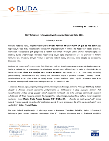 Grąbkowo, dn. 22.09.2011 FIAT Patronem Motoryzacyjnym konkursu Hodowca Roku 2011 Informacja prasowa Konkurs Hodowca Roku, organizowany przez Polski Koncern Mięsny DUDA SA juŜ po raz ósmy jest największym tego typu wydarzeniem branŜowym organizowanym w Polsce dla hodowców trzody chlewnej. Warunkiem uczestnictwa jest podpisanie z Polskim Koncernem Mięsnym DUDA umowy kontraktacyjnej na dostawy Ŝywca wieprzowego. Nowością tegorocznej edycji będą organizowane po raz pierwszy w historii konkursu tzw. Warsztaty Złotych Praktyk w zakresie hodowli trzody chlewnej, które odbędą się juŜ jesienią bieŜącego roku. Konkurs jak zawsze wieńczy uroczysta Gala Finałowa, podczas której rozlosowane zostaną atrakcyjne nagrody. Tradycją stało się juŜ, Ŝe główną nagrodę w konkursie stanowi samochód osobowy. W bieŜącej odsłonie konkursu będzie nim Fiat Linea 1,6 Multijet 16V 105KM Dynamic, wyposaŜony m.in. w: klimatyzację manualną jednostrefową, radioodtwarzacz CD, elektrycznie sterowane szyby i przednie lusterka, centralny zamek, przyciemniane szyby tylne, roletę na tylnej szybie, system Blue&Me, tylne czujniki parkowania oraz koło zapasowe. Nowego właściciela samochodu poznamy juŜ 3 lutego 2012 roku. - Hodowca Roku to najwaŜniejsze przedsięwzięcie marketingowe Polskiego Koncernu Mięsnego DUDA SA, dlatego decyzje o doborze nowych sponsorów podejmowane są kaŜdorazowo z duŜą rozwagą. Koncern Fiat konsekwentnie buduje swoją pozycję wśród środowisk rolniczych, nie tylko oferując samochody osobowe i dostawcze, ale takŜe maszyny rolnicze. To przesądziło o wyborze tego producenta na patrona motoryzacyjnego konkursu.– mówi Maciej Duda Prezes Zarządu PKM DUDA SA. –– Ponadto ze swoją ponad 100 –letnią historią i mocną pozycją na rynku, Fiat znakomicie spełnia kryteria sponsorów. Na takich partnerach zaleŜy nam najbardziej - dodaje Maciej Duda. Fiat Auto Poland współpracuje od dłuŜszego czasu z Krajowym Związkiem Rolników, Kółek i Organizacji Rolniczych. jako partner programu rabatowego "Linia R". Program skierowany jest do środowisk wiejskich zrzeszonych w KZRKiOR. Klienci, w ramach Linii R, mogą zakupić samochody z gamy samochodów osobowych i dostawczych marki Fiat na preferencyjnych warunkach. Fiat Linea – który stanowi główną nagrodę w konkursie, w oryginalny sposób łączy styl, funkcjonalność i przyjemność jazdy. WyróŜnia się czystą i elegancką linią. Silniki wyróŜniają się osiągami i wyrafinowaną technologią. Dzięki regulacji siedzenia kierowcy oraz kierownicy (wysokość i głębokość), na przednich fotelach osiągnięto doskonałe efekty pod względem przestronności oraz idealnej pozycji do jazdy (wysokość kierowców moŜe wynosić od 1,50 do około 2 metrów). Wszystko to bez wpływu na pojemność bagaŜnika, osiągającego aŜ 500 litrów w normalnej konfiguracji (naleŜy do najbardziej pojemnych w swojej kategorii). Jeśli przestrzeń jest nadal niewystarczająca, wystarczy całkowicie opuścić tylną kanapę, aby mieć do dyspozycji nadzwyczajną przestrzeń ładunkową: 1175 litrów do linii dachu. Pozostałymi patronami tegorocznej edycji konkursu Hodowca Roku są największe firmy branŜy hodowlanej. Czwarty rok z rzędu Złotym Partnerem konkursu jest firma Wytwórnia Pasz LIRA. Srebrnymi Partnerami są: Pen Ar LAN Polska (dostawca materiału genetycznego do producentów trzody chlewnej), PPH Polnet (specjalizujący się w kompleksowym projektowaniu i wyposaŜaniu obiektów inwentarskich dla trzody chlewnej), Biomin Polska (dodatki paszowe) oraz De Heus Polska (producent pasz), który jest jednocześnie Patronem Gali finałowej. Patronat Medialny drugi rok z rzędu objęła redakcja dwumiesięcznika „Hoduj z Głową”. Szczegóły programu oraz jego regulamin moŜna znaleźć na stronie www.hodowcaroku.pl. Więcej informacji Daniel Ratajczak Dyrektor Marketingu PKM DUDA [email protected]