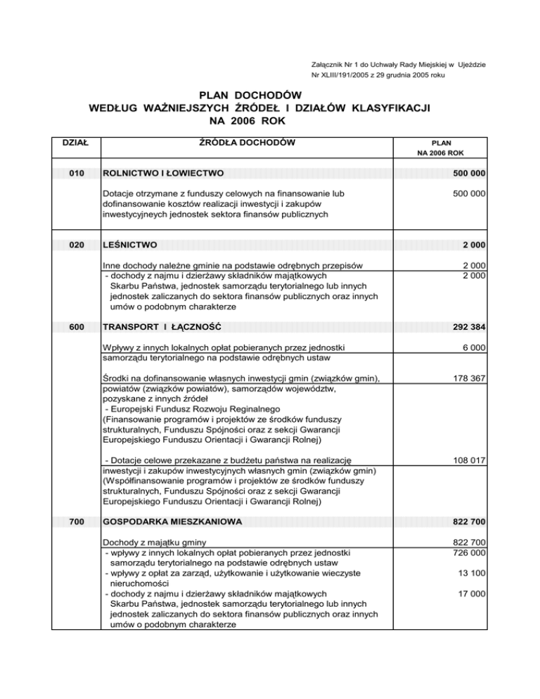 Załącznik Nr 1 do Uchwały Rady Miejskiej w Ujeździe Nr XLIII/191/2005 z 29 grudnia 2005 roku PLAN DOCHODÓW WEDŁUG WAśNIEJSZYCH ŹRÓDEŁ I DZIAŁÓW KLASYFIKACJI NA 2006 ROK DZIAŁ ŹRÓDŁA DOCHODÓW PLAN NA 2006 ROK 010 020 600 ROLNICTWO I ŁOWIECTWO 500 000 Dotacje otrzymane z funduszy celowych na finansowanie lub dofinansowanie kosztów realizacji inwestycji i zakupów inwestycyjneych jednostek sektora finansów publicznych 500 000 LEŚNICTWO 2 000 Inne dochody naleŜne gminie na podstawie odrębnych przepisów - dochody z najmu i dzierŜawy składników majątkowych Skarbu Państwa, jednostek samorządu terytorialnego lub innych jednostek zaliczanych do sektora finansów publicznych oraz innych umów o podobnym charakterze 2 000 2 000 TRANSPORT I ŁĄCZNOŚĆ Wpływy z innych lokalnych opłat pobieranych przez jednostki samorządu terytorialnego na podstawie odrębnych ustaw 700 292 384 6 000 Środki na dofinansowanie własnych inwestycji gmin (związków gmin), powiatów (związków powiatów), samorządów województw, pozyskane z innych źródeł - Europejski Fundusz Rozwoju Reginalnego (Finansowanie programów i projektów ze środków funduszy strukturalnych, Funduszu Spójności oraz z sekcji Gwarancji Europejskiego Funduszu Orientacji i Gwarancji Rolnej) 178 367 - Dotacje celowe przekazane z budŜetu państwa na realizację inwestycji i zakupów inwestycyjnych własnych gmin (związków gmin) (Współfinansowanie programów i projektów ze środków funduszy strukturalnych, Funduszu Spójności oraz z sekcji Gwarancji Europejskiego Funduszu Orientacji i Gwarancji Rolnej) 108 017 GOSPODARKA MIESZKANIOWA 822 700 Dochody z majątku gminy - wpływy z innych lokalnych opłat pobieranych przez jednostki samorządu terytorialnego na podstawie odrębnych ustaw - wpływy z opłat za zarząd, uŜytkowanie i uŜytkowanie wieczyste nieruchomości - dochody z najmu i dzierŜawy składników majątkowych Skarbu Państwa, jednostek samorządu terytorialnego lub innych jednostek zaliczanych do sektora finansów publicznych oraz innych umów o podobnym charakterze 822 700 726 000 13 100 17 000 DZIAŁ ŹRÓDŁA DOCHODÓW PLAN NA 2006 ROK 750 - wpływy z tytułu przekształcenia prawa uŜytkowania wieczystego przysługującego osobom fizycznym w prawo własności - wpływy ze sprzedaŜy składników majątkowych - odsetki od nieterminowych wpłat z tytułu podatków i opłat - pozostałe odsetki - wpływy z róŜnych dochodów 11 000 ADMINISTRACJA PUBLICZNA 86 405 Inne dochody naleŜne gminie na podstawie odrębnych przepisów - dochody z najmu i dzierŜawy składników majątkowych Skarbu Państwa, jednostek samorządu terytorialnego lub innych jednostek zaliczanych do sektora finansów publicznych oraz innych umów o podobnym charakterze 754 7 000 7 000 Dotacje celowe otrzymane z budŜetu państwa na realizację zadań bieŜących z zakresu administracji rządowej oraz innych zadań zleconych gminie ( związkom gmin ) ustawami 73 960 Dotacje celowe otrzymane z budŜetu państwa na zadania bieŜące realizowane przez gminę na podstawie porozumień z organami administracji rządowej 4 535 Dochody jednostek samorządu terytorialnego związane z realizacją zadań z zakresu administracji rządowej oraz innych zadań zleconych ustawami 751 50 000 100 2 000 3 500 910 URZĘDY NCZELNYCH ORGANÓW WŁADZY PAŃSTWOWEJ, KONTROLI I OCHRONY PRAWA ORAZ SĄDOWNICTWA 1 004 Dotacje celowe otrzymane z budŜetu państwa na realizację zadań bieŜących z zakresu administracji rządowej oraz innych zadań zleconych gminie ( związkom gmin ) ustawami 1 004 BEZPIECZEŃSTWO PUBLICZNNE I OCHRONA PRZECIWPOśAROWA 1 840 Inne dochody naleŜne gminie na podstawie odrębnych przepisów - dochody z najmu i dzierŜawy składników majątkowych Skarbu Państwa, jednostek samorządu terytorialnego lub innych jednostek zaliczanych do sektora finansów publicznych oraz innych umów o podobnym charakterze Dotacje celowe otrzymane z budŜetu państwa na realizację zadań bieŜących z zakresu administracji rządowej oraz innych zadań zleconych gminie ( związkom gmin ) ustawami 840 840 1 000 DZIAŁ ŹRÓDŁA DOCHODÓW PLAN NA 2006 ROK 756 DOCHODY OD OSÓB PRAWNYCH, OD OSÓB FIZYCZNYCH I OD INNYCH JEDNOSTEK NIEPOSIADAJĄCYCH OSOBOWOŚCI PRAWNEJ ORAZ WYDATKI ZWIĄZANE Z ICH POBOREM 2 756 203 Wpływy z podatków - podatek dochodowy od osób fizycznych - podatek dochodowy od osób prawnych - podatek od działalności gospodarczej osób fizycznych, opłacany w formie karty podatkowej - podatek od nieruchomości - podatek rolny - podatek leśny - podatek od środków transportowych - podatek od spadków i darowizn - podatek od posiadania psów - podatek od czynności cywilnoprawnych - odsetki od nieterminowych wpłat z tytułu podatków i opłat 2 718 203 1 214 603 20 000 30 000 Wpływy z opłat - wpływy z opłaty skarbowej - wpływy z opłaty targowej - wpływy z opłaty administracyjnej za czynności urzędowe - wpływy z innych opłat pobieranych przez jednostki samorządu terytorialnego na podstawie odrębnych ustaw - wpływy z róŜnych opłat 758 851 38 000 25 000 6 000 2 000 3 000 2 000 RÓśNE ROZLICZENIA 5 936 623 Subwencja ogólna - część oświatowa - część wyrównawcza, z tego: - kwota podstawowa - kwota uzupełniająca 5 636 623 3 960 015 1 676 608 1 356 569 320 039 Odsetki od środków finansowych gromadzonych na rachunkach bankowych 801 897 000 360 000 21 500 116 500 5 000 100 50 000 3 500 300 000 OŚWIATA I WYCHOWANIE 96 825 Dochody uzyskiwane przez gminne jednostki budŜetowe gminy - dochody z najmu i dzierŜawy składników majątkowych Skarbu Państwa, jednostek samorządu terytorialnego lub innych jednostek zaliczanych do sektora finansów publicznych oraz innych umów o podobnym charakterze - dochody z usług 96 825 32 603 64 222 OCHRONA ZDROWIA 70 000 Dochody uzyskiwane przez gminne jednostki budŜetowe gminy - wpływy z opłat za zezwolenia na sprzedaŜ alkoholu 70 000 70 000 DZIAŁ ŹRÓDŁA DOC