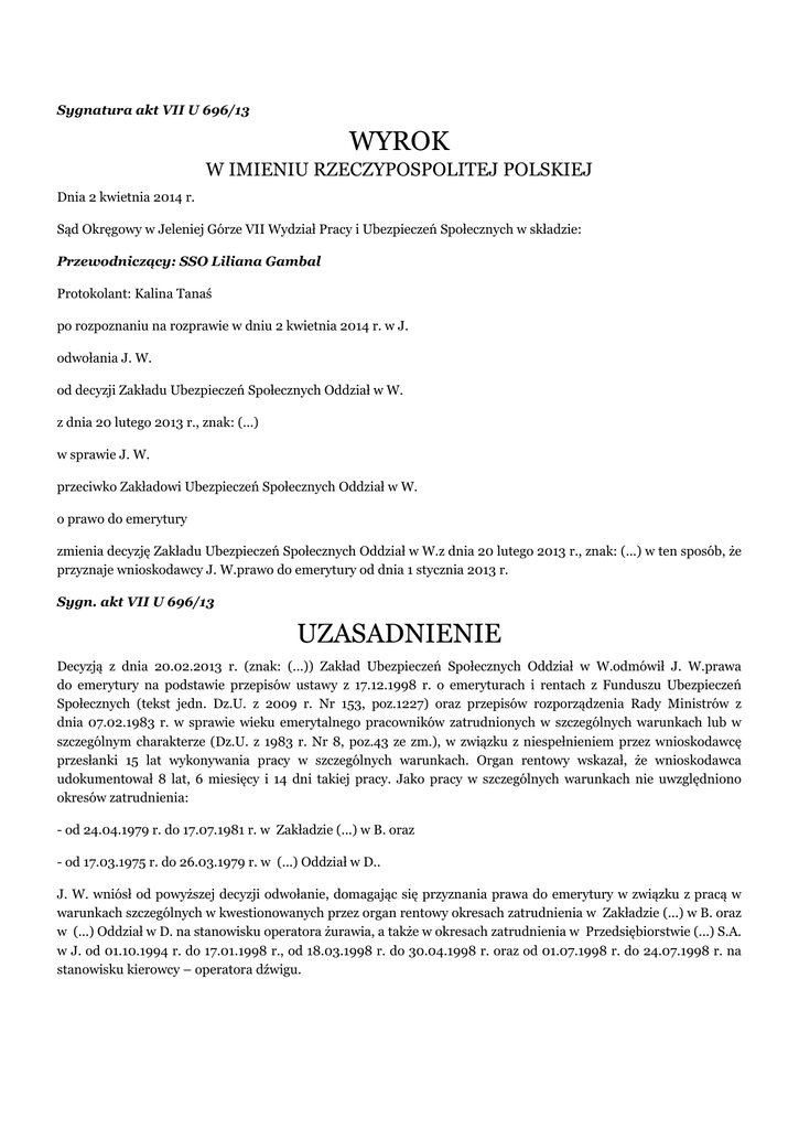 Sygnatura akt VII U 696/13 WYROK W IMIENIU RZECZYPOSPOLITEJ POLSKIEJ Dnia 2 kwietnia 2014 r. Sąd Okręgowy w Jeleniej Górze VII Wydział Pracy i Ubezpieczeń Społecznych w składzie: Przewodniczący: SSO Liliana Gambal Protokolant: Kalina Tanaś po rozpoznaniu na rozprawie w dniu 2 kwietnia 2014 r. w J. odwołania J. W. od decyzji Zakładu Ubezpieczeń Społecznych Oddział w W. z dnia 20 lutego 2013 r., znak: (...) w sprawie J. W. przeciwko Zakładowi Ubezpieczeń Społecznych Oddział w W. o prawo do emerytury zmienia decyzję Zakładu Ubezpieczeń Społecznych Oddział w W.z dnia 20 lutego 2013 r., znak: (...) w ten sposób, że przyznaje wnioskodawcy J. W.prawo do emerytury od dnia 1 stycznia 2013 r. Sygn. akt VII U 696/13 UZASADNIENIE Decyzją z dnia 20.02.2013 r. (znak: (...)) Zakład Ubezpieczeń Społecznych Oddział w W.odmówił J. W.prawa do emerytury na podstawie przepisów ustawy z 17.12.1998 r. o emeryturach i rentach z Funduszu Ubezpieczeń Społecznych (tekst jedn. Dz.U. z 2009 r. Nr 153, poz.1227) oraz przepisów rozporządzenia Rady Ministrów z dnia 07.02.1983 r. w sprawie wieku emerytalnego pracowników zatrudnionych w szczególnych warunkach lub w szczególnym charakterze (Dz.U. z 1983 r. Nr 8, poz.43 ze zm.), w związku z niespełnieniem przez wnioskodawcę przesłanki 15 lat wykonywania pracy w szczególnych warunkach. Organ rentowy wskazał, że wnioskodawca udokumentował 8 lat, 6 miesięcy i 14 dni takiej pracy. Jako pracy w szczególnych warunkach nie uwzględniono okresów zatrudnienia: - od 24.04.1979 r. do 17.07.1981 r. w Zakładzie (...) w B. oraz - od 17.03.1975 r. do 26.03.1979 r. w (...) Oddział w D.. J. W. wniósł od powyższej decyzji odwołanie, domagając się przyznania prawa do emerytury w związku z pracą w warunkach szczególnych w kwestionowanych przez organ rentowy okresach zatrudnienia w Zakładzie (...) w B. oraz w (...) Oddział w D. na stanowisku operatora żurawia, a także w okresach zatrudnienia w Przedsiębiorstwie (...) S.A. w J. od 01.10.1994 r. do 17.01.1998 r., od 18.03.1998 r. do 30.04.1998 r. oraz od 01.07.1998 r. do 24.07.1998 r. na stanowisku kierowcy – operatora dźwigu. W odpowiedzi na odwołanie Zakład Ubezpieczeń Społecznych Oddział w W. wniósł o jego oddalenie, argumentując jak w zaskarżonej decyzji. Sąd ustalił następujący stan faktyczny: J. W., urodzony (...) był m. in. zatrudniony w: • (...) Oddział w D. w okresie od 17.03.1975 r. do 26.03.1979 r., w tym: od 17.03.1975 r. do 07.12.1975 r. na stanowisku pomocnika operatora, od 08.12.1975 r. do 21.12.1978 r. na stanowisku operatora żurawia samojezdnego i od 22.12.1978 r. do 26.03.1979 r. na stanowisku kierowcy kolumny; • Zakładzie (...) w B. w okresie od 24.04.1979 r. do 17.07.1981 r. na stanowisku operatora żurawia; • Przedsiębiorstwie (...) S.A. w J. od 01.10.1994 r. do 10.07.1995 r., od 26.07.1995 r. do 17.01.1998 r. oraz od 18.03.1998 r. do 24.07.1998 r. na stanowisku kierowcy – operatora dźwigu. Wnioskodawca w dniu 06.12.1975 r. nabył uprawnienia do obsługi ciężkich maszyn budowlanych i drogowych i od dnia 08.12.1975 r., w powyższych okresach zatrudnienia stale i w pełnym wymiarze czasu pracy pracował jako maszynista ciężkich maszyn budowlanych, pracując na budowach bądź – podczas zatrudnienia w Przedsiębiorstwie (...) – przy budowie rurociągów. Jako kierowca w okresie zatrudnienia w (...) wnioskodawca był kierowcą samochodu ciężarowego o dopuszczalnym ciężarze całkowitym powyżej 3,5 tony, prowadząc betonowóz. /dowód: świadectwa pracy z dnia: 27.03.1979 r., 29.07.1981 r. oraz za okresy zatrudnienia w (...) S.A. – k.16, 17, 23-33 akt emerytalnych; akta osobowe z okresu zatrudnienia w (...), w tym: odpis uprawnień z 07.12.1975 r. (k.3), wniosek o przeniesienie (k.11), angaże (k.12, 13); akta osobowe z okresu zatrudnienia w (...) w B., w tym: umowa o pracę (k.3), karty obiegowe; akta osobowe z okresu zatrudnienia w (...), w tym: umowy o pracę; zeznania wnioskodawcy – e-protokół z 16.09.2013 r. 00:08:48 i dalej oraz z 02.04.2014 r. 00:09:30 i dalej; zeznania J. K. – e-protokół z 16.09.2013 r. 00:21:50 i dalej; zeznania R. K. – e-protokół z 16.09.2013 r. 00:33:10 i dalej; zeznania A. Ż. – e-protokół z 02.04.2014 r. 00:02:40 i dalej/ W dniu 23.01.2013 r. J. W. złożył wniosek o emeryturę, który decyzją z dnia 20.02.2013 r. został rozpoznany odmownie, w związku z niespełnieniem przez wnioskodawcę przesłanki 15 lat wykonywania pracy w szczególnych warunkach. /dowód: wniosek z dnia 23.01.2013 r. – k.1 akt emerytalnych; decyzja z dnia 20.02.2013 r. – k.80 akt emerytalnych/ Wnioskodawca przystąpił do OFE, jednak wniósł o przekazanie środków zgromadzonych na rachunku w OFE na dochody budżetu państwa. Na dzień 01.01.1999 r. udokumentował ponad 25-letni łączny okres składkowy i nieskładkowy. /bezsporne/ Sąd zważył, co następuje: Odwołanie wnioskodawcy zasługiwało na uwzględnienie. Zgodnie z art.184 ustawy z dnia 17.12.1998 r. o emeryturach i rentach z Funduszu Ubezpieczeń Społecznych (Dz. U. z 2009 r. Nr 153, poz.1227 ze zm.) w zw. z § 4 rozporządzenia Rady Ministrów z dnia 07.02.1983 r. w sprawie wieku emerytalnego pracowników zatrudnionych w szczególnych warunkach lub w szczególnym charakterze (Dz. U. z 1983 r. Nr 8, poz. 43 ze zm.), ubezpieczonemu urodzonemu po dniu 31.12.1948 r. przysługuje emerytura, jeżeli spełnił warunki: - osiągnął wiek emerytalny wynoszący 60 lat, dla mężczyzn, - nie przystąpił do otwartego funduszu emerytalnego albo złożył wniosek o przekazanie środków zgromadzonych na rachunku w otwartym funduszu emerytalnym, za pośrednictwem Zakładu, na dochody budżetu państwa, - w dniu 01.01.1999 r. osiągnął okres składkowy i nieskładkowy wynoszący 25 lat dla mężczyzn, w tym okres zatrudnienia w szczególnych warunkach lub w szczególnym charakterze, wykonywanego stale i w pełnym wymiarze czasu pracy, obowi