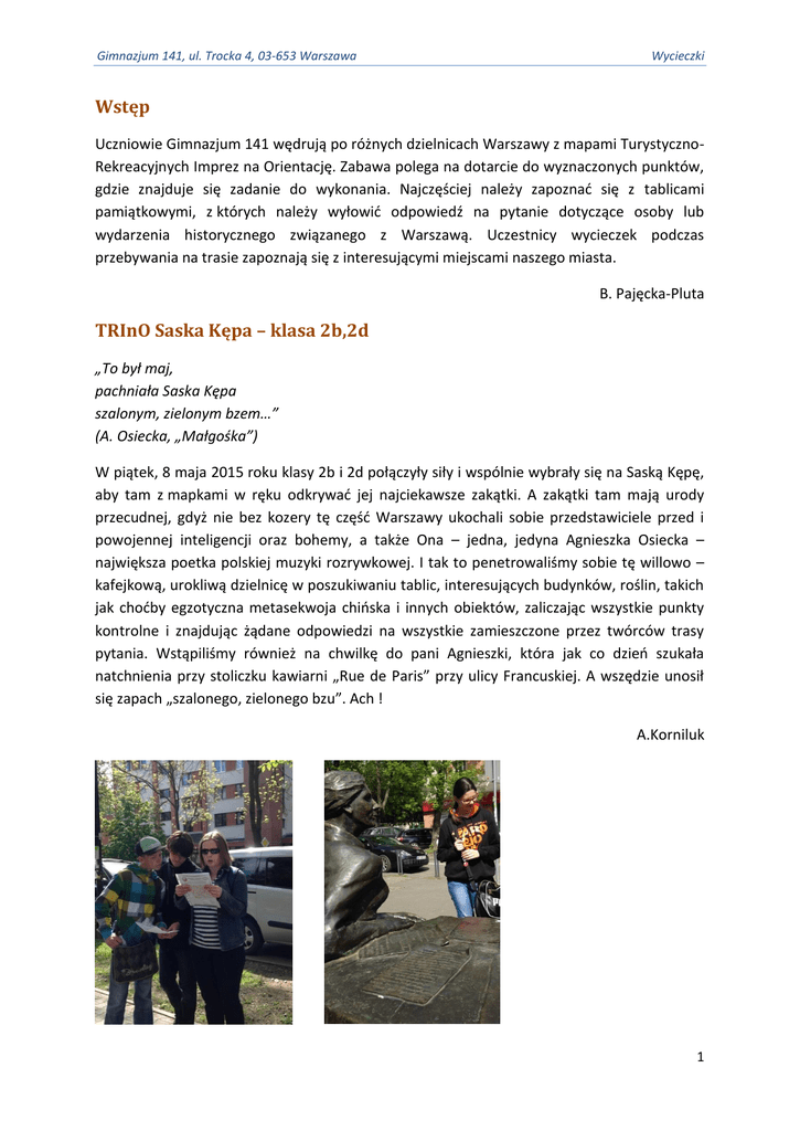 Gimnazjum 141, ul. Trocka 4, 03-653 Warszawa Wycieczki Wstęp Uczniowie Gimnazjum 141 wędrują po różnych dzielnicach Warszawy z mapami TurystycznoRekreacyjnych Imprez na Orientację. Zabawa polega na dotarcie do wyznaczonych punktów, gdzie znajduje się zadanie do wykonania. Najczęściej należy zapoznać się z tablicami pamiątkowymi, z których należy wyłowić odpowiedź na pytanie dotyczące osoby lub wydarzenia historycznego związanego z Warszawą. Uczestnicy wycieczek podczas przebywania na trasie zapoznają się z interesującymi miejscami naszego miasta. B. Pajęcka-Pluta TRInO Saska Kępa – klasa 2b,2d „To był maj, pachniała Saska Kępa szalonym, zielonym bzem…” (A. Osiecka, „Małgośka”) W piątek, 8 maja 2015 roku klasy 2b i 2d połączyły siły i wspólnie wybrały się na Saską Kępę, aby tam z mapkami w ręku odkrywać jej najciekawsze zakątki. A zakątki tam mają urody przecudnej, gdyż nie bez kozery tę część Warszawy ukochali sobie przedstawiciele przed i powojennej inteligencji oraz bohemy, a także Ona – jedna, jedyna Agnieszka Osiecka – największa poetka polskiej muzyki rozrywkowej. I tak to penetrowaliśmy sobie tę willowo – kafejkową, urokliwą dzielnicę w poszukiwaniu tablic, interesujących budynków, roślin, takich jak choćby egzotyczna metasekwoja chińska i innych obiektów, zaliczając wszystkie punkty kontrolne i znajdując żądane odpowiedzi na wszystkie zamieszczone przez twórców trasy pytania. Wstąpiliśmy również na chwilkę do pani Agnieszki, która jak co dzień szukała natchnienia przy stoliczku kawiarni „Rue de Paris” przy ulicy Francuskiej. A wszędzie unosił się zapach „szalonego, zielonego bzu”. Ach ! A.Korniluk 1 Gimnazjum 141, ul. Trocka 4, 03-653 Warszawa Wycieczki TRInO Stara Praga – klasa 2s W dniu 30 kwietnia 2015 roku klasa 2s wraz z wychowawcą wyruszyła na wycieczkę po starej Pradze. Uczniowie mieli za zadanie odnaleźć charakterystyczne obiekty zaznaczone na mapce jako punkty kontrolne między Wybrzeżem a Targową. Długość trasy wynosiła 2,9 km. Chłopcy bardzo dobrze poradzili sobie z powierzonym zadaniem. Wycieczka podobała się wszystkim uczestnikom. Katarzyna Wachnik TRInO Targówkowy Zawrót Głowy – klasa 1d 23 października 2014 roku był bardzo zimnym i wietrznym dniem. Pomimo tego uczniowie klasy 1d wyruszyli na rekonesans swojej okolicy. W ramach turystyczno – rekreacyjnej imprezy na orientację „Targówkowy zawrót głowy” mieli do wykonania szereg zadań, dzięki którym odkryli ciekawe, niezauważalne wcześniej miejsca na Targówku. Mimo dotkliwego zimna, dzieląc się ciepłymi kurtkami (nie wszyscy wyposażyli się w kurtki zimowe) oraz kanapkami klasa 1d spędzała przy każdym punkcie rajdu kilka dobrych chwil, odkrywając, czytając i pytając o miejsca, przy których na co dzień pewnie nie zatrzymaliby się wcale. Dzięki wyprawie wrócili do domu bogatsi o wiedzę na temat tego, co mają „za płotem”. B. Borowska TRInO Targówkowy Zawrót Głowy – klasa 1s W dniu 26 września 2014 roku klasa 1s pod opieką wychowawcy byli na wycieczce po Targówku- „Mieszkaniowy zawrót głowy”. W wycieczce wzięło udział 75% uczniów. Zwiedzaliśmy min.: Park im. Stefana Wiecheckiego „Wiecha”, a w nim.: Teatr Rampa, zegar słoneczny, herb Targówka; drewniany budynek Paprockiego przy ul. Biruty 18; drewniana chałupa przy ul. Praskiej 1 na tyłach Ronda Żaba; przykłady typowej zabudowy przedwojennego Targówka - Kościół Parafialny Chrystusa Króla; Kościół pod wezwaniem 2 Gimnazjum 141, ul. Trocka 4, 03-653 Warszawa Wycieczki Chrystusa Króla na Targówku to jedna z trzech świątyń diecezji Warszawsko-Praskiej, zbudowana jako wotum wdzięczności za zwycięską bitwę z bolszewikami w 1920 roku, często określaną jako "Cud nad Wisłą", jest on zarazem pomnikiem ku czci poległych w obronie Ojczyzny; Rondo Żaba - znajduje się tutaj monolit upamiętniający miejsce rozstrzelania przez Niemców siedemnastu osób. W 1944 roku nasiliły się niemieckie akcje terrorystyczne. W różnych punktach miasta między innymi na Bródnie przeprowadzano obławy i blokady domów. W maju odbyło się sześć egzekucji, o których poinformowano opinię publiczną. Jedna z takich egzekucji miała miejsce 4 maja 1944 roku w okolicy Ronda Żaba, przy nasypie kolejowym. Zostało wtedy rozstrzelanych 17 mieszkańców Bródna. B. Metera TRInO Skarpa Warszawska – klasa 3b 17 września 2014r. uczniowie klasy 3B wraz wychowawcą wzięli udział w Turystyczno - Rekreacyjnej Imprezie na Orientację pt. "Skarpa Warszawska - Pójdziesz górą albo doliną...". Klasa podzieliła się na 4-osobowe zespoły, które na podstawie przygotowanych wcześniej map oraz zadań wyruszyły na trasę pomiędzy Placem Unii Lubelskiej a Królikarnią. Zadaniem zespołów było odnalezienie 20 punktów kontrolnych i udzielenie odpowiedzi na pytania do każdego z nich. Wykonanie wszystkich zadań nie należało do najłatwiejszych, gdyż wymagało dużej spostrzegawczości i bardzo dobrej orientacji w terenie. Długość trasy - ok. 6km miała duży wpływ na zróżnicowane czasy jej pokonania, od 1h 15" do 2h. Zabawa, połączona z odkrywaniem historycznych miejsc Warszawy, podobała się wszystkim. Duża ilość tras TRINO daje możliwość poznawania Warszawy w niekonwencjonalny sposób - łącząc naukę z rekreacją. Serdecznie polecamy! D. Wierbiłowicz TRInO Targówkowy Zawrót Głowy – klasa 3i Dnia 9 września 2014r. klasa 3i uczestniczyła w rajdzie na orientację „Targówkowy zawrót głowy”. Uczniowie mieli do wykonania szereg zadań, dzięki którym mogli odkryć nowe, nieznane im dotąd miejsca na Targówku. A.Górecka TRInO Praskie Kontrasty – klasa 2b, 2d Chwilę przed wakacjami ówczesne klasy 1b i 1d odbyły marsz na orientację po naszym, lokalnym Targówku, by z mapą w jednej ręce i kartką z zestawem pytań w drugiej, tropić ciekawe miejsc
