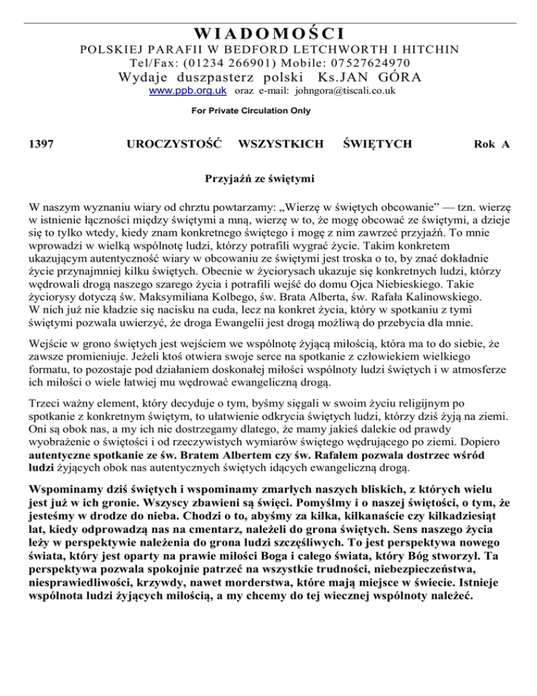WIADOMOŚCI POLSKIEJ PARAFII W BEDFORD LETCHWORTH I HITCHIN Tel/Fax: (01234 266901) Mobile: 07 527624970 Wydaje duszpasterz polski Ks.JAN GÓRA www.ppb.org.uk oraz e-mail: [email protected] For Private Circulation Only 1397 UROCZYSTOŚĆ WSZYSTKICH ŚWIĘTYCH Rok A Przyjaźń ze świętymi W naszym wyznaniu wiary od chrztu powtarzamy: „Wierzę w świętych obcowanie” — tzn. wierzę w istnienie łączności między świętymi a mną, wierzę w to, że mogę obcować ze świętymi, a dzieje się to tylko wtedy, kiedy znam konkretnego świętego i mogę z nim zawrzeć przyjaźń. To mnie wprowadzi w wielką wspólnotę ludzi, którzy potrafili wygrać życie. Takim konkretem ukazującym autentyczność wiary w obcowaniu ze świętymi jest troska o to, by znać dokładnie życie przynajmniej kilku świętych. Obecnie w życiorysach ukazuje się konkretnych ludzi, którzy wędrowali drogą naszego szarego życia i potrafili wejść do domu Ojca Niebieskiego. Takie życiorysy dotyczą św. Maksymiliana Kolbego, św. Brata Alberta, św. Rafała Kalinowskiego. W nich już nie kładzie się nacisku na cuda, lecz na konkret życia, który w spotkaniu z tymi świętymi pozwala uwierzyć, że droga Ewangelii jest drogą możliwą do przebycia dla mnie. Wejście w grono świętych jest wejściem we wspólnotę żyjącą miłością, która ma to do siebie, że zawsze promieniuje. Jeżeli ktoś otwiera swoje serce na spotkanie z człowiekiem wielkiego formatu, to pozostaje pod działaniem doskonałej miłości wspólnoty ludzi świętych i w atmosferze ich miłości o wiele łatwiej mu wędrować ewangeliczną drogą. Trzeci ważny element, który decyduje o tym, byśmy sięgali w swoim życiu religijnym po spotkanie z konkretnym świętym, to ułatwienie odkrycia świętych ludzi, którzy dziś żyją na ziemi. Oni są obok nas, a my ich nie dostrzegamy dlatego, że mamy jakieś dalekie od prawdy wyobrażenie o świętości i od rzeczywistych wymiarów świętego wędrującego po ziemi. Dopiero autentyczne spotkanie ze św. Bratem Albertem czy św. Rafałem pozwala dostrzec wśród ludzi żyjących obok nas autentycznych świętych idących ewangeliczną drogą. Wspominamy dziś świętych i wspominamy zmarłych naszych bliskich, z których wielu jest już w ich gronie. Wszyscy zbawieni są święci. Pomyślmy i o naszej świętości, o tym, że jesteśmy w drodze do nieba. Chodzi o to, abyśmy za kilka, kilkanaście czy kilkadziesiąt lat, kiedy odprowadzą nas na cmentarz, należeli do grona świętych. Sens naszego życia leży w perspektywie należenia do grona ludzi szczęśliwych. To jest perspektywa nowego świata, który jest oparty na prawie miłości Boga i całego świata, który Bóg stworzył. Ta perspektywa pozwala spokojnie patrzeć na wszystkie trudności, niebezpieczeństwa, niesprawiedliwości, krzywdy, nawet morderstwa, które mają miejsce w świecie. Istnieje wspólnota ludzi żyjących miłością, a my chcemy do tej wiecznej wspólnoty należeć. MSZE ŚWIĘTE I NABOŻEŃSTWA Charity Reg. No. 1119423 Niedziela, 2. 11. 2014r UROCZYSTOŚĆ WSZYSTKICH ŚWIĘTYCH Godz.13.00 - za dusze ś.p. zmarłych wymienionych w tegorocznych Wypominkach w naszej parafii w Letchworth. Niedziela, 9. 11.2014 r TRZYDZIESTA DRUGA NIEDZIELA ROKU LITURGICZNEGO Godz.13.00 - za ś.p.Kacpra Pardo w 4-tą rocznicę śmierci- int. rodziców i rodzeństwo. Niedziela,16.11.2014 r TRZYDZIESTA TRZECIA NIEDZIELA ROKU LITURGICZNEGO Godz.13.00 - W intencji dziękczynnej za pomyślność w pielgrzymcw do Matki Bożej Szkaoleżniej w Aylesford oraz o błogosławieństwo Boże dla osób biorących w niej udział - int. Pana Janusz (kierowcy). Niedziela,23.11.2014 r UROCZYSTOŚĆ JEZUSA KRÓLA WSZECHŚWIATA Godz.13.00 - za dusze ś.p. Andrzeja, Stefanii, Wojciecha, Józefa oraz zmarłych z rodziny Purzyńskich, ś.p. Jana, Jadwigi, Józefa, Weroniki, Kazimierza, Edny i Barbary Mechelewskich oraz zmarłych z tej rodziny - int. Państwa Stanisława i Marii Mechelewskich. Niedziela,30.11.2014r. PIERWSZA NIEDZIELA ADWENTU ( Rok B ) Godz.13.00 - za dusze ś.p. Bronisława, Zdzisława, Antoniego, Bronisławy, Stanisława i Rozalii Sobek - int. Pani Stanisławy Sobek Słowo Ks. J. M. Góra, kapłana rezydenta przy kościele w Bedford. przed odejściem na stanowisko kapelana Sióstr Kapucynek w Warszawie Słowo wdzięczności, kieruję pod adresem Rektora Polskiej Misji Katolickiej w Anglii i Walii, Ks. Prałata S. Wylężek, który idąc śladami zwyczaju w Archidiecezji Katowickiej do której należy z własnej incjatywy „oddelegował” mnie rok przed osiągnięciem państwowego wieku emerytalnego na rezydenta do Bedford aby służyć pomocą proboszczowi, Ks. G. Aleksandrowiczowi. Przydzielenie drugiego kapłana do pomocy sprawiło, że ciężar sprawowania roli duszpasterskiej miał na celu ulżyć miejscowemu duszpasterzowi. Przydzielono mi dojazdową placówkę w Letchworth wraz przylegającym Baldock, Hitchin, Stevenage, Welwyn Garden City oraz Hatfield. Wyznaczając mi rezydencję przy kościele w Bedford oczekiwano abym również spełnił rolę spowiednika podczas Mszy św. w tym kościele. Jak w każdej posłudze kapłańskiej przy parafii szczególna pomocą służą Rady Administracyjne i Duszpasterskie powołane przez proboszcza i tak było w tej sytuacji. Członkami Rad byli parafianie z młodszego pokolenia przybyłych do Anglii w poszukiwaniu pracy, której trudno było znaleźć w Polsce. Członkowie Rad służą bezintersowną pracą dla pomyślnego rozowju wspólnoty. Gdy chodzi o Letchworth to nastała sytuacja aby dać początek solidnej relacji między wspólnotą polską a lokalną Radą kościoła angielskiego, który udostępnił nam użytek swego objektu na Msze św. i nabożeństwa w języku polskim zapoczatkowanym przez starsze pokolenie, które się kurczyło. Jak każda relacja ona również miała swoje zloty i upadki spowodowane przez wzajemne niedomówienia czy braku zrozumienia spow