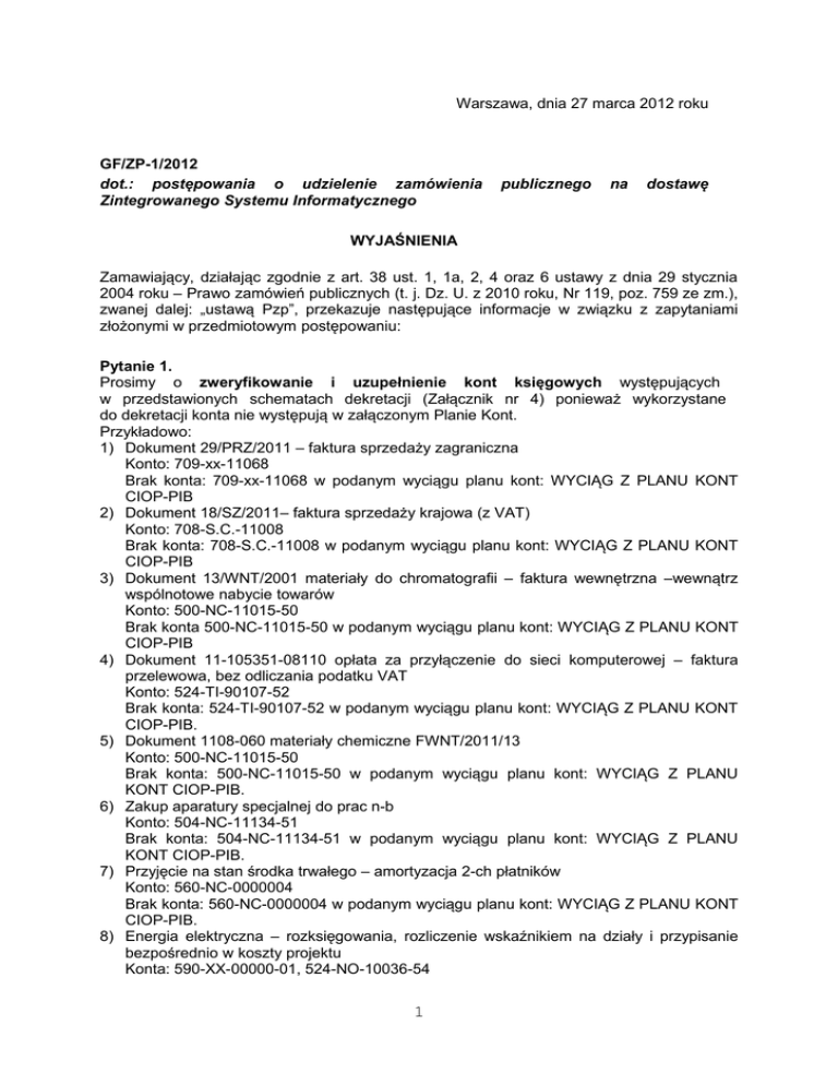 Warszawa, dnia 27 marca 2012 roku GF/ZP-1/2012 dot.: postępowania o udzielenie zamówienia Zintegrowanego Systemu Informatycznego publicznego na dostawę WYJAŚNIENIA Zamawiający, działając zgodnie z art. 38 ust. 1, 1a, 2, 4 oraz 6 ustawy z dnia 29 stycznia 2004 roku – Prawo zamówień publicznych (t. j. Dz. U. z 2010 roku, Nr 119, poz. 759 ze zm.), zwanej dalej: „ustawą Pzp”, przekazuje następujące informacje w związku z zapytaniami złożonymi w przedmiotowym postępowaniu: Pytanie 1. Prosimy o zweryfikowanie i uzupełnienie kont księgowych występujących w przedstawionych schematach dekretacji (Załącznik nr 4) ponieważ wykorzystane do dekretacji konta nie występują w załączonym Planie Kont. Przykładowo: 1) Dokument 29/PRZ/2011 – faktura sprzedaży zagraniczna Konto: 709-xx-11068 Brak konta: 709-xx-11068 w podanym wyciągu planu kont: WYCIĄG Z PLANU KONT CIOP-PIB 2) Dokument 18/SZ/2011– faktura sprzedaży krajowa (z VAT) Konto: 708-S.C.-11008 Brak konta: 708-S.C.-11008 w podanym wyciągu planu kont: WYCIĄG Z PLANU KONT CIOP-PIB 3) Dokument 13/WNT/2001 materiały do chromatografii – faktura wewnętrzna –wewnątrz wspólnotowe nabycie towarów Konto: 500-NC-11015-50 Brak konta 500-NC-11015-50 w podanym wyciągu planu kont: WYCIĄG Z PLANU KONT CIOP-PIB 4) Dokument 11-105351-08110 opłata za przyłączenie do sieci komputerowej – faktura przelewowa, bez odliczania podatku VAT Konto: 524-TI-90107-52 Brak konta: 524-TI-90107-52 w podanym wyciągu planu kont: WYCIĄG Z PLANU KONT CIOP-PIB. 5) Dokument 1108-060 materiały chemiczne FWNT/2011/13 Konto: 500-NC-11015-50 Brak konta: 500-NC-11015-50 w podanym wyciągu planu kont: WYCIĄG Z PLANU KONT CIOP-PIB. 6) Zakup aparatury specjalnej do prac n-b Konto: 504-NC-11134-51 Brak konta: 504-NC-11134-51 w podanym wyciągu planu kont: WYCIĄG Z PLANU KONT CIOP-PIB. 7) Przyjęcie na stan środka trwałego – amortyzacja 2-ch płatników Konto: 560-NC-0000004 Brak konta: 560-NC-0000004 w podanym wyciągu planu kont: WYCIĄG Z PLANU KONT CIOP-PIB. 8) Energia elektryczna – rozksięgowania, rozliczenie wskaźnikiem na działy i przypisanie bezpośrednio w koszty projektu Konta: 590-XX-00000-01, 524-NO-10036-54 1 Brak kont: 590-XX-00000-01, 524-NO-10036-54 w podanym wyciągu planu kont: WYCIĄG Z PLANU KONT CIOP-PIB. Takie sytuacje występują również w kolejnych dokumentach. Odpowiedź na pytanie 1: Zamawiający, w Załączniku numer 4 do specyfikacji istotnych warunków zamówienia, dokonał weryfikacji oraz uzupełnienia kont księgowych, którego obowiązująca treść stanowi załącznik do niniejszego pisma. Pytanie 2. W Punkcie 6 opisu kryteriów oceny próbki Zamawiający oceniać będzie: „Możliwość definiowania przez Zamawiającego wariantowego schematu obiegu dokumentów takich jak zapotrzebowanie, zamówienie, faktura”. Czy realizacja wymagania dotyczącego obiegu dokumentów takich jaki zapotrzebowanie, zamówienie, faktura są w zakresie wymagań funkcjonalnych dostarczanego systemu ZSI? Odpowiedź na pytanie 2: Tym kryterium Zamawiający oceni, czy ZSI daje możliwość zdefiniowania obiegu dokumentów, takich jak: zapotrzebowanie, zamówienie, faktura. Zamawiającemu nie chodzi o moduł „obieg dokumentów” dla całego Instytutu, tylko obieg na potrzeby przypisania do danej faktury wewnętrznego zamówienia, czy zapotrzebowania, który będzie realizowany w dziale finansowo-księgowym. Ocena próbki dokonywana będzie na podstawie Załącznika numer 4 do specyfikacji istotnych warunków zamówienia, natomiast funkcjonalność będzie oceniana na podstawie Załącznika numer 3 do specyfikacji istotnych warunków zamówienia. Pytanie 3. W Punkcie 1 opisu kryteriów oceny próbki Zamawiający oceniać będzie: „Poziom trudności implementacji przez użytkowników przekazanych zadań”. Prosimy o wyjaśnienie co konkretnie Zamawiający będzie oceniać. Odpowiedź na pytanie 3: Zamawiający oceni możliwość łatwego zrozumienia i wdrożenia przez użytkowników systemu, zaprezentowanych przez oferenta zadań w „próbce”. Pytanie 4. Czy Zamawiający ocenę oferowanego oprogramowania przeprowadzi tylko na podstawie dostarczonej próbki czy też również przewiduje możliwość zaprezentowania systemu przez Oferenta w formie spotkania prezentacyjnego. Odpowiedź na pytanie 4: Zamawiający oceni ofertę na podstawie kryteriów, o których mowa w punkcie XV specyfikacji istotnych warunków zamówienia. Zamawiający nie przewiduje możliwości zaprezentowania systemu przez oferentów w formie spotkania prezentacyjnego. Pytanie 5. Uprzejmie prosimy o wyjaśnienie treści Specyfikacji Istotnych Warunków Zamówienia: 1. Załącznik nr 2 do SIWZ, Informacja na temat sprzętu komputerowego i infrastruktury sieciowej Zamawiającego 3. Sprzęt drukujący Zamawiającego: Oprogramowanie stacji roboczych (oprogramowanie klienta systemu) wykorzystywane przez oferowany system ZSI musi być zdolne do prawidłowego współdziałania z popularnymi 2 modelami biurowego sprzętu drukującego, znajdującego się w posiadaniu Zamawiającego. W szczególności wymaga się zgodności z następującymi modelami drukarek: HP laserjet 5200dn, Sharp AR-5320, HP laserjet 2025, HP laserjet 1200, HP laserjet 5200dn, HP deskjet 950, HP CP3525dn, HP laserjet 5000n, HP Laserjet 2025. Ponadto wymagana jest zgodność oferowanego systemu z kolorową drukarką laserową OCE CS620, OCE CPS700. Wykonawca gwarantuje poprawną ich instalację w systemach operacyjnych na komputerach Zamawiającego. Wykonawcy mogą zagwarantować współpracę z dowolnym modelem drukarki z jednym zastrzeżeniem: jej producent dostarcza aktualne sterowniki do systemu operacyjnego stacji roboczej/serwera na których zainstalowany i wykorzystywany jest ZSI. Wnosimy o zmianę zapisów SIWZ w ostatnim zdaniu punktu 3 na: „Zamawiający gwarantuje poprawną ich instalację w systemach operacyjnych na komputerach Zamawiającego” Uzasadnienie: Wykona