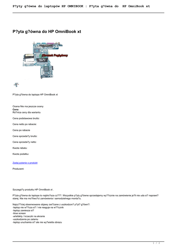 P?yty g?ówne do laptopów HP OMNIBOOK : P?yta g?ówna do HP OmniBook xt P?yta g?ówna do HP OmniBook xt P?yta g?ówna do laptopa HP OmniBook xt Ocena Nie ma jeszcze oceny Cena Ró?nica ceny dla wariantu Cena podstawowa brutto: Cena netto po rabacie: Cena po rabacie Cena sprzeda?y brutto: Cena sprzeda?y netto: Kwota rabatu: Kwota podatku: Zadaj pytanie o produkt Producent: Szczegó?y produktu HP OmniBook xt . P?yta g?ówna do laptopa to najdro?sza cz???. Wszystkie p?yty g?ówne sprzedajemy wy??cznie na zamówienie je?li nie uda si? naprawi? starej. Nie ma mo?liwo?ci zamówienia i samodzielnego monta?u. Najcz??ciej obserwowane objawy zwi?zane z uszkodzon? p?yt? g?ówn?: -laptop nie w??cza si? / nie reaguje na w??cznik -laptop zawiesza si? -blue screan -artefakty / krzaczki na ekranie -uszkodzenia po zalaniu -laptop uruchamia si? ale nie wy?wietla obrazu 1 / 2 P?yty g?ówne do laptopów HP OMNIBOOK : P?yta g?ówna do HP OmniBook xt Pami?taj naprawa p?yty g?ównej jest znacznie ta?sza niz zakup nowej ZAPRASZAMY Recenzje Nikt jeszcze nie ocenia? tego produktu. 2 / 2 Powered by TCPDF (www.tcpdf.org)