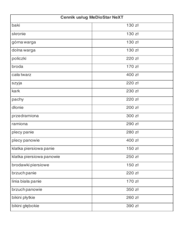 Cennik usług MeDioStar NeXT baki 130 zł skronie 130 zł górna warga 130 zł dolna warga 130 zł policzki 220 zł broda 170 zł cała twarz 400 zł szyja 220 zł kark 230 zł pachy 220 zł dłonie 200 zł przedramiona 300 zł ramiona 290 zł plecy panie 280 zł plecy panowie 400 zł klatka piersiowa panie 150 zł klatka piersiowa panowie 250 zł brodawki piersiowe 150 zł brzuch panie 220 zł linia biała panie 170 zł brzuch panowie 350 zł bikini płytkie 260 zł bikini głębokie 390 zł szpara pośladkowa 250 zł pośladki panie 250 zł pośladki panowie 350 zł uda panie 350 zł uda panowie 450 zł kolana 250 zł łydki panie 320 zł łydki panowie 380 zł stopy (podbicie) 220 zł Cennik usług IPL Trios baki 100 zł skronie 100 zł górna warga 100 zł dolna warga 100 zł policzki 200 zł broda 150 zł cała twarz 350 zł szyja 200 zł kark 250 zł pachy 250 zł dłonie 200 zł przedramiona 280 zł ramiona 300 zł plecy panie 300 zł plecy panowie 500 zł klatka piersiowa panie 250 zł klatka piersiowa panowie 350 zł brodawki piersiowe 150 zł brzuch panie 200 zł linia biała panie 150 zł brzuch panowie 300 zł bikini płytkie 200 zł bikini głębokie 350 zł szpara pośladkowa 200 zł pośladki panie 200 zł pośladki panowie 300 zł uda panie 350 zł uda panowie 450 zł kolana 200 zł łydki panie 300 zł łydki panowie 400 zł stopy ( podbicie ) 200 zł Cennik usług Selectif Pro brwi 150 zł baki 150 zł skronie 150 zł górna warga 150 zł dolna warga 150 zł policzki 300 zł broda 200 zł uszy 150 zł nos 150 zł pachy 350 zł dłonie 300 zł brodawki piersiowe 250 zł bikini płytkie 400 zł bikini głębokie 600 zł szpara pośladkowa 300 zł kolana 300 zł stopy 300 zł