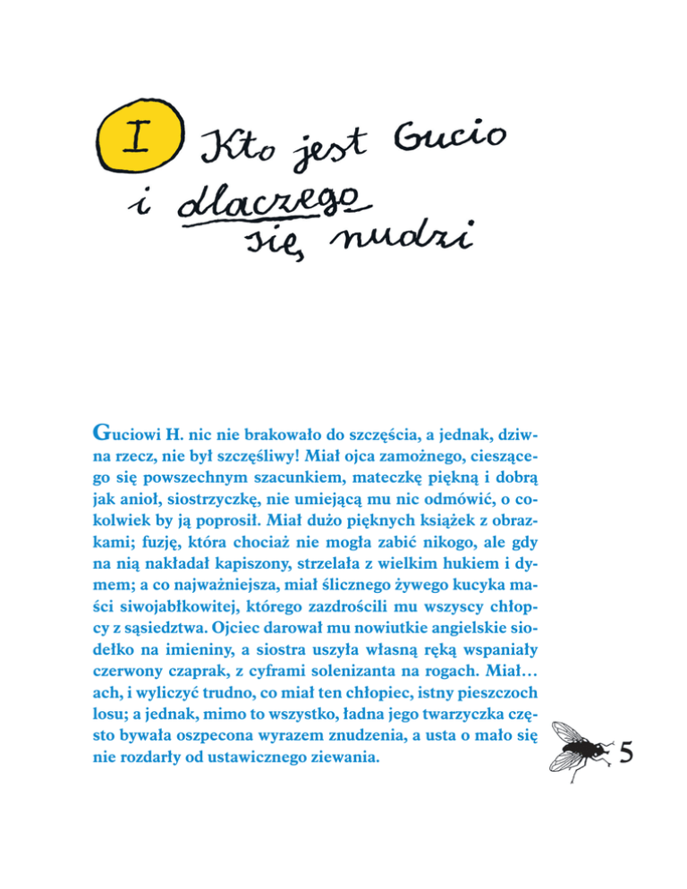 I Kto jest Gucio i dlaczego się nudzi Guciowi H. nic nie brakowało do szczęścia, a jednak, dziw- na rzecz, nie był szczęśliwy! Miał ojca zamożnego, cieszącego się powszechnym szacunkiem, mateczkę piękną i dobrą jak anioł, siostrzyczkę, nie umiejącą mu nic odmówić, o cokolwiek by ją poprosił. Miał dużo pięknych książek z obrazkami; fuzję, która chociaż nie mogła zabić nikogo, ale gdy na nią nakładał kapiszony, strzelała z wielkim hukiem i dymem; a co najważniejsza, miał ślicznego żywego kucyka maści siwojabłkowitej, którego zazdrościli mu wszyscy chłopcy z sąsiedztwa. Ojciec darował mu nowiutkie angielskie siodełko na imieniny, a siostra uszyła własną ręką wspaniały czerwony czaprak, z cyframi solenizanta na rogach. Miał… ach, i wyliczyć trudno, co miał ten chłopiec, istny pieszczoch losu; a jednak, mimo to wszystko, ładna jego twarzyczka często bywała oszpecona wyrazem znudzenia, a usta o mało się nie rozdarły od ustawicznego ziewania. 5 6 Począwszy od rodziców a skończywszy na służbie, wszyscy mu dogadzali: zaledwie objawił jakieś życzenie, już przemyśliwano, jakby je zaspokoić, jakby mu sprawić niespodziankę. Doszło do tego, że nareszcie sam nie wiedział, czego pragnąć, posiadał bowiem wszystko, czego chłopiec w jego wieku mógł potrzebować, a nawet więcej jeszcze. Wrażliwy z natury, każdą niespodziankę przyjmował z objawami szalonej radości — ale trwało to krótko; przestając być nowością, przestawała go jednocześnie zajmować. Książki, choćby najciekawszej, nie przeczytał nigdy całej; zajrzał na początek, na koniec, przeczytał kilka kartek ze środka, pooglądał obrazki i rzucał. Tak było ze wszystkim. Dlaczego tak było, ja się trochę domyślam: oto dlatego, że Gucio miał wszystkiego zanadto i że nie lubił nic robić. Był próżniaczkiem. Zabawa jest stokroć przyjemniejsza, gdy następuje po pracy — a nasz przyjaciel unikał wszystkiego, co było z trudem połączone. Niejeden z czytelników pewnie przypisze tego winę państwu H. i zgani ich zbyteczną słabość dla syna. Ale ja, co znam ich od dawna i wiem, że gdy Gucio był jeszcze bardzo mały, stracili dnia jednego od razu dwóch chłopczyków na zaraźliwą chorobę, nie mogę ich potępiać za to, że nie umieli zakreślić granic swemu przywiązaniu i troskliwości dla jedynego, jaki im pozostał — zwłaszcza, że wątła, delikatna budowa chłopca trzymała ich w ciągłej obawie o jego zdrowie. Zdolności Guciowi nic brakowało: bystry był, pojętny, ale miał nieprzezwyciężony wstręt do nauki, która, jak każda praca, musiała być połączona z pewnym trudem. Bywało na przykład, że panna Anna, nauczycielka, wykłada mu coś i dobiera wyrazów, jak najprzystępniej malujących przedmiot — a on te wyrazy jednym uchem wpuszcza, a drugim …jednym uchem wpuszcza… (s. 6) wypuszcza, i tylko myśli o tym, że białe gołębie jego przyjaciela Janka są ładniejsze od jego szarych gołębi, i że musi się z nim pomieniać — albo, jakby też wyglądał jego kucyk, gdyby mu ogon zawinąć w papiloty, a na łeb włożyć pasterski kapelusz Helusi. Toteż gdy panna Anna każe mu powtórzyć to, co słyszał, powtarza tylko słowo w słowo, co mu siostra z litości podpowie; albo jeżeli mu przypadkiem tej dobroczynnej pomocy zabraknie, opowiada piąte przez dziesiąte i miesza wszystko razem, niby groch z kapustą. Panna Anna, osoba bardzo dobra i szczerze do obojga dzieci przywiązana, napominała go łagodnie raz, drugi, trzeci, ale gdy to nie skutkowało, szła do mamy. Gucio kochał swoją mateczkę nad wszystko w świecie, i nie było dla niego sroższej kary, jak widzieć ją zmartwioną — toteż taka narada z panną Anną, odbywająca się przy drzwiach zamkniętych, budziła w nim zwykle wszystkie głosy sumienia. Z bijącym sercem patrzył z drugiego pokoju w te drzwi; a gdy nareszcie otworzyły się — i mama, wezwawszy go do siebie, wyrzucała mu jego niedbalstwo, tak ją przepraszał i całował po rękach, tak płakał, tak gorąco obiecywał poprawę, że dobra mateczka zawsze przebaczyła, uściskała synka, a co najważniejsza, uwierzyła w jego przyrzeczenia. A jak tu było nie wierzyć, kiedy słowa Gucia tchnęły taką prawdą, a na twarzyczce malowało się zmartwienie tak głębokie, że aż żal było patrzeć! Czy jednak dotrzymywał tych przyrzeczeń? Niestety! Łatwiej jest obiecać, niż dotrzymać. Miał on dobre serce, kochał rodziców i siostrzyczkę i gotów byłby w każdej chwili skoczyć dla nich w ogień lub wodę, choćby go to życie miało kosztować — tak mu się przynajmniej zdawało — ale… popracować nad czymś, przełamać swoje lenistwo, tego nikt na nim nie wymógł. Może to komu 9 10 dziwne się wyda, że ofiara z życia łatwiejsza się zdawała Guciowi, niż na przykład nauczenie się tabliczki mnożenia — a jednak tak było; bo dla poświęcenia życia wystarcza nieraz jedna chwila, a tabliczki mnożenia trzeba się uczyć kilka dni pilnie, z uwagą — na takie zaś bohaterstwo trudno mu się było zdobyć. Miewał on tysiące pięknych zamiarów, silnych postanowień — ale wszystkie, których natychmiast nie można było wykonać, kończyły się na niczym, bo mu brakowało wytrwałości. Gucio wiedział o tej wadzie swego charakteru i nieraz przy wieczornym pacierzu dawał sobie słowo, że „od jutra rana będzie inny”. Gdy przyszło owo „jutro”, wstawał rano, ubierał się śpiesznie, zasiadał do książki, i żal mi powiedzieć, ale muszę, bo prawda przede wszystkim — zanim nadeszło południe, zaczął zagłuszać w sobie głos sumienia i prosić je o pobłażanie „na dziś tylko jeszcze, bo od jutra niezawodnie już poprawę rozpocznie”. Po takim oszukaniu samego siebie, uczuwał zawsze trochę wstydu przed sobą, ale uspokajała go myśl, że „jutro z pewnością już będzie inaczej” — i cieszy