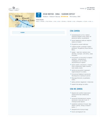 Infolinia 29 OCEAN INDYJSKI - DUBAJ - SEABOURN ODYSSEY DNI Seabourn - Seabourn Odyssey 801 08 08 03 22 492 77 90 | Rok budowy: 2009 TRASA REJSU: Dubaj TERMIN Khasab Khor Fakkan dzie dzie Mumbai Mumbai dzie Mangalore Cochin dzie ... CENA ZAWIERA zakwaterowanie w 2-os. kabinie wybranej kategorii (cena zależy od położenia kabiny na pokładzie) serwis bagażowy podczas wejścia i zejścia ze statku 24-godzinny serwis kabinowy 3 główne posiłki, przekąski między posiłkami, 24-godzinny Suite Service Menu napoje – open bar: wybrane wina, alkohole, szampan, soft drinks, woda mineralna korzystanie ze wszystkich urządzeń sportowo – rekreacyjnych znajdujących się na statku (wymienionych w opisie) sporty wodne: nurkowanie z maską i rurką, windsurfing, kajaki morskie, narty wodne, banan udział we wszystkich imprezach organizowanych na statku Exclusively Seabourn (wycieczka fakultatywna w wybranym porcie) Massage Moments na pokładzie statku opłaty portowe, bagażowe i miejscowe napiwki dla obsługi na statku. CENA NIE ZAWIERA dojazdu do/z portów rozpoczęcia i zakończenia rejsu (propozycja poniżej) wycieczek fakultatywnych (wykaz wycieczek znany jest na ok. 3 miesiące przed rejsem) wydatków osobistych (fryzjer, Spa, telefon, pralnia, zakupy w barach i butiku...) ubezpieczenia turystycznego kosztu wymaganych wiz.