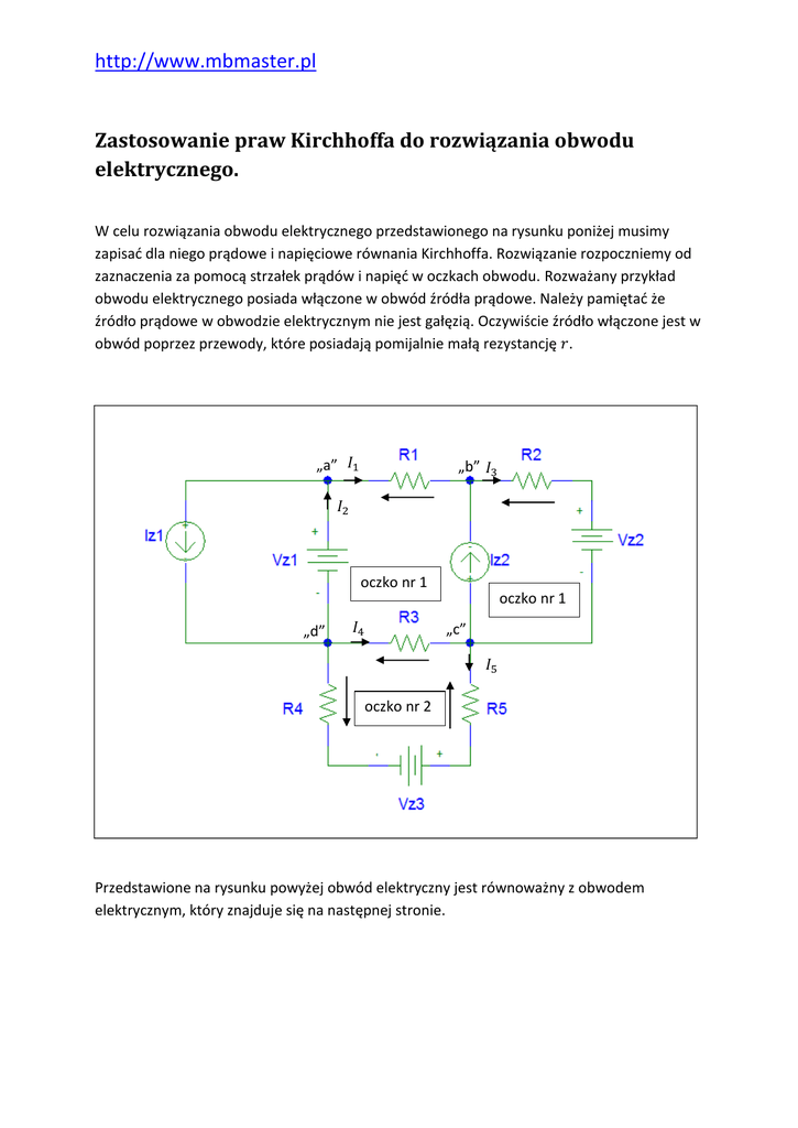 http://www.mbmaster.pl Zastosowanie praw Kirchhoffa do rozwiązania obwodu elektrycznego. W celu rozwiązania obwodu elektrycznego przedstawionego na rysunku poniżej musimy zapisać dla niego prądowe i napięciowe równania Kirchhoffa. Rozwiązanie rozpoczniemy od zaznaczenia za pomocą strzałek prądów i napięć w oczkach obwodu. Rozważany przykład obwodu elektrycznego posiada włączone w obwód źródła prądowe. Należy pamiętać że źródło prądowe w obwodzie elektrycznym nie jest gałęzią. Oczywiście źródło włączone jest w obwód poprzez przewody, które posiadają pomijalnie małą rezystancję . „a” 𝐼1 „b” 𝐼3 𝐼2 oczko nr 1 „d” 𝐼4 oczko nr 1 „c” 𝐼5 oczko nr 2 Przedstawione na rysunku powyżej obwód elektryczny jest równoważny z obwodem elektrycznym, który znajduje się na następnej stronie. http://www.mbmaster.pl „a” 𝐼1 „b” 𝐼2 𝐼3 oczko nr 1 „d” 𝐼4 „c” 𝐼5 oczko nr 2 Rozpatrywany obwód elektryczny zbudowany jest czterech węzłów i dwóch oczek. W przykładzie stosujemy następującą konwencję: - prąd wpływający do węzła zapisujemy jako znakiem , prąd wypływający z węzła oznaczamy z - napięcia których kierunki strzałek są zgodne z ruchem wskazówek zegara oznaczamy jako , napięcia których zwrot jest przeciwny do ruchu wskazówek zegara oznaczamy z znakiem Liczbę węzłów oznaczamy jako , stosując równania Kirchhoffa do rozwiązania obwodu elektrycznego liczba równań dla pierwszego prawa Kirchhoffa jest równa W przykładzie liczba węzłów jest równa cztery, więc potrzebne są trzy równania prądowe Kirchoffa. Nadmiarowo zapisane zostaną cztery równania prądowe Kirchhoffa. Do rozwiązania zadania wystarczą trzy spośród nich. Dla węzła „a” zapiszemy równania pierwszego prawa Kirchhoffa. 1 1 2 http://www.mbmaster.pl Dla węzła „b” zapiszemy równania pierwszego prawa Kirchhoffa. 1 2 3 Dla węzła „c” zapiszemy równania pierwszego prawa Kirchhoffa. 3 4 2 5 Dla węzła „d” zapiszemy równania pierwszego prawa Kirchhoffa. 1 2 4 Liczba równań napięciowych Kirchhoffa jest zależna od liczby gałęzi i węzłów w obwodzie. Wzór ogólny dla liczby równań napięciowych jest postaci: Rozpatrywany obwód posiada pięć gałęzi więc potrzebne będą dwa równania dla drugiego prawa Kirchhoffa. Równanie napięciowe dla oczka 1: 1 1 1 2 3 2 3 4 Równanie napięciowe dla oczka 2: 3 4 5 3 4 5 5 W postaci ogólnej zadanie jest rozwiązane. Zapisane zostały cztery równania dla pierwszego prawa Kirchhoffa oraz dwa równania dla drugiego prawa Kirchhoffa. Jak zostało wcześniej napisane dla obwodu elektrycznego będącego przedmiotem zadania wystarczyłoby zapisać równania prądowe dla trzech węzłów zgodnie z regułą .