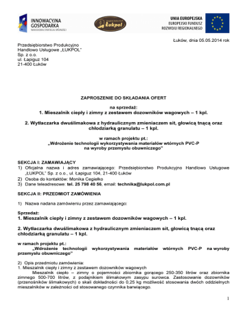 Łuków, dnia 05.05.2014 rok Przedsiębiorstwo Produkcyjno Handlowo Usługowe „ŁUKPOL” Sp. z o.o. ul. Łapiguz 104 21-400 Łuków ZAPROSZENIE DO SKŁADANIA OFERT na sprzedaż: 1. Mieszalnik ciepły i zimny z zestawem dozowników wagowych – 1 kpl. 2. Wytłaczarka dwuślimakowa z hydraulicznym zmieniaczem sit, głowicą tnącą oraz chłodziarką granulatu – 1 kpl. w ramach projektu pt.: „Wdrożenie technologii wykorzystywania materiałów wtórnych PVC-P na wyroby przemysłu obuwniczego” SEKCJA I: ZAMAWIAJĄCY 1) Oficjalna nazwa i adres zamawiającego: Przedsiębiorstwo Produkcyjno Handlowo Usługowe „ŁUKPOL” Sp. z o.o., ul. Łapiguz 104, 21-400 Łuków 2) Osoba do kontaktów: Monika Cegiełko 3) Dane teleadresowe: tel. 25 798 40 56, email: [email protected] SEKCJA II: PRZEDMIOT ZAMÓWIENIA 1) Nazwa nadana zamówieniu przez zamawiającego: Sprzedaż: 1. Mieszalnik ciepły i zimny z zestawem dozowników wagowych – 1 kpl. 2. Wytłaczarka dwuślimakowa z hydraulicznym zmieniaczem sit, głowicą tnącą oraz chłodziarką granulatu – 1 kpl. w ramach projektu pt.: „Wdrożenie technologii przemysłu obuwniczego” wykorzystywania materiałów wtórnych PVC-P na wyroby 2) Opis przedmiotu zamówienia: 1. Mieszalnik ciepły i zimny z zestawem dozowników wagowych Mieszalnik ciepło – zimny o pojemności zbiornika gorącego 250-350 litrów oraz zbiornika zimnego 500-700 litrów, z podajnikiem ślimakowym zasypu surowca. Zastosowanie dozowników (przenośników ślimakowych) o skali dokładności do 0,25 kg możliwość stosowania dwóch oddzielnych mieszalników w zależności od stosowanego czynnika barwiącego. 1 2. Wytłaczarka dwuślimakowa z hydraulicznym zmieniaczem sit, głowicą tnącą oraz chłodziarką granulatu: Wytłaczarka dwuślimakowa z możliwością mieszania kompozycji polimerowej, o średnicy ślimaków 80/156 mm, obroty ślimaka 0-40 obrotów/nim., cylinder ślimaka chłodzony powietrzem, ślimaki z zastosowaniem wewnętrznego chłodzenia cyrkulacyjnego. Wydajność maszyny od 250 do 350 kg/godzinę. Zestaw sit o zróżnicowanej perforacji, zależnej od wariantu recepturowo – technologicznego prowadzonego procesu. Sita z możliwością obsługi zdalnej przez zastosowanie zmieniacza hydraulicznego. Zmieniacze sit, głowica tnąca oraz układ chłodzenia granulaty dostosowany do wydajności wytłaczarki, wielkość przetwarzanego granulatu do 4 mm. 3) 4) 5) 6) 7) 8) 9) Miejsce dostarczenia i montażu przedmiotu zamówienia: 21-400 Łuków, ul. Łapiguz 118 Czy dopuszcza się złożenie oferty częściowej: NIE Czy dopuszcza się złożenie oferty wariantowej: NIE Czy przewiduje się zawarcie umowy ramowej: NIE Czy przewiduje się dynamiczny system zakupów: NIE Czy przewiduje się zastosowanie aukcji elektronicznej: NIE Wymagany termin realizacji przedmiotu zamówienia: do 30 czerwca 2014r. SEKCJA III: INFORMACJE O CHARAKTERZE PRAWNYM, EKONOMICZNYM, FINANSOWYM I TECHNICZNYM Wykonawcy muszą spełniać następujące warunki: złożą pisemną ofertę na sprzedaż przedmiotu zamówienia, akceptują wzór umowy, dysponują odpowiednim personelem odpowiedzialnym za realizację zamówienia, przedstawią w ofercie cenę na sprzedaż przedmiotu zamówienia. SEKCJA IV: TRYBY 1) Kryteria oceny ofert: cena 100 %, 4) 2) Termin i miejsce składania ofert: do dnia 16.05.2014r. godzina 16:00, ul. Łapiguz 104, 21-400 Łuków lub drogą elektroniczną na email: [email protected] 3) Termin związania ofertą: 60 dni od ostatecznego terminu składania ofert. SEKCJA V: INNE INFORMACJE 1) Czy zam. dot. projektu/programu finansowanego ze środków UE: TAK. 2) Dokumentacja szczegółowa danych technicznych projektu do wglądu w siedzibie zamawiającego ul. Łapiguz 104, 21-400 Łuków od poniedziałku do piątku w godz. 8:00 – 16:00 do dnia 16.05.2014r. do godz. 16:00. 2