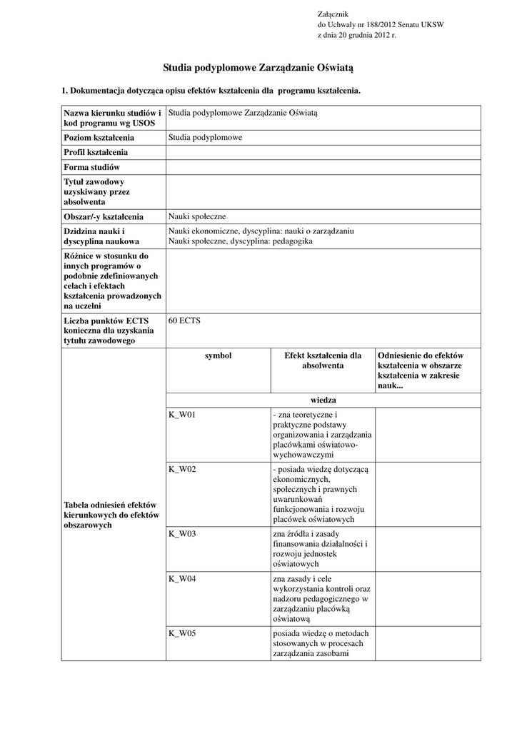 Załącznik do Uchwały nr 188/2012 Senatu UKSW z dnia 20 grudnia 2012 r. Studia podyplomowe Zarządzanie Oświatą 1. Dokumentacja dotycząca opisu efektów kształcenia dla programu kształcenia. Nazwa kierunku studiów i Studia podyplomowe Zarządzanie Oświatą kod programu wg USOS Poziom kształcenia Studia podyplomowe Profil kształcenia Forma studiów Tytuł zawodowy uzyskiwany przez absolwenta Obszar/-y kształcenia Nauki społeczne Dzidzina nauki i dyscyplina naukowa Nauki ekonomiczne, dyscyplina: nauki o zarządzaniu Nauki społeczne, dyscyplina: pedagogika Różnice w stosunku do innych programów o podobnie zdefiniowanych celach i efektach kształcenia prowadzonych na uczelni Liczba punktów ECTS konieczna dla uzyskania tytułu zawodowego 60 ECTS symbol Efekt kształcenia dla absolwenta wiedza K_W01 - zna teoretyczne i praktyczne podstawy organizowania i zarządzania placówkami oświatowowychowawczymi K_W02 - posiada wiedzę dotyczącą ekonomicznych, społecznych i prawnych uwarunkowań funkcjonowania i rozwoju placówek oświatowych K_W03 zna źródła i zasady finansowania działalności i rozwoju jednostek oświatowych K_W04 zna zasady i cele wykorzystania kontroli oraz nadzoru pedagogicznego w zarządzaniu placówką oświatową K_W05 posiada wiedzę o metodach stosowanych w procesach zarządzania zasobami Tabela odniesień efektów kierunkowych do efektów obszarowych Odniesienie do efektów kształcenia w obszarze kształcenia w zakresie nauk... ludzkimi K_W06 zna uwarunkowania procesu komunikacji interpersonalnej K_W07 wyjaśnia uwarunkowania procesu planowania i kierowania placówka oświatową K_W08 rozumie zasady i metody stosowania działań marketingowych wspierających promocję szkoły w środowisku lokalnym umiejętności K_U01 - potrafi skutecznie planować, kierować i administrować placówkami oświatowymi K_U02 - potrafi planować działania jednostek oświatowych pod względem współpracy ze środowiskiem lokalnym K_U03 - potrafi zaplanować budżet placówki, identyfikować i wykorzystywać szanse związane z pozyskaniem dodatkowych źródeł finansowania działalności K_U04 - potrafi posługiwać się technologiami informacyjnymi w celu podnoszenia efektywności funkcjonowania jednostki oświatowej K_U05 - potrafi zastosować wiedzę z obszaru prawa oświatowego, prawa pracy do kierowania placówką oświatową K_U06 potrafi w sposób skuteczny, bezpośredni komunikować się z otoczeniem społecznym kompetencje społeczne K_K01 - docenia znaczenie wiedzy pedagogicznej, ekonomicznej i prawniczej w kształtowaniu i rozwijaniu prawidłowych więzi w środowisku społecznym K_K02 - odnosi zdobytą wiedzę do projektowania działań zawodowych K_K03 - posiada świadomość zachowania się w sposób profesjonalny i etyczny w pracy zawodowej K_K04 ma potrzebę uzupełniania wiedzy i doskonalenia umiejętności kierowania zespołem i placówką oświatową 1. Dokumentacja związana z programem studiów. Nazwa kierunku studiów i kod programu wg USOS Studia podyplomowe Zarządzanie Oświatą Poziom kształcenia Studia podyplomowe Profil kształcenia Forma studiów Tytuł zawodowy uzyskiwany przez absolwenta Liczba punktów ECTS konieczna dla uzyskania tytułu zawodowego 60 ECTS Liczba semestrów 2 Obszar/y kształcenia Nauki społeczne Dziedzina nauki i dyscyplina naukowa Nauki ekonomiczne, dyscyplina: nauki o zarządzaniu Nauki społeczne, dyscyplina: pedagogika Wskazanie związku z misją UKSW i jej strategią rozwoju Celem Uniwersytetu i studiów podyplomowych jest wszechstronne kształcenie zgodne z ideą integralnego rozwoju człowieka, które uwzględnia perspektywy nauki i wiary. Strategią rozwoju UKSW jest kształcenie ustawiczne, które realizowane jest poprzez studia podyplomowe. Ogólne cele kształcenia oraz możliwości zatrudnienia (typowe miejsca pracy) i kontynuacji kształcenia przez absolwentów studiów Przygotowanie wysokokwalifikowanej kadry kierowniczej oświaty do profesjonalnego zarządzania współczesną szkołą i innymi placówkami oświatowymi. Absolwenci studiów uzyskują kwalifikacje uprawniające do zajmowania stanowiska dyrektora lub innego stanowiska kierowniczego w szkole, przedszkolu i placówce oświatowowychowawczej (zgodnie z wymogami rozporządzenia Ministra Edukacji Narodowej z dnia 27 października 2009 r. w sprawie wymagań, jakim powinna odpowiadać osoba zajmująca stanowisko dyrektora oraz inne stanowisko kierownicze w poszczególnych typach publicznych szkół i rodzajach publicznych placówek (Dz. U. Nr 184, poz. 1436). Wymagania wstępne (oczekiwane kompetencje kandydata) – zwłaszcza w przypadku studiów drugiego stopnia Dyplom licencjacki lub magisterski Zasady rekrutacji Nabór na podstawie rejestracji w IRK oraz złożenia przez kandydata kompletu dokumentów, potwierdzających wymagane wykształcenie. Przyjęcie według kolejności zgłoszeń. Decyzję o przyjęciu podejmuje komisja rekrutacyjna w składzie: Dziekan wydziału, Prodziekan, Kierownik Studiów Podyplomowych. Rekrutacja na studia podyplomowe stronę: http://www.podyplomowe.uksw.edu.pl Minimum kadrowe z przyporządkowaniem poszczególnych osób do dyscyplin naukowych Warunki realizacji programu studiów odbywa się przez Prof. UKSW dr hab. Barbara Baraniak (Pedagogika) Mgr Elżbieta Bąkowska (ekspert, Kuratorium Oświaty) Mgr Anna Brzywca (ekspert, dyrektor szkoły) Mgr Maciej Ciechomski (Psychologia) Dr Anna Fidelus (Pedagogika) Mgr Krystyna Mucha (ekspert, Kuratorium Oświaty) Dr Witold Starnawski (Pedagogika) Mgr Emilia Śmiechowska – Pietrovskij (Pedagogika) Dr Wojciech Wierzejski (Nauki społeczne) Propozycja liczby nauczycieli akademickich stanowiących minimum kadrowe do liczby studiujących Opis działalności badawczej w odpowiednim obszarze wiedzy – w przypadku studiów prowadzących do uzyskania dyplomu magisterskiego Wymiar, zasady i forma odbywania praktyk Sumaryczne wskaźniki (punkty ECTS) charakteryzujące program stu