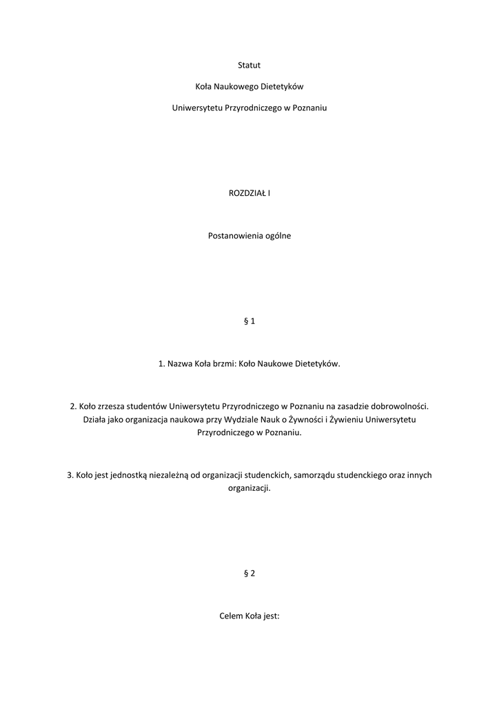 Statut Koła Naukowego Dietetyków Uniwersytetu Przyrodniczego w Poznaniu ROZDZIAŁ I Postanowienia ogólne §1 1. Nazwa Koła brzmi: Koło Naukowe Dietetyków. 2. Koło zrzesza studentów Uniwersytetu Przyrodniczego w Poznaniu na zasadzie dobrowolności. Działa jako organizacja naukowa przy Wydziale Nauk o Żywności i Żywieniu Uniwersytetu Przyrodniczego w Poznaniu. 3. Koło jest jednostką niezależną od organizacji studenckich, samorządu studenckiego oraz innych organizacji. §2 Celem Koła jest: 1. stwarzanie form organizacyjnych sprzyjających rozwojowi pracy naukowej, twórczej inicjatywy, nieskrępowanej wymiany myśli i poglądów naukowych, podnoszenie poziomu wiedzy studentów, 2. pogłębianie i rozszerzanie wiadomości z zakresu dietetyki i nauk o żywności, 3. krzewienie wiedzy o zasadach racjonalnego odżywiania, zgodnego z zaleceniami nauki o żywieniu człowieka i zdrowego stylu życia 4. pielęgnowanie więzi koleżeńskich. §3 Koło realizuje swoje cele przez: 1. współudział w pracy naukowej zakładów naukowych, 2. prace terenowe i laboratoryjne, 3. publikowanie swoich prac, 4. organizowanie obozów naukowych i szkoleniowych, wycieczek do zakładów przemysłu spożywczego, wykładów i prelekcji, ogólnopolskich konferencji i seminariów, 5. współdziałanie z innymi studenckimi Kołami Naukowymi oraz organizacjami w zakresie problemów związanych z naukami o żywności i żywieniu, §4 Praca w Kole ma charakter wyłącznie społeczny. ROZDZIAŁ II Członkowie Koła, ich prawa i obowiązki §5 Członkiem Koła może być student lub słuchacz studium doktoranckiego Wydziału Nauk o Żywności i Żywieniu Uniwersytetu Przyrodniczego w Poznaniu. §6 Po opuszczeniu uczelni członek Koła może nadal uczestniczyć w pracach Koła tracąc prawo do dofinansowania z funduszy Koła. §7 Członek Koła zobowiązany jest: 1. aktywnie uczestniczyć w pracach Koła i brać udział w minimum 70% obradach Walnego Zebrania oraz regularnych spotkaniach Koła. W uzasadnionych przypadkach członek Koła ma prawo nie stawić się na Walne Zebranie, o czym zobowiązany jest poinformować Prezesa Koła Naukowego telefonicznie, mailowo lub osobiście co najmniej dzień przed Zebraniem. Przez aktywne uczestnictwo rozumie się: a. koordynację minimum jednego projektu Koła, przy czym osobę i zakres obowiązków wyznacza Zarząd. W uzasadnionych przypadkach Koordynator może przekazać odpowiedzialność za wyznaczone zadanie osobie przez siebie wskazanej, jeśli zostanie zatwierdzona przez Zarząd, b. publikację na stronie internetowej Koła lub piśmiennictwie fachowym, przynajmniej jednego artykułu naukowego zatwierdzonego przez Opiekuna Koła Naukowego, 3. w ciągu pierwszego kwartału każdego roku akademickiego opłacić roczną składkę członkowską, o ile taka zostanie uchwalona przez Zarząd, 4. ściśle przestrzegać Statutu Koła, uchwał Walnego Zebrania i postanowień Zarządu, 5. osoba, która w ciągu jednego roku akademickiego nie spełni wyżej wymienionych zobowiązań zostaje skreślona z listy członków Koła, §8 Członek ma prawo: 1. brać udział w obradach Walnego Zebrania, wybierać i być wybieranym do władz Koła, 2. korzystać z pomocy Koła przy realizacji projektów. §9 Członkostwo wygasa przez dobrowolną rezygnację lub po ukończeniu studiów, jeżeli osoba ta nie wykaże zainteresowania dalszą działalnością w Kole. Za dobrowolną rezygnację uważa się również nie wywiązanie się z zobowiązań określonych w § 9 ROZDZIAŁ III Fundusze Koła § 10 Fundusze Koła składają się z: 1. dotacji dziekańskich i rektorskich, 2. składek członkowskich, 3. darowizn instytucji państwowych, organizacji lub przedsiębiorstw, 4. innych źródeł. § 11 Wysokość składki członkowskiej zostaje ustalona podczas Walnego Zebrania i musi zostać zatwierdzona przez 51% głosujących. § 12 Dotacje dziekańskie dzielone są pomiędzy projekty według przyjętego przez Walne Zebranie Koła podziału po ustaleniu z Opiekunem Koła Naukowego Dietetyków § 13 Dotacje rektorskie przyznawane są przez Rektora na określoną inicjatywę Koła. § 14 Wykorzystanie innych środków jest każdorazowo zatwierdzane przez Walne Zebranie Koła. § 15 Składki członkowskie zbiera Sekretarz Koła. Fundusze Zarząd Koła lokować może w oddziałach banków, na koncie Koła. ROZDZIAŁ IV Władze Koła § 16 Władze Koła stanowią: 1. Walne Zebranie Koła, 2. Zarząd, § 17 Najwyższą władzą Koła jest Walne Zebranie członków Koła. § 18 Uchwały Walnego Zebrania zapadają zwykłą większością głosów w głosowaniu równym i bezpośrednim. § 19 Walne Zebranie jest zwoływane przez Zarząd przynajmniej raz w ciągu roku akademickiego. Zarząd decyduje o terminie i miejscu zebrania. Członków Koła zawiadamia Zarząd umieszczając informację na stronie internetowej Koła lub pocztą elektroniczną co najmniej 2 tygodnie przed obradami Walnego Zebrania. Zarząd Koła zaprasza na to zebranie Opiekuna Koła. Ma prawo zaprosić także specjalnych gości. § 20 W przypadku niedopełnienia obowiązków przez Zarząd 20% członków Koła, po konsultacji z Opiekunem Koła, może zwołać Nadzwyczajne Walne Zebranie, o czym pozostali członkowie Koła i Zarząd informowani są przynajmniej 4 dni przed datą zebrania. Wniosek o zmianę Zarządu i (lub) Komisji Rewizyjnej, przed upływem kadencji, zostaje przyjęty w głosowaniu tajnym 2/3 głosów obecnych na zebraniu członków. Nowe wybory odbywają się jak w przypadku wyborów terminowych. § 21 W szczególnych sytuacjach Zarząd może zwołać Nadzwyczajne Walne Zebranie, informując o nim przynajmniej na 3 dni przed jego terminem. § 22 Walne Zebranie uchwala projekt Statutu oraz jego zmiany zwykłą większością głosów, przy obecności przynajmniej 2/3 członków. W przypadku braku kworum Zarząd zwołuje zebranie w późniejszym terminie i wówczas bez względu na liczbę obecnych członków wy
