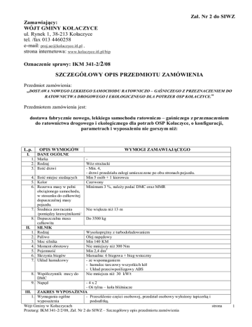 Zał. Nr 2 do SIWZ Zamawiający: WÓJT GMINY KOŁACZYCE ul. Rynek 1, 38-213 Kołaczyce tel. /fax 013 4460258 e-mail: [email protected] , strona internetowa: www.kolaczyce.itl.pl/bip Oznaczenie sprawy: IKM 341-2/2/08 SZCZEGÓŁOWY OPIS PRZEDMIOTU ZAMÓWIENIA Przedmiot zamówienia: „DOSTAWA NOWEGO LEKKIEGO SAMOCHODU RATOWNICZO – GAŚNICZEGO Z PRZEZNACZENIEM DO RATOWNICTWA DROGOWEGO I EKOLOGICZNEGO DLA POTRZEB OSP KOŁACZYCE.” Przedmiotem zamówienia jest: dostawa fabrycznie nowego, lekkiego samochodu ratowniczo – gaśniczego z przeznaczeniem do ratownictwa drogowego i ekologicznego dla potrzeb OSP Kołaczyce, o konfiguracji, parametrach i wyposażeniu nie gorszym niż: L.p. I. OPIS WYMOGÓW DANE OGÓLNE 1. Marka 2. Rodzaj 3. Ilość drzwi 4. Ilość miejsc siedzących 5. Kolor 6. Rezerwa masy w pełni obciążonego samochodu, w stosunku do całkowitej dopuszczalnej masy pojazdu. 7. Średnica zawracania /pomiędzy krawężnikami/ 8. Dopuszczalna masa całkowita II. SILNIK 1. Rodzaj 2. Paliwo 3. Moc silnika 4. Moment obrotowy 5. Pojemność 6. Skrzynia biegów 7. Układ hamulcowy 8. Współczynnik mocy do DMC 9. Napęd WYMOGI ZAMAWIAJĄCEGO Wóz strażacki - Min. 4, - drzwi przedziału załogi umieszczone po obu stronach pojazdu. Min 5 osób + 1 kierowca Czerwony Minimum 3 %, należy podać DMC oraz MMR Nie większa niż 13 m Do 3500 kg Wysokoprężny z turbodoładowaniem Olej napędowy Min 140 KM Nie mniejszy niż 300 Nm Min 2,4 dm3 Manualna: 6 biegowa + bieg wsteczny - ze wspomaganiem - hamulec tarczowy wszystkich kół - Układ przeciwpoślizgowy ABS Nie mniejsza niż 30 kW/t - 4x2 - Oś tylna – koła bliźniacze III. ZAKRES WYPOSAŻENIA 1. Wymagania ogólne - Przeszklenie części osobowej, przedział osobowy wyłożony tapicerką i wyposażenia podsufitką. Wójt Gminy w Kołaczycach strona Przetarg: IKM 341-2/2/08, Zał. Nr 2 do SIWZ – Szczegółowy opis przedmiotu zamówienia 1 2. Zabudowa kontenerowa - Belka świetlna z napisem „STRAŻ” światła stroboskopowe - Generator sygnałów świetlnych i dźwiękowych z możliwością podawania komunikatów słownych - Lampa błyskowa koloru niebieskiego z tyłu samochodu stroboskopowa - Lampy błyskowe zderzakowe stroboskopowe - Wciągarka elektryczna – uciąg ok. 4.5t - Orurowanie zewnętrzne wzmacniające zderzak - Oświetlenie przedziału pasażerskiego włączane z kabiny kierowcy - Oświetlenie zewnętrzne na zabudowie kontenerowej z boku Lewa i Prawa strona oraz tyłu pojazdu - Oświetlenie przedziału ładunkowego włączane z kabiny kierowcy - Dodatkowe gniazdo zapalniczki w kabinie kierowcy - Przenośna lampa halogenowa (szperacz) zasilana z gniazda zapalniczki 12V. - Hak typu kulowego do przyczep o masie całkowitej nie przekraczającej 3500 kg, - Gniazdo elektryczne do przyczepy - znormalizowane gniazdo 12 V, 7biegunowe, - Hermetyczne gniazdo zewnętrzne 220V z przewodem zakończonym listwą rozdzielającą wewnątrz kabiny do zasilania radiotelefonów nasobnych (gniazdo umiejscowione w zabudowie kontenerowej) - Układ ASR/TCS - Układ ABS z EBD - Układ stabilizacji toru jazdy ESP z BTCS* - Pasy bezpieczeństwa 3 punktowe - Podwójny fotel pasażera - 2 gniazdka 12V w kabinie - Poduszka powietrzna dla kierowcy - Sygnalizacja dźwiękowa biegu wstecznego - Radiotelefon przewoźny - Zabudowa kontenerowa z blachy aluminiowej i nierdzewnej (lub innego materiału odpornego na korozję), dach wykonany w formie podestu roboczego pokrytego blachą aluminiową ze wzorem przeciwpoślizgowym. Jego konstrukcja powinna wytrzymać obciążenie masą dwóch strażaków i przewożonego sprzętu. Długość zabudowy minimum 2250 mm. Szerokość rolet bocznych – po 2 rolety na stronę minimum 1000mm każda. Roleta w ścianie tylnej o szerokości minimum 800mm. Rolety aluminiowe pyło-wodo-szczelne. Wysokość zabudowy równa wysokości pojazdu. Półki aluminiowe mocowane do stelaża z miejscem na specjalistyczne wyposażenie pożarnicze: - wysokociśnieniowy agregat wodny z możliwością podawania piany - miejsce i mocowanie na zestaw narzędzi hydraulicznych do ratownictwa technicznego (Lucas Kombi – nożycorozpieracz, pompa, węże ciśnieniowe 15 mb), - miejsce i mocowanie na drabinę aluminiową 3 elementowa składana Drabinex - miejsce i mocowanie na piłę do betonu i stali (Partner K750), - miejsce i mocowanie na pilarkę łańcuchową do drewna (Sthil), - miejsce i mocowanie na gaśnice (3 szt. - 6 kg), - miejsce i mocowanie na kanistry 5 l (4 szt.), - miejsce i mocowanie na sorbenty, - miejsce i mocowanie na pachołki drogowe składane i w całości, - miejsce i mocowanie na hydronetkę (20 l), - miejsce i mocowanie na wąż W52 (2 szt.), - miejsce i mocowanie na sekator do prętów, - miejsce i mocowanie na agregat prądotwórczy 5kV (Honda – waga 80 kg), - miejsce i mocowanie na miotły chodnikowe (2 szt.), szerokość 60 cm - miejsce i mocowanie na pompę półszlamową, - miejsce i mocowanie na Defibrylator AED, - miejsce i mocowanie na latarki Guardsman (2 szt.) - miejsce i mocowanie na Kamizelka Kendricka - miejsce i mocowanie na Deska ortopedyczna Pedi Pack - miejsce i mocowanie na dwa aparaty powietrzne firmy Auer - miejsce i mocowanie na kliny (kauczukowe firmy Horpol) do stabilizacji pojazdu, - miejsce i mocowanie na zestaw PSP R-1, - miejsce i mocowanie na deskę ortopedyczną wraz z klockami firmy Ferno (2 szt.) - miejsce i mocowanie na zestaw szyn Kramera Wójt Gminy w Kołaczycach Przetarg: IKM 341-2/2/08, Zał. Nr 2 do SIWZ – Szczegółowy opis przedmiotu zamówienia strona 2 - miejsce i mocowanie na sprzęt do zabezpieczenia terenu akcji (pachołki, taśma, znaki itp.), - miejsce i mocowanie na podstawowy sprzęt burzący (łom, kilof, łopaty, itp.), Wyszczególniony sprzęt zostanie dostarczony do firmy wykonującej zabudowę pojazdu i przez tą firmę zamontowany w wozie strażackim. Szperacz (reflektor) automatyczny sterowany pilotem. Wykonanie numerów taktycznych pojazdu – 449 R 31 (zgo