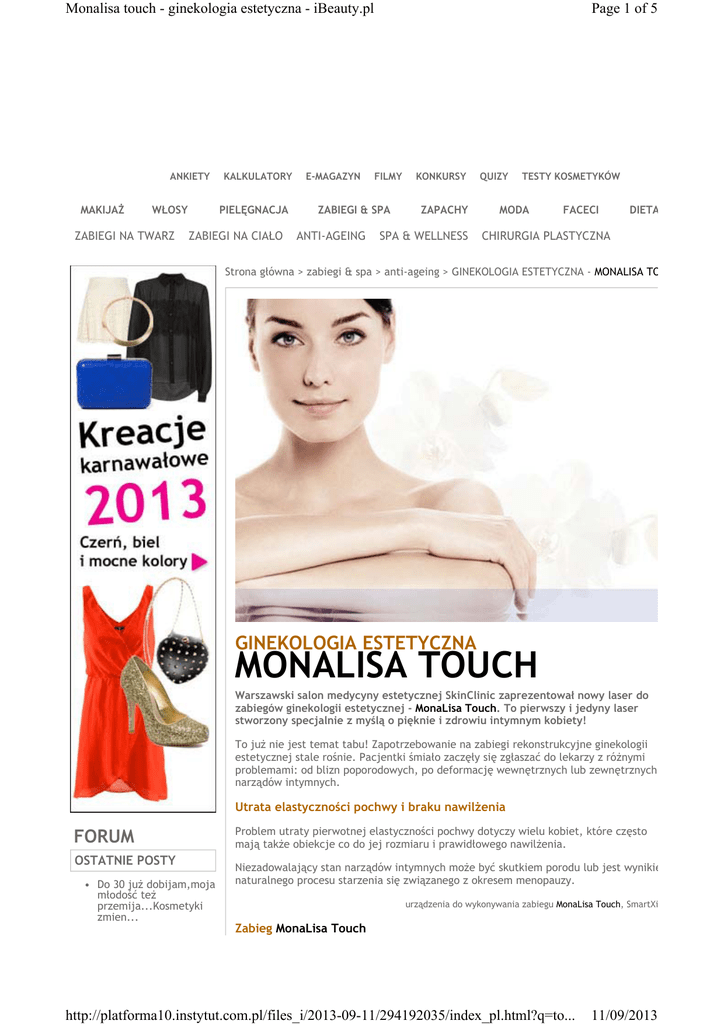 Monalisa touch - ginekologia estetyczna - iBeauty.pl Page 1 of 5 ANKIETY MAKIJAŻ WŁOSY ZABIEGI NA TWARZ KALKULATORY PIELĘGNACJA ZABIEGI NA CIAŁO E-MAGAZYN FILMY ZABIEGI & SPA ANTI-AGEING KONKURSY ZAPACHY SPA & WELLNESS QUIZY TESTY KOSMETYKÓW MODA FACECI DIETA CHIRURGIA PLASTYCZNA Strona główna > zabiegi & spa > anti-ageing > GINEKOLOGIA ESTETYCZNA - MONALISA TO GINEKOLOGIA ESTETYCZNA MONALISA TOUCH Warszawski salon medycyny estetycznej SkinClinic zaprezentował nowy laser do zabiegów ginekologii estetycznej - MonaLisa Touch. To pierwszy i jedyny laser stworzony specjalnie z myślą o pięknie i zdrowiu intymnym kobiety! To już nie jest temat tabu! Zapotrzebowanie na zabiegi rekonstrukcyjne ginekologii estetycznej stale rośnie. Pacjentki śmiało zaczęły się zgłaszać do lekarzy z różnymi problemami: od blizn poporodowych, po deformację wewnętrznych lub zewnętrznych narządów intymnych. Utrata elastyczności pochwy i braku nawilżenia FORUM OSTATNIE POSTY • Do 30 już dobijam,moja młodość też przemija...Kosmetyki zmien... Problem utraty pierwotnej elastyczności pochwy dotyczy wielu kobiet, które często mają także obiekcje co do jej rozmiaru i prawidłowego nawilżenia. Niezadowalający stan narządów intymnych może być skutkiem porodu lub jest wynikie naturalnego procesu starzenia się związanego z okresem menopauzy. urządzenia do wykonywania zabiegu MonaLisa Touch, SmartXi Zabieg MonaLisa Touch http://platforma10.instytut.com.pl/files_i/2013-09-11/294192035/index_pl.html?q=to... 11/09/2013 Monalisa touch - ginekologia estetyczna - iBeauty.pl • Chciałabym otrzymać zestaw 30+ bo jestem w takim pr... • Marzę o gładkich włosach z Dove Nourishing Oil Car... • Fryzura 3 jest idealna,łatwa w ułozeniu, bezpretensjonalna.Na ka... • Marzę o... • Chciałabym właśnie ten zestaw gdyż jest odpowiedni do m... • Marzę o gładkich włosach z Dove Nourishing Oil Car... • Wybieram ta stylizację ponieważ jest troszkę zalotna a j... Kalkulator BMI K płeć M wzrost cm waga kg Page 2 of 5 Zabiegi korygujące te zmiany wykonywane są przy pomocy specjalnej końcówki wyposażonej w skaner, którą wprowadza się do wnętrza waginy. Laser działa bezpośrednio na ścianki pochwy, modelując je, napinając oraz stymulując tkankę i kolagen do regeneracji. Redukuje też suchość dzięki regeneracji i odmłodzeniu ścianek pochwy. W efekcie stają się one bardziej elastyczne i zwarte. Dzięki rekonstrukcji ścianek, zostaje przywrócona funkcjonalność i estetyka waginy sprzed porodu, czy okresu menopauzy, wzrasta poziom nawilżenia. W rezultacie pacjentka odczuwa znaczną poprawę jakości życia zarówno codziennego jak i intymnego. Zabiegi nie wymagają przygotowań, wystarczy konsultacja lekarza ginekologa. Są zupełnie bezbolesne i trwają zaledwie pięć minut. Już trzy dni po procedurze pacjentka może wrócić do aktywności seksualnej. Indywidualne potrzeby pacjentki decydują o ilości przeprowadzonych zabiegów. Czasem wystarczy jednorazowa procedura dla osiągnięcia satysfakcjonującego efektu. W innych przypadkach zabieg należy powtórzyć od 2 do 4 razy, w odstępach od 2 do 4 tygodni. Zabieg ten wykonywany jest zarówno u kobiet bardzo młodych, jak i dojrzałych. Przywrócenie estetyki obszaru intymnego znacznie wpływa na poprawę samopoczucia pacjentki i jej samooceny. Preparat Desirial Zatrzymuje objawy starzenia okolic intymnych, takich jak: suchość pochwy, podrażnienia, trwały dyskomfort, świąt oraz utratę elastyczności. Wstrzyknięcie kwasu hialuronowego w wargi sromowe większe, umożliwia przywrócenie objętości skórze, jej ponowne nawodnienie oraz wygładzenie. Zabieg ten pobudza również aktywność fibroblastów, czyli syntezę kolagenu. Licznik kalorii Wybierz produkt (100 g): Agrest kcal preparat Desirial z kwasem hialuronowym Co myślicie o tego typu zabiegach? Jesteśmy ciekawe waszych opinii! http://platforma10.instytut.com.pl/files_i/2013-09-11/294192035/index_pl.html?q=to... 11/09/2013