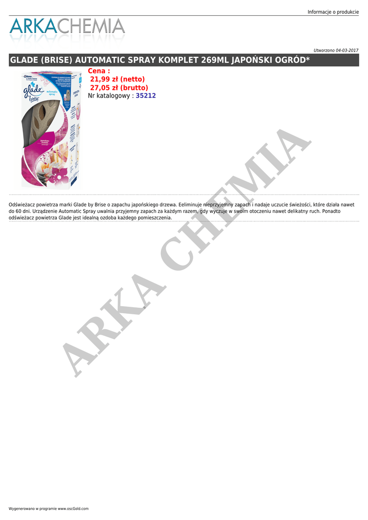 Informacje o produkcie Utworzono 04-03-2017 GLADE (BRISE) AUTOMATIC SPRAY KOMPLET 269ML JAPOŃSKI OGRÓD* Cena : 21,99 zł (netto) 27,05 zł (brutto) H EM IA Nr katalogowy : 35212 AR K A C Odświeżacz powietrza marki Glade by Brise o zapachu japońskiego drzewa. Eeliminuje nieprzyjemny zapach i nadaje uczucie świeżości, które działa nawet do 60 dni. Urządzenie Automatic Spray uwalnia przyjemny zapach za każdym razem, gdy wyczuje w swoim otoczeniu nawet delikatny ruch. Ponadto odświeżacz powietrza Glade jest idealną ozdoba każdego pomieszczenia. Wygenerowano w programie www.oscGold.com