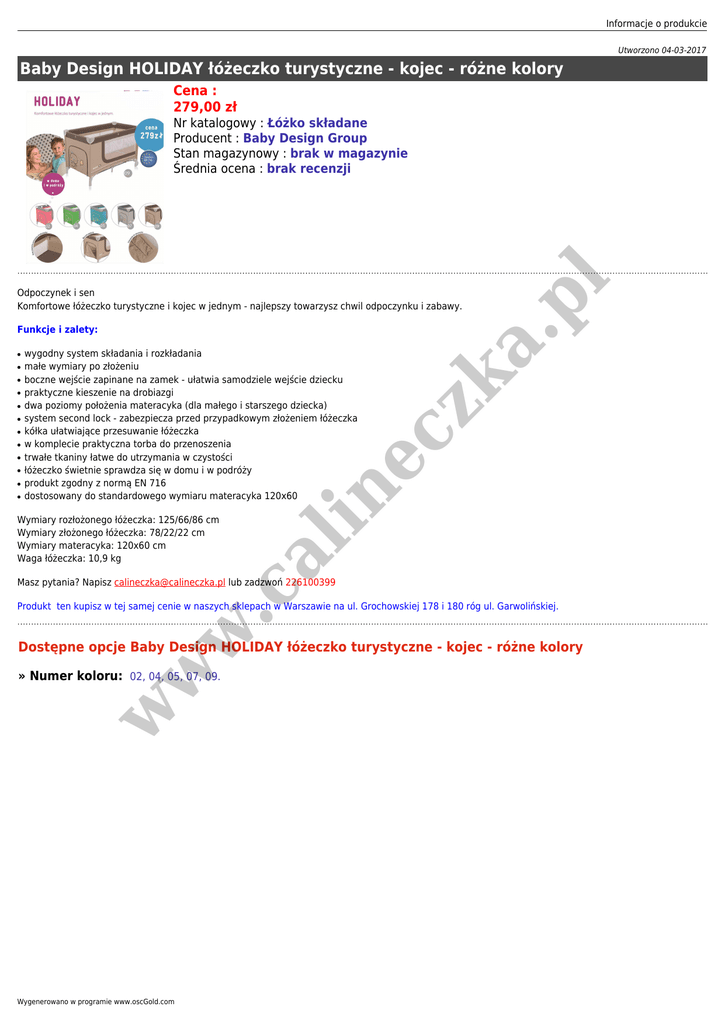 Informacje o produkcie Utworzono 04-03-2017 Baby Design HOLIDAY łóżeczko turystyczne - kojec - różne kolory Cena : 279,00 zł Funkcje i zalety: ● ● ● ● ● ● ● ● ● ● wygodny system składania i rozkładania małe wymiary po złożeniu boczne wejście zapinane na zamek - ułatwia samodziele wejście dziecku praktyczne kieszenie na drobiazgi dwa poziomy położenia materacyka (dla małego i starszego dziecka) system second lock - zabezpiecza przed przypadkowym złożeniem łóżeczka kółka ułatwiające przesuwanie łóżeczka w komplecie praktyczna torba do przenoszenia trwałe tkaniny łatwe do utrzymania w czystości łóżeczko świetnie sprawdza się w domu i w podróży produkt zgodny z normą EN 716 dostosowany do standardowego wymiaru materacyka 120x60 ec ● .c al Wymiary rozłożonego łóżeczka: 125/66/86 cm Wymiary złożonego łóżeczka: 78/22/22 cm Wymiary materacyka: 120x60 cm Waga łóżeczka: 10,9 kg in ● zk a. Odpoczynek i sen Komfortowe łóżeczko turystyczne i kojec w jednym - najlepszy towarzysz chwil odpoczynku i zabawy. pl Nr katalogowy : Łóżko składane Producent : Baby Design Group Stan magazynowy : brak w magazynie Średnia ocena : brak recenzji Masz pytania? Napisz [email protected] lub zadzwoń 226100399 w Produkt ten kupisz w tej samej cenie w naszych sklepach w Warszawie na ul. Grochowskiej 178 i 180 róg ul. Garwolińskiej. w Dostępne opcje Baby Design HOLIDAY łóżeczko turystyczne - kojec - różne kolory w » Numer koloru: 02, 04, 05, 07, 09. Wygenerowano w programie www.oscGold.com