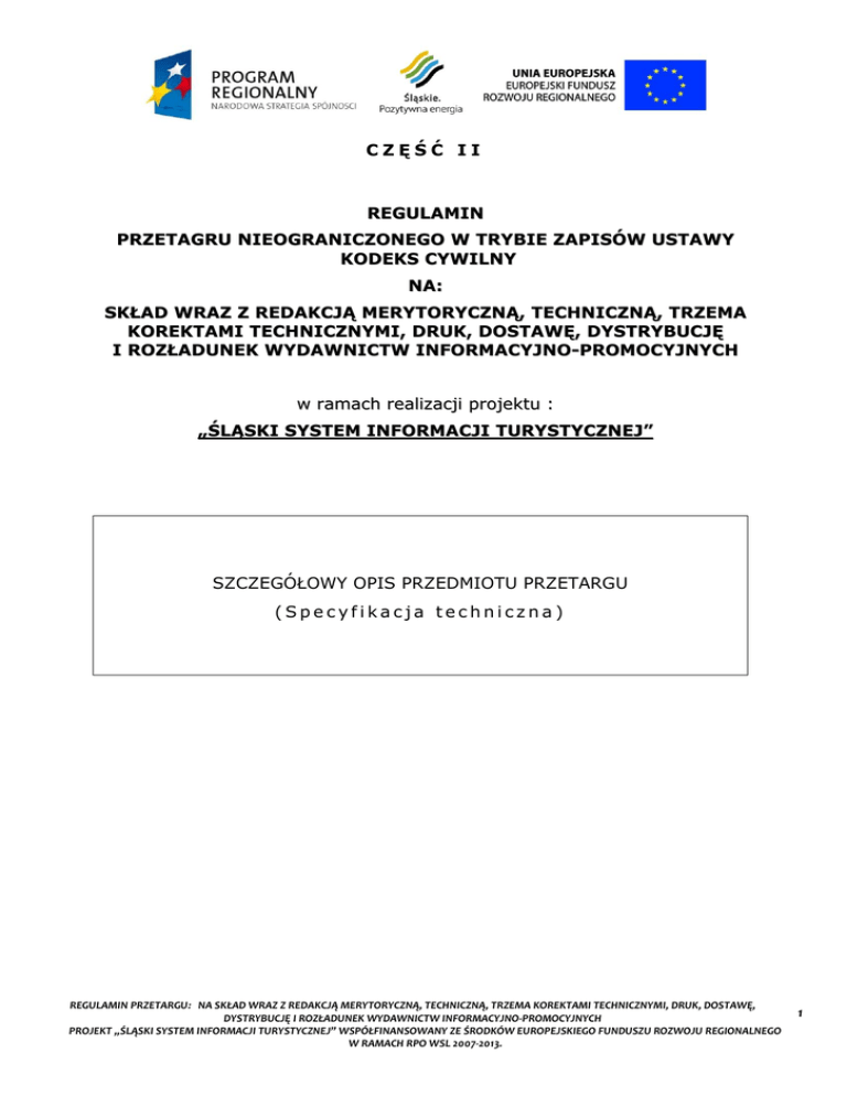 CZĘŚĆ II REGULAMIN PRZETAGRU NIEOGRANICZONEGO W TRYBIE ZAPISÓW USTAWY KODEKS CYWILNY NA : SKŁAD WRAZ Z REDAKCJĄ MERYTORYCZNĄ, TECHNICZNĄ, TRZEMA KOREKTAMI TECHNICZNYMI, DRUK, DOSTAWĘ, DYSTRYBUCJĘ I ROZŁADUNEK WYDAWNICTW INFORMACYJNO-PROMOCYJNYCH w ramach realizacji projektu : „ŚLĄSKI SYSTEM INFORMACJI TURYSTYCZNEJ” SZCZEGÓŁOWY OPIS PRZEDMIOTU PRZETARGU (Specyfikacja techniczna) REGULAMIN PRZETARGU: NA SKŁAD WRAZ Z REDAKCJĄ MERYTORYCZNĄ, TECHNICZNĄ, TRZEMA KOREKTAMI TECHNICZNYMI, DRUK, DOSTAWĘ, DYSTRYBUCJĘ I ROZŁADUNEK WYDAWNICTW INFORMACYJNO-PROMOCYJNYCH PROJEKT „ŚLĄSKI SYSTEM INFORMACJI TURYSTYCZNEJ” WSPÓŁFINANSOWANY ZE ŚRODKÓW EUROPEJSKIEGO FUNDUSZU ROZWOJU REGIONALNEGO W RAMACH RPO WSL 2007-2013. 1 PRZEDMIOT SPECYFIKACJI TECHNICZNEJ (ST) Przedmiotem niniejszej Specyfikacji Technicznej są wymagania dotyczące składu wraz z redakcją merytoryczną i techniczną, trzema korektami technicznymi, druku, dostawy, dystrybucji i rozładunku wydawnictw informacyjno- promocyjnych. 1.2. Zakres prac objętych ST: Ustalenia zawarte w niniejszej specyfikacji dotyczą następujących wydawnictw w podanych niżej nakładach: A). Przewodnika turystycznego po województwie śląskim (w trzech wersjach językowych) – łączny nakład 100 tysięcy egzemplarzy, w tym: Przewodnika turystyczny 50 tys. egzemplarzy po województwie Przewodnika turystycznego 20 tys. egzemplarzy po województwie - Przewodnika turystycznego 30 tys. egzemplarzy B). Informatorów turystycznych egzemplarzy, w tym: po województwie subregionalnych w śląskim śląskim śląskim łącznym w w w języku języku języku nakładzie: polskimangielskim- niemieckim 230 - tysięcy - Informatora turystycznego po Jurze Krakowsko - Częstochowskiej - 50 tys. egzemplarzy - Informatora turystycznego po Metropolii Silesia - 50 tys. egzemplarzy - Informatora turystycznego po Beskidach- 50 tys. egzemplarzy - Informatora turystycznego po Śląsku Cieszyńskim - 45 tys. egzemplarzy - Informatora turystycznego po Subregionie Zachodnim Województwa Śląskiego - 35 tys. egzemplarzy. 1.3. Skład wraz z redakcją techniczną i merytoryczną oraz trzema korektami technicznymi. Powyższe wydawnictwa zostaną poskładane według wzoru layout’u (wraz z przykładową okładką), który stanowi Załącznik nr 1 do specyfikacji technicznej. Zamawiający ma prawo dokonywać korekt graficznych do ww. wzorów, a Oferent zobowiązany jest te korekty i poprawki graficzne nanosić/uwzględnić. Uwaga: przekazany przez Zamawiającego wzór layoutu wydawnictw należy traktować tylko jako wzór graficzny i ogólny wygląd wydawnictw, tzn. do wykonawcy będzie należało stworzenie grafiki wydawnictwa od nowa wg. przedstawionego wzoru, który może ulegać modyfikacjom i poprawkom w trakcie prac nad przedmiotem zamówienia. Teksty wydawnictw, które zostaną złożone przy użyciu wzoru layout’u mają następującą objętość: Lp. Wydawnictwo Ilość stron Średnia ilość znaków ze spacjami na stronę 1 Przewodnik turystyczny po województwie śląskim w języku 103 strony 2233 REGULAMIN PRZETARGU: NA SKŁAD WRAZ Z REDAKCJĄ MERYTORYCZNĄ, TECHNICZNĄ, TRZEMA KOREKTAMI TECHNICZNYMI, DRUK, DOSTAWĘ, DYSTRYBUCJĘ I ROZŁADUNEK WYDAWNICTW INFORMACYJNO-PROMOCYJNYCH PROJEKT „ŚLĄSKI SYSTEM INFORMACJI TURYSTYCZNEJ” WSPÓŁFINANSOWANY ZE ŚRODKÓW EUROPEJSKIEGO FUNDUSZU ROZWOJU REGIONALNEGO W RAMACH RPO WSL 2007-2013. 2 polskim 2 Przewodnik turystyczny po województwie śląskim w języku angielskim 104 strony 2400 3 Przewodnik turystyczny po województwie śląskim w języku niemieckim 112 stron 2323 4 Informator turystyczny po Jurze Krakowsko - Częstochowskiej 43 strony 2121 5 Informator turystyczny po Metropolii Silesia 60 stron 2198 6 Informator turystyczny po Beskidach 49 stron 2192 7 Informator turystyczny po Śląsku Cieszyńskim 57 stron 2065 8 Informator turystyczny po Subregionie Zachodnim 38 stron 2241 Przykładowy tekst Przewodnika turystycznego po województwie śląskim w języku polskim stanowi Załącznik nr 2 do niniejszej specyfikacji technicznej (przewodnik po woj. śląskim). Uwaga: do Wykonawcy należy samodzielne obliczenie docelowej ilości stron każdego z wydawnictw (przewodników, informatorów) wg wytycznych zawartych w niniejszym regulaminie przetargu, wzorze graficznym wydawnictwa, przy uwzględnieniu ilości tekstu maszynopisu (wskazanych powyżej) oraz wytycznych dot. ilości zdjęć i innych elementów graficznych, w tym map zawartych w wydawnictwach. Skład wydawnictw musi uwzględniać wykorzystanie zdjęć atrakcji turystycznych (min. 1 - do 3 lub 4 na stronie wydawnictwa). Zamawiający dysponuje bazą ponad 3300 zdjęć, które przekaże Wykonawcy po podpisaniu umowy do wykorzystania w niniejszym postępowaniu. Baza zdjęć jest uporządkowana. Zdjęcia zostały podzielone na katalogi miast i gmin, a w nich na konkretne atrakcje turystyczne. Wszystkie zdjęcia są wysokiej jakości. Niniejszy przedmiot zamówienia obejmuje również opracowanie graficzne map obrazujących/obejmujących odpowiedni obszar prezentowany w danych rozdziale/podrozdziale lub przewodniku/infomatorze z zaznaczeniem (zindywidualizowanym) graficznym atrakcji i obiektów prezentowanych w danym rozdziale/podrozdziale/przewodniku/informatorze i innych znaczących atrakcji/obiektów wskazanych przez Zamawiającego. Niniejsze mapy powinny zawierać charakterystyczne dla map turystycznych cechy i informacje. Redakcja merytoryczna i techniczna ma zagwarantować spójność treściową i graficzną wszystkich wydawnictw, tak aby stanowiły spójny cykl wydawniczy. Korekty techniczne - muszą zapewnić poprawność językową i wydawnictw. stylistyczną wszystkich REGULAMIN PRZETARGU: NA SKŁAD WRAZ Z REDAKCJĄ MERYTORYCZNĄ, TECHNICZNĄ, TRZEMA KOREKTAMI TECHNICZNYMI, DRUK, DOSTAWĘ, DYSTRYBUCJĘ I ROZŁADUNEK WYDAWNICTW INFORMACYJNO-PROMOCYJNYCH PROJEKT „ŚLĄSKI SYSTEM INFORMACJI TURYSTYCZNEJ” WSPÓŁFINANSOWANY ZE Ś