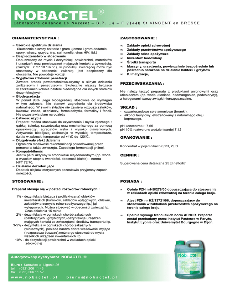 NOBACTEL Laboratoire cellande Le Nuzeret – B.P. 14 – F 71440 St VINCENT en BRESSE CHARAKTERYSTYKA : ZASTOSOWANIE : • Szerokie spektrum działania Skutecznie niszczy bakterie : gram ujemne i gram dodatnie, spory, wirusy, grzyby. (np. salmonellę, virus HIV, itd.) • Bezpieczeństwo w stosowaniu Dopuszczony do mycia i dezynfekcji powierzchni, materiałów i urządzeń oraz pomieszczeń mających kontakt z Ŝywnością. (zarządz.. z 27.10.1975r.), w produkcji zwierzęcej moŜe być stosowany w obecności zwierząt, jest bezpieczny dla otoczenia. Nie powoduje korozji. • Wyjątkowa zdolność penetracji Zawiera środek powierzchniowo-czynny o silnym działaniu zwilŜającym i penetrującym. Skutecznie niszczy bytujące w szczelinach kolonie bakterii niedostępne dla innych środków dezynfekcyjnych. • Biodegradacja W ponad 90% ulega biodegradacji stosownie do wymagań w tym zakresie. Nie stanowi zagroŜenia dla środowiska naturalnego. W swoim składzie nie zawiera rozpuszczalników, kwasów, zasad, utleniaczy, formaldehydu, formaliny i fenoli. Nie pozostawia plam na odzieŜy • Łatwość uŜycia Preparat moŜna stosować do czyszczenia i mycia ręcznego : gąbką, ścierką, szczoteczką oraz mechanicznego za pomocą opryskiwaczy, agregatów nisko i wysoko ciśnieniowych. Aktywność biobójczą zachowuje w wysokiej temperaturze, działa w zakresie temperatur od +4°C do 120°C. • Długotrwały efekt działania Ogranicza moŜliwość rekontaminacji powodowanej przez personel a takŜe zwierzęta. Zapobiega fermentacji gnilnej. • Kompatybilność Jest w pełni aktywny w środowisku niejednorodnym (np. woda o wysokim stopniu twardości, obecność białek) – norma NFT 72i70, • Działanie dezodorujące Dodatek olejków eterycznych pozostawia przyjemny zapach świeŜości. • • • • • • STOSOWANIE : POSIADA : Preparat stosuje się w postaci roztworów roboczych : • Opinię PZH nrHB/279/00 dopuszczająca do stosowania w zakładach opieki zdrowotnej na terenie całego kraju. • Atest PZH nr Hś/13721/96, dopuszczający do stosowania w zakładach przetwórstwa spoŜywczego na terenie całego kraju. • Spełnia wymogi francuskich norm AFNOR. Preparat został przebadany przez Instytut Pasteura w ParyŜu, Instytut Lyonie oraz Uniwersytet Bourgogne w Dijon. 1% - dezynfekcja bieŜąca ( profilaktyczna) obiektów inwentarskich (kurników, zakładów wylęgowych, chlewni, zakładów przemysłu rolno-spoŜywczego itp.) jaj wylęgowych. MoŜna stosować w obecności zwierząt itp. Czas działania 15 minut 2% - dezynfekcja w ogniskach chorób zakaźnych (bakteryjnych i grzybiczych) dezynfekcja urządzeń mających kontakt ze zwierzętami, środków transportu itp. 3-5% - dezynfekcja w ogniskach chorób zakaźnych (wirusowych), posiada bardzo dobre właściwości myjące ( rozpuszcza tłuszcze),moŜna go stosować do mycia wszelkich urządzeń inwentarskich itp. 10% - do dezynfekcji powierzchni w zakładach opieki zdrowotnej Autoryzowany dystrybutor NOBACTEL ® Biuro : Katowice ul. Ligonia 26 tel. (032) 206 11 43 fax. (032) 206 11 52 www.nobactel .pl [email protected] • Zakłady opieki zdrowotnej Zakłady przetwórstwa spoŜywczego Zakłady rolno-spoŜywcze Inwentarz hodowlany Środki transportu Maszyny, urządzenia, powierzchnie bezpośrednio lub pośrednio naraŜone na działanie bakterii i grzybów Klimatyzacje, PRZECIWSKAZANIA : Nie naleŜy łączyć preparatu z produktami anionowymi oraz utleniaczami (np. woda utleniona, nadmanganian, podchloryny), z halogenami tworzy związki nierozpuszczalne. SKŁAD : - czwartorzędowe sole amoniowe (bromki), - alkohol laurylowy, ekstrahowany z naturalnego oleju koprowego, pH koncentratu : 7,65 pH 10% roztworu w wodzie twardej 7,12 OPAKOWANIE : Koncentrat w pojemnikach 0,25l, 2l, 5l CENNIK : Sugerowana cena detaliczna 25 zł netto/litr