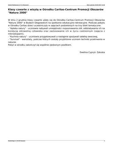 Szkoła Podstawowa nr 8 w Rzeszowie Data wydruku: 04-03-2017 13:44 Klasy czwarte z wizytą w Ośrodku Caritas-Centrum Promocji Obszarów "Natura 2000" W dniu 2 grudnia klasy czwarte udały się do Ośrodka Caritas-Centrum Promocji Obszarów "Natura 2000" w Budach Głogowskich na spotkanie edukacyjno-rekreacyjne. Podczas pobytu w Ośrodku Caritas dzieci uczestniczyły w zajęciach podzielonych na trzy bloki tematyczne: - "Apteka natury" - uczniowie nabywali umiejętności rozpoznawania ziół, oddziaływania ich na kondycję zdrowotną człowieka oraz zastosowanie ich w życiu codziennym (zajęcia z mikroskopami), - "Kuchnia natury" - uczniowie przygotowywali a następnie spożywali sałatkę owocową, - "Survival" - warsztaty, podczas których zostały przybliżone uczniom techniki przetrwania w naturze. Pobyt w ośrodku zakończył się wspólnie zjedzonym posiłkiem. Ewelina Cypryś- Załuska Rudnickiego 2, 35-225 Rzeszów 1