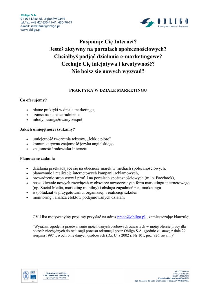 Pasjonuje Cię Internet? Jesteś aktywny na portalach społecznościowych? Chciałbyś podjąć działania e-marketingowe? Cechuje Cię inicjatywa i kreatywność? Nie boisz się nowych wyzwań? PRAKTYKA W DZIALE MARKETINGU Co oferujemy? płatne praktyki w dziale marketingu, szansa na stałe zatrudnienie młody, zaangażowany zespół Jakich umiejętności szukamy? umiejętność tworzenia tekstów, „lekkie pióro” komunikatywna znajomość języka angielskiego znajomość środowiska Internetu Planowane zadania działania przekładające się na obecność marek w mediach społecznościowych, planowanie i realizację internetowych kampanii reklamowych, prowadzenie stron www i profili na portalach społecznościowych (m.in. Facebook), poszukiwanie nowych rozwiązań w obszarze nowoczesnych form marketingu internetowego (np. Social Media, marketing mobilny) i obsługa zagadnień z e- marketingu współudział w przygotowaniu, organizacji i realizacji szkoleń monitoring i analiza efektów podejmowanych działań, CV i list motywacyjny prosimy przysłać na adres [email protected] , zamieszczając klauzulę: "Wyrażam zgodę na przetwarzanie moich danych osobowych zawartych w mojej ofercie pracy dla potrzeb niezbędnych do realizacji procesu rekrutacji przez Obligo S.A. zgodnie z ustawą z dnia 29 sierpnia 1997 r. o ochronie danych osobowych (Dz. U. z 2002 r. Nr 101, poz. 926, ze zm.)"