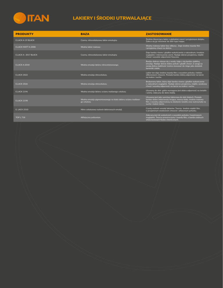 LAKIERY I ŚRODKI UTRWALAJĄCE PRODUKTY BAZA ZASTOSOWANIE E.LACK A-19 BLACK Czarny, nitrocelulozowy lakier emulsyjny Średnio błyszczący lakier o głębokiej czerni i przyjemnym dotyku. Zaleca się go stosować do skór typu nappa. E.LACK MATT A 2008 Wodny lakier matowy Wodny matowy lakier bez silikonu . Daje średnio twardy film i przyjemny chwyt na skórze. E.LACK A- 2017 BLACK Czarny, nitrocelulozowy lakier emulsyjny Daje bardzo równe i gładkie wykończenie o naturalnym, trwałym wyglądzie i intensywnej czerni. Nadaje skórze przyjemny, miękki chwyt i wysokie odporności fizyczne. E.LACK A 2018 Wodna emulsja lakieru nitrocelulozowego. Bardzo dobrze miesza się z wodą i daje z nią bardzo stabilną emulsję. Nadaje skórze dobry połysk i gładki chwyt. Z uwagi na swoją dobrą stabilność można stosować do niego jako dodatek barwniki ciekłe. E.LACK 2022 Wodna emulsja nitrocelulozy. Lakier ten daje średnio twardy film o wysokim połysku i lekkim silikonowym chwycie. Posiada bardzo dobrą odporność na tarcie na mokro i sucho. E.LACK 2026 Wodna emulsja nitrocelulozy. Bezbarwny lakier, który daje bardzo równe i gładkie wykończenie o naturalnym wyglądzie. Nadaje skórze przyjemny, miękki, woskowy chwyt i wysoką odporność na tarcie na mokro i sucho. E.LACK 2196 Wodna emulsja lakieru octanu maślanego celulozy. Używany do skór ,gdzie wymagana jest dobra odporność na światło i aminy. Zalecany do skóry białej. E.LACK 2198 Wodna emulsja pigmentowanego na biało lakieru octanu maślanego celulozy. Używana jest jako warstwa lakierowa do skór białych. Posiada bardzo dobre właściwości kryjące, tworzy biały, średnio matowy film z wysoką odpornością na działanie światła oraz wytrzymały na suche i mokre tarcie. E. LACK 2510 Nitro-celulozowy roztwór lakierowych emulsji. Czysty roztwór emulsji lakierów. Tworzy średnio miękki film, o przyjemnym woskowym chwycie i atłasowym połysku. TOP L 718 Alifatyczny poliuretan. Zalecany jest do wykończeń o wysokim połysku i kazeinowym wyglądzie. Tworzy przezroczysty i twardy film, o bardzo dobrych właściwościach fizyko-chemicznych.