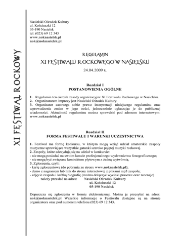 XI FESTIWAL ROCKOWY Nasielski Ośrodek Kultury ul. Kościuszki 12 05-190 Nasielsk tel. (023) 69 12 343 www.noknasielsk.pl [email protected] REGULAMIN XI FESTIWALU ROCKOWEGO W NASIELSKU 24.0 24.04 .04.2009 .2009 r. Rozdział I POSTANOWIENIA OGÓLNE 1. Regulamin ten określa zasady organizacyjne XI Festiwalu Rockowego w Nasielsku. 2. Organizatorem imprezy jest Nasielski Ośrodek Kultury. 3. Organizator zastrzega sobie prawo interpretacji niniejszego regulaminu oraz wprowadzenia zmian w jego treści, jednocześnie ogłaszając je do publicznej wiadomości. Aktualność regulaminu moŜna sprawdzić pod adresem internetowym: www.noknasielsk.pl Rozdział II FORMA FESTIWALU I WARUNKI UCZESTNICTWA 1. Festiwal ma formę konkursu, w którym mogą wziąć udział amatorskie zespoły muzyczne uprawiające wszystkie gatunki szeroko pojętej muzyki rockowej. 2. Zespoły, które zdecydują się na udział w konkursie: - nie mogą posiadać na swoim koncie profesjonalnego wydawnictwa fonograficznego; - nie mogą być związane kontraktem płytowym z Ŝadną wytwórnią. 3. Zgłoszenia, czyli: - kartę zgłoszeniową (do pobrania ze strony www.noknasielsk.pl); - demo z nagraniem lub link do strony internetowej z plikami mp3 zespołu; - zdjęcie zespołu i krótką biografię (moŜna dołączyć wycinki prasowe oraz recenzje) naleŜy przesłać na adres: Nasielski Ośrodek Kultury ul. Kościuszki 12 05-190 Nasielsk Dopuszcza się zgłoszenia w formie elektronicznej. MoŜna je przesyłać na adres: [email protected] Wszelkie informacje o Festiwalu dostępne są na stronie organizatora oraz pod numerem telefonu (023) 69 12 343. XI FESTIWAL ROCKOWY 4. Termin nadsyłania zgłoszeń upływa 14 kwietnia (decyduje data stempla pocztowego). 5. Liczy się kolejność zgłoszeń. Liczba miejsc w konkursie jest ograniczona. 6. Zgłoszenia niekompletne lub złoŜone po terminie zostaną odrzucone z przyczyn formalnych. 7. O zakwalifikowaniu do konkursu decyduje Organizator. 8. Lista zakwalifikowanych zespołów zostanie opublikowana na stronie internetowej www.noknasielsk.pl. Ponadto, zespoły zostaną powiadomione telefonicznie o zakwalifikowaniu się do konkursu. 9. O kolejności występowania zespołów na estradzie festiwalowej decyduje losowanie, które odbędzie się bezpośrednio przed koncertem. 10. Prosimy o przygotowanie 15 minut materiału do prezentacji na Ŝywo, z tym Ŝe łączny czas dla zespołu na scenie razem z instalacja i deinstalacją nie moŜe przekroczyć 25 minut. 11. Zespoły konkursowe ocenia Jury powołane przez Organizatora. Jury zastrzega sobie prawo do podziału nagród. Werdykt Jury jest nieodwołalny. Rozdział III ORGANIZATOR ZAPEWNIA 1. Profesjonalny sprzęt nagłośnieniowy wraz z obsługą sceny. 2. Ze względu na indywidualne wymagania zespołów, organizator zapewnia tylko podstawowy back line. 3. Organizator zapewnia nagrody, które przyzna Jury. Wartość nagród ustala się w wysokości: - za I miejsce – 1100 zł - za II miejsce – 600 zł - za III miejsce – 300 zł Rozdział IV POSTANOWIENIA KOŃCOWE 1. W przypadku zaistnienia szczególnych okoliczności Organizator zastrzega sobie prawo do zmian w regulaminie. 2. Organizator nie zwraca nadesłanych przez zespół materiałów.