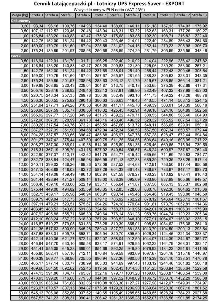 Cennik Latającepaczki.pl - Lotniczy UPS Express Saver - EXPORT Wszystkie ceny w PLN netto (VAT 23%) Waga (kg) Strefa 3 Strefa 4 Strefa 5 Strefa 6 Strefa 7 Strefa 8 Strefa 9 Strefa 10 Strefa 11 Strefa 12 Strefa 13 Dokumenty 0,20 93,34 96,18 100,76 104,96 134,40 138,60 146,11 151,18 157,13 174,03 175,92 0,50 107,12 112,52 120,46 120,48 148,04 148,31 153,32 162,63 163,31 177,26 180,27 1,00 126,84 133,20 140,88 142,47 175,32 175,68 183,85 192,30 198,71 216,82 222,40 1,50 142,75 152,00 161,24 164,42 200,43 203,46 214,01 222,40 234,89 256,43 264,60 2,00 159,00 170,79 181,60 187,04 225,55 231,02 244,16 252,14 270,23 295,98 306,73 2,50 175,24 189,89 201,97 208,98 250,68 258,59 274,29 281,79 305,59 335,55 348,48 Paczki 0,50 116,94 122,91 131,70 131,71 196,25 202,40 210,92 214,04 222,96 236,42 247,82 1,00 126,84 133,20 140,88 142,47 205,29 209,83 221,80 225,06 239,29 253,00 267,21 1,50 142,75 152,00 161,24 164,42 231,69 238,01 251,49 256,44 272,43 290,45 305,54 2,00 159,00 170,79 181,60 187,04 257,67 265,57 281,65 288,33 305,63 328,31 343,35 2,50 175,24 189,89 201,97 208,98 283,63 293,12 311,79 319,67 338,85 366,14 381,21 3,00 189,89 208,65 220,43 229,04 304,87 313,75 340,18 353,65 375,39 402,69 417,31 3,50 205,16 226,16 238,92 249,40 332,13 337,91 366,90 382,49 407,32 437,98 453,03 4,00 220,75 243,34 257,35 269,78 356,36 362,49 393,16 411,73 439,22 473,28 488,76 4,50 236,36 260,55 275,82 290,13 380,63 386,63 419,43 440,55 471,14 508,12 524,45 5,00 251,94 277,71 294,28 310,50 404,89 411,17 445,70 469,39 503,01 543,39 560,19 5,50 258,96 287,59 305,77 338,53 418,32 425,45 462,91 489,18 524,16 564,89 582,56 6,00 265,92 297,77 317,20 349,99 431,75 439,22 479,71 508,55 544,86 586,40 604,93 6,50 272,96 307,35 328,99 361,78 445,16 453,46 496,52 528,32 565,52 607,54 627,29 7,00 280,28 317,54 340,76 373,21 458,59 467,66 513,72 548,11 586,65 629,01 650,10 7,50 287,27 327,39 351,90 384,68 472,04 482,34 530,53 567,50 607,34 650,57 672,44 8,00 294,28 337,57 363,66 396,47 485,88 496,97 547,78 587,28 628,47 672,44 694,84 8,50 301,27 347,42 375,44 407,59 499,75 511,25 564,56 606,64 649,16 693,95 717,22 9,00 308,27 357,30 386,91 419,38 514,08 525,89 581,36 626,46 669,85 715,94 739,59 9,50 315,31 367,19 398,70 431,15 527,92 540,54 598,57 646,24 690,97 737,87 762,40 10,00 322,90 377,37 410,17 442,62 541,79 554,77 615,42 665,56 711,69 759,83 784,77 11,00 332,78 388,84 424,47 455,98 556,95 571,13 627,88 689,29 729,35 788,26 817,44 12,00 340,11 399,02 436,26 469,36 572,09 587,52 644,68 712,91 756,50 817,44 850,59 13,00 347,12 408,88 448,03 482,72 587,26 604,33 661,48 736,57 783,67 847,17 883,73 14,00 354,14 419,08 459,49 496,10 602,84 621,58 678,27 760,23 810,82 876,41 916,43 15,00 361,44 428,94 471,27 509,14 618,00 638,39 695,09 783,90 837,99 905,66 949,57 16,00 368,46 439,10 483,06 522,19 633,17 655,64 711,87 807,56 865,13 935,37 982,68 17,00 375,44 449,00 494,82 535,59 648,35 672,85 728,68 830,78 892,30 964,62 1015,36 18,00 382,75 459,17 505,96 548,94 663,91 690,14 745,46 854,46 919,45 993,88 1048,50 19,00 389,79 469,04 517,75 562,31 679,12 706,92 762,22 878,12 946,64 1023,12 1081,67 20,00 397,11 479,21 529,51 575,67 694,26 724,18 779,04 901,81 973,79 1052,81 1114,36 21,00 403,45 488,53 543,88 591,86 724,56 758,37 813,95 942,01 1024,81 1106,31 1175,90 22,00 407,92 495,88 555,71 605,30 740,64 776,14 831,23 959,76 1044,74 1129,23 1205,34 23,00 412,10 503,24 567,22 618,39 757,20 793,52 848,10 977,91 1064,67 1153,02 1235,15 24,00 416,87 510,27 579,05 631,83 773,28 810,39 865,01 995,63 1084,62 1176,38 1264,10 25,00 421,36 517,63 590,90 645,28 789,43 827,72 881,88 1013,79 1104,50 1200,13 1293,54 26,00 437,68 533,01 609,78 658,71 805,94 840,70 895,69 1026,34 1124,46 1221,34 1323,37 27,00 442,14 540,36 621,27 672,14 822,07 858,04 912,59 1044,07 1144,39 1244,67 1352,77 28,00 446,64 547,70 633,10 685,58 838,17 874,91 929,95 1062,22 1164,79 1268,01 1382,17 29,00 451,41 555,05 645,28 699,01 854,69 892,25 946,80 1079,92 1184,22 1291,81 1411,55 30,00 455,90 562,41 657,10 712,11 870,84 909,59 963,69 1097,67 1204,16 1315,16 1440,97 31,00 460,39 569,77 668,96 725,55 886,94 927,36 980,56 1115,39 1224,10 1338,51 1470,78 32,00 465,17 577,14 680,77 738,99 903,03 944,69 997,43 1133,12 1244,46 1361,82 1500,18 33,00 469,66 584,50 692,62 752,45 919,56 962,43 1014,30 1151,25 1263,94 1385,64 1529,58 34,00 474,13 591,86 704,77 765,87 932,16 979,77 1031,20 1169,00 1283,87 1408,54 1559,00 35,00 478,93 599,20 716,60 779,30 944,80 997,52 1048,09 1186,72 1303,76 1432,29 1588,38 40,00 500,99 635,04 761,68 832,06 1010,08 1063,36 1127,27 1277,98 1412,07 1549,91 1734,97 45,00 523,07 670,57 807,15 884,87 1075,38 1129,20 1206,90 1369,64 1520,38 1667,10 1881,52 50,00 545,13 706,06 852,86 937,62 1140,65 1195,49 1285,65 1460,85 1628,24 1784,23 2027,68 55,00 567,53 741,23 898,31 990,41 1206,42 1261,33 1365,28 1552,07 1736,56 1901,85 2174,25 60,00 589,62 777,05 943,41 1043,20 1271,72 1327,18 1444,48 1643,73 1844,90 2019,04 2320,83 65,00 611,67 812,58 988,82 1096,30 1336,98 1393,02 1524,15 1734,97 1952,71 2136,17 2467,37 70,00 634,08 848,07 1034,25 1149,08 1402,30 1458,88 1603,29 1826,20 2061,04 2253,81 2613,11