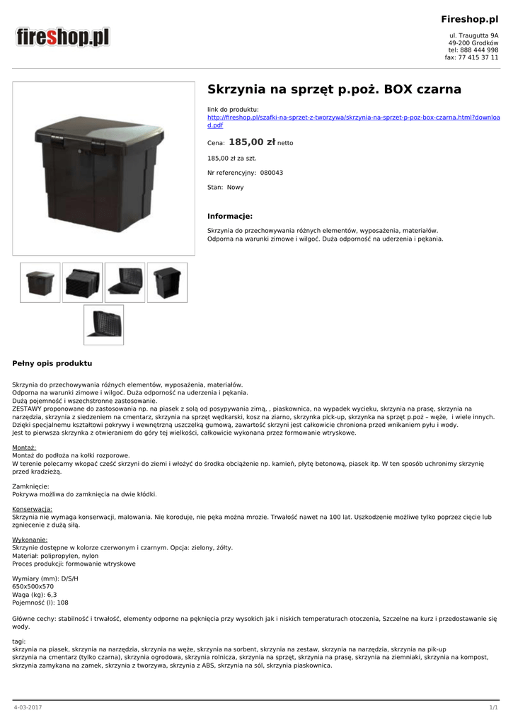 Fireshop.pl ul. Traugutta 9A 49-200 Grodków tel: 888 444 998 fax: 77 415 37 11 Skrzynia na sprzęt p.poż. BOX czarna link do produktu: http://fireshop.pl/szafki-na-sprzet-z-tworzywa/skrzynia-na-sprzet-p-poz-box-czarna.html?downloa d.pdf Cena: 185,00 zł netto 185,00 zł za szt. Nr referencyjny: 080043 Stan: Nowy Informacje: Skrzynia do przechowywania różnych elementów, wyposażenia, materiałów. Odporna na warunki zimowe i wilgoć. Duża odporność na uderzenia i pękania. Pełny opis produktu Skrzynia do przechowywania różnych elementów, wyposażenia, materiałów. Odporna na warunki zimowe i wilgoć. Duża odporność na uderzenia i pękania. Dużą pojemność i wszechstronne zastosowanie. ZESTAWY proponowane do zastosowania np. na piasek z solą od posypywania zimą, , piaskownica, na wypadek wycieku, skrzynia na prasę, skrzynia na narzędzia, skrzynia z siedzeniem na cmentarz, skrzynia na sprzęt wędkarski, kosz na ziarno, skrzynka pick-up, skrzynka na sprzęt p.poż – węże, i wiele innych. Dzięki specjalnemu kształtowi pokrywy i wewnętrzną uszczelką gumową, zawartość skrzyni jest całkowicie chroniona przed wnikaniem pyłu i wody. Jest to pierwsza skrzynka z otwieraniem do góry tej wielkości, całkowicie wykonana przez formowanie wtryskowe. Montaż: Montaż do podłoża na kołki rozporowe. W terenie polecamy wkopać cześć skrzyni do ziemi i włożyć do środka obciążenie np. kamień, płytę betonową, piasek itp. W ten sposób uchronimy skrzynię przed kradzieżą. Zamknięcie: Pokrywa możliwa do zamknięcia na dwie kłódki. Konserwacja: Skrzynia nie wymaga konserwacji, malowania. Nie koroduje, nie pęka można mrozie. Trwałość nawet na 100 lat. Uszkodzenie możliwe tylko poprzez cięcie lub zgniecenie z dużą siłą. Wykonanie: Skrzynie dostępne w kolorze czerwonym i czarnym. Opcja: zielony, żółty. Materiał: polipropylen, nylon Proces produkcji: formowanie wtryskowe Wymiary (mm): D/S/H 650x500x570 Waga (kg): 6,3 Pojemność (l): 108 Główne cechy: stabilność i trwałość, elementy odporne na pęknięcia przy wysokich jak i niskich temperaturach otoczenia, Szczelne na kurz i przedostawanie się wody. tagi: skrzynia na piasek, skrzynia na narzędzia, skrzynia na węże, skrzynia na sorbent, skrzynia na zestaw, skrzynia na narzędzia, skrzynia na pik-up skrzynia na cmentarz (tylko czarna), skrzynia ogrodowa, skrzynia rolnicza, skrzynia na sprzęt, skrzynia na prasę, skrzynia na ziemniaki, skrzynia na kompost, skrzynia zamykana na zamek, skrzynia z tworzywa, skrzynia z ABS, skrzynia na sól, skrzynia piaskownica. 4-03-2017 1/1