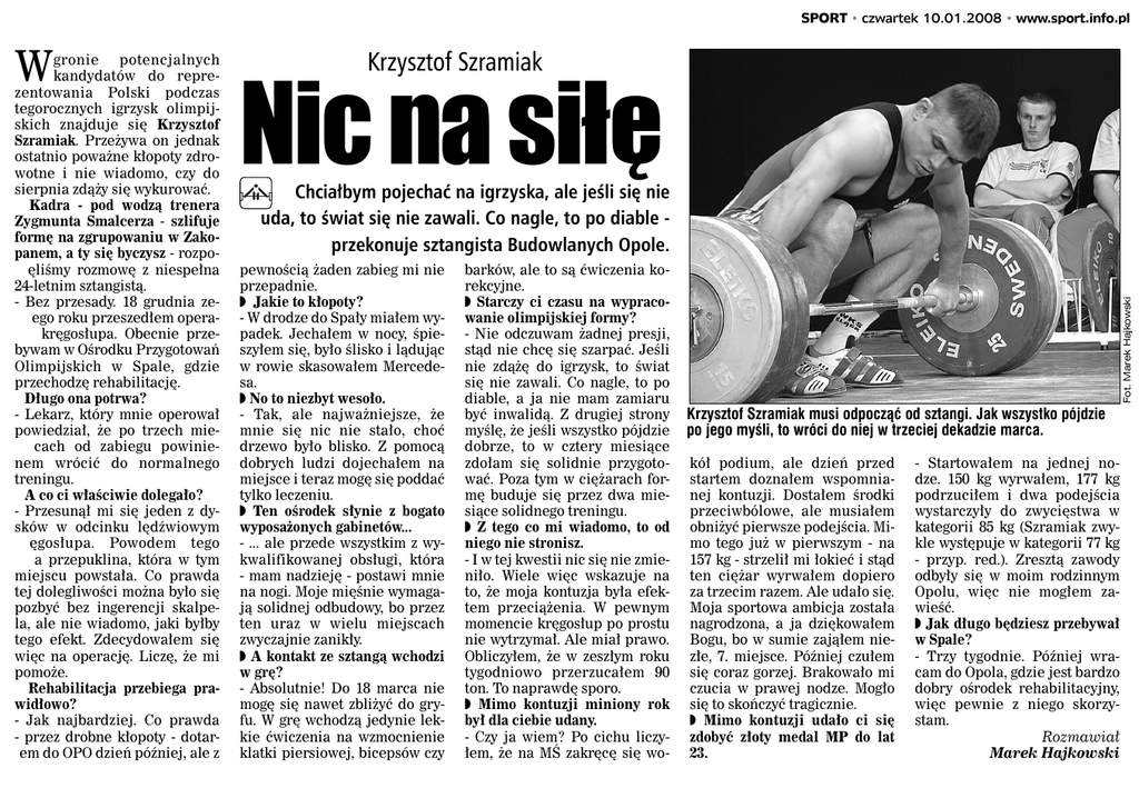 SPORT • czwartek 10.01.2008 • www.sport.info.pl gronie potencjalnych kandydatów do reprezentowania Polski podczas tegorocznych igrzysk olimpijskich znajduje się Krzysztof Szramiak. Przeżywa on jednak ostatnio poważne kłopoty zdrowotne i nie wiadomo, czy do sierpnia zdąży się wykurować. Kadra - pod wodzą trenera Zygmunta Smalcerza - szlifuje formę na zgrupowaniu w Zakopanem, a ty się byczysz - rozpoęliśmy rozmowę z niespełna 24-letnim sztangistą. - Bez przesady. 18 grudnia zeego roku przeszedłem operakręgosłupa. Obecnie przebywam w Ośrodku Przygotowań Olimpijskich w Spale, gdzie przechodzę rehabilitację. Długo ona potrwa? - Lekarz, który mnie operował powiedział, że po trzech miecach od zabiegu powinienem wrócić do normalnego treningu. A co ci właściwie dolegało? - Przesunął mi się jeden z dysków w odcinku lędźwiowym ęgosłupa. Powodem tego a przepuklina, która w tym miejscu powstała. Co prawda tej dolegliwości można było się pozbyć bez ingerencji skalpela, ale nie wiadomo, jaki byłby tego efekt. Zdecydowałem się więc na operację. Liczę, że mi pomoże. Rehabilitacja przebiega prawidłowo? - Jak najbardziej. Co prawda - przez drobne kłopoty - dotarem do OPO dzień później, ale z Krzysztof Szramiak Nic na siłę Chciałbym pojechać na igrzyska, ale jeśli się nie uda, to świat się nie zawali. Co nagle, to po diable przekonuje sztangista Budowlanych Opole. pewnością żaden zabieg mi nie przepadnie. ◗ Jakie to kłopoty? - W drodze do Spały miałem wypadek. Jechałem w nocy, śpieszyłem się, było ślisko i lądując w rowie skasowałem Mercedesa. ◗ No to niezbyt wesoło. - Tak, ale najważniejsze, że mnie się nic nie stało, choć drzewo było blisko. Z pomocą dobrych ludzi dojechałem na miejsce i teraz mogę się poddać tylko leczeniu. ◗ Ten ośrodek słynie z bogato wyposażonych gabinetów... - ... ale przede wszystkim z wykwalifikowanej obsługi, która - mam nadzieję - postawi mnie na nogi. Moje mięśnie wymagają solidnej odbudowy, bo przez ten uraz w wielu miejscach zwyczajnie zanikły. ◗ A kontakt ze sztangą wchodzi w grę? - Absolutnie! Do 18 marca nie mogę się nawet zbliżyć do gryfu. W grę wchodzą jedynie lekkie ćwiczenia na wzmocnienie klatki piersiowej, bicepsów czy barków, ale to są ćwiczenia korekcyjne. ◗ Starczy ci czasu na wypracowanie olimpijskiej formy? - Nie odczuwam żadnej presji, stąd nie chcę się szarpać. Jeśli nie zdążę do igrzysk, to świat się nie zawali. Co nagle, to po diable, a ja nie mam zamiaru być inwalidą. Z drugiej strony myślę, że jeśli wszystko pójdzie dobrze, to w cztery miesiące zdołam się solidnie przygotować. Poza tym w ciężarach formę buduje się przez dwa miesiące solidnego treningu. ◗ Z tego co mi wiadomo, to od niego nie stronisz. - I w tej kwestii nic się nie zmieniło. Wiele więc wskazuje na to, że moja kontuzja była efektem przeciążenia. W pewnym momencie kręgosłup po prostu nie wytrzymał. Ale miał prawo. Obliczyłem, że w zeszłym roku tygodniowo przerzucałem 90 ton. To naprawdę sporo. ◗ Mimo kontuzji miniony rok był dla ciebie udany. - Czy ja wiem? Po cichu liczyłem, że na MŚ zakręcę się wo- Fot. Marek Hajkowski W Krzysztof Szramiak musi odpocząć od sztangi. Jak wszystko pójdzie po jego myśli, to wróci do niej w trzeciej dekadzie marca. kół podium, ale dzień przed startem doznałem wspomnianej kontuzji. Dostałem środki przeciwbólowe, ale musiałem obniżyć pierwsze podejścia. Mimo tego już w pierwszym - na 157 kg - strzelił mi łokieć i stąd ten ciężar wyrwałem dopiero za trzecim razem. Ale udało się. Moja sportowa ambicja została nagrodzona, a ja dziękowałem Bogu, bo w sumie zająłem niezłe, 7. miejsce. Później czułem się coraz gorzej. Brakowało mi czucia w prawej nodze. Mogło się to skończyć tragicznie. ◗ Mimo kontuzji udało ci się zdobyć złoty medal MP do lat 23. - Startowałem na jednej nodze. 150 kg wyrwałem, 177 kg podrzuciłem i dwa podejścia wystarczyły do zwycięstwa w kategorii 85 kg (Szramiak zwykle występuje w kategorii 77 kg - przyp. red.). Zresztą zawody odbyły się w moim rodzinnym Opolu, więc nie mogłem zawieść. ◗ Jak długo będziesz przebywał w Spale? - Trzy tygodnie. Później wracam do Opola, gdzie jest bardzo dobry ośrodek rehabilitacyjny, więc pewnie z niego skorzystam. Rozmawiał Marek Hajkowski