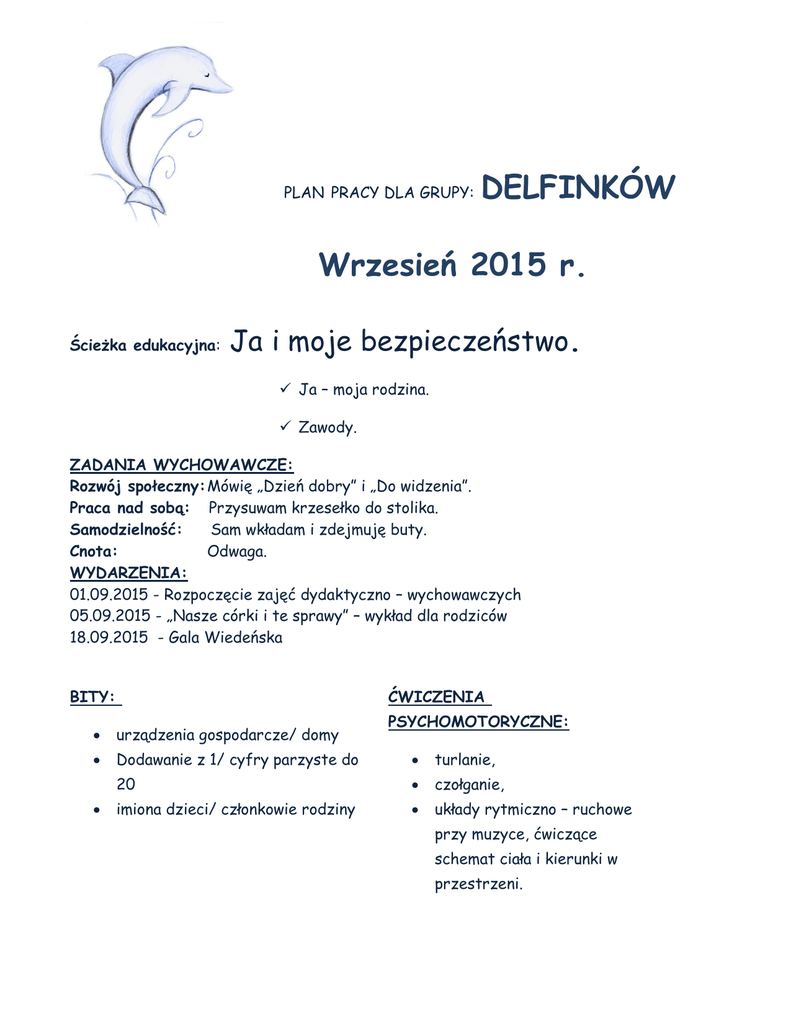 PLAN PRACY DLA GRUPY: DELFINKÓW Wrzesień 2015 r. Ścieżka edukacyjna: Ja i moje bezpieczeństwo. Ja – moja rodzina. Zawody. ZADANIA WYCHOWAWCZE: Rozwój społeczny: Mówię „Dzień dobry” i „Do widzenia”. Praca nad sobą: Przysuwam krzesełko do stolika. Samodzielność: Sam wkładam i zdejmuję buty. Cnota: Odwaga. WYDARZENIA: 01.09.2015 - Rozpoczęcie zajęć dydaktyczno – wychowawczych 05.09.2015 - „Nasze córki i te sprawy” – wykład dla rodziców 18.09.2015 - Gala Wiedeńska BITY: ĆWICZENIA PSYCHOMOTORYCZNE: urządzenia gospodarcze/ domy Dodawanie z 1/ cyfry parzyste do turlanie, 20 czołganie, imiona dzieci/ członkowie rodziny układy rytmiczno – ruchowe przy muzyce, ćwiczące schemat ciała i kierunki w przestrzeni. ĆWICZENIA LOGOPEDYCZNE: wahadło – kierowanie języka w kąciki ust bez dotykania warg i zębów, wysuwanie języka na zewnątrz i cofanie w głąb przy bardzo szeroko otwartej jamie ustnej, oblizywanie zewnętrznej i wewnętrznej powierzchni zębów ruchem okrężnym. PIOSENKA: „Wesołe przedszkole” (sł. i muz. T. Wójcik) Kiedy słońce świeci I gdy deszczyk pada, Idzie do przedszkola Wesoła gromada. Tupią małe nóżki tupu-tupu tup. Raźno do przedszkola idzie mały zuch. Klocki, misie, lalki Czekają od rana, Uśmiechem nas wita Pani ukochana. Bawimy się w zgodzie zawsze ty i ja. Tańczymy wesoło hopsa, hopsa sa. WIERSZE: M. Terlikowska „Każdy sprząta po sobie” W naszym domku, w czterech kątach każdy sam po sobie sprząta. Pierwszy kącik jest Elżbietki, która właśnie sprząta kredki. Drugi kącik jest Agatki, chowa szmatki do szufladki. Trzeci kącik jest Rozalki, która sprząta pokój lalki. W czwartym kącie, kącie Janki ktoś wycinał wycinanki. Na podłodze koło szafki, ktoś rozrzucił jakieś skrawki. Ktoś zostawił klej otwarty W zaśmieconym kącie czwartym... Kto tu sprzątnie, moje dzieci? Oczywiście ten, co śmiecił! WIERSZ LOGOPEDYCZNY: M. Strzałkowska „Królik” Kurkiem krany kręci kruk, kroplą tranu brudząc bruk, a przy kranie, robiąc pranie, królik gra na fortepianie. ZAGADKI: 1. Czasem na piechotę, czasem na rowerze, ciągle jednak w pracy, a nie na spacerze. Nosi w swojej torbie przeróżne przesyłki, jeśli nie ma ciebie w domu, włoży je do skrzynki (listonosz). 2. Nawet kiedy jest zmęczony, odwagi mu starczy. Wóz ma duży i czerwony, z ogniem dzielnie walczy (strażak). 3. Jaki zawód ma ten pan, co naprawi każdy kran? (hydraulik). 4. Deska, młotek, zręczne ręce zrobią mebli coraz więcej (stolarz). AUDYCJE MUZYCZNE: Jan Sebastian Bach – Koncert na 4 klawesyny a-moll cz. III Franciszek Schubert – Pieśń “Król Olch” JĘZYK ANGIELSKI: TEMATY SŁOWNICTWO I GRAMATYKA BITY Hello song I’m good. I’m great. I’m wonderful. I’m tired. I’m hungry. I’m not so good. Classroom language Good morning. Good afternoon. Goodbye. Look. Listen. Point. Cut out. Stick. Line up. Let’s sing a song/ Let’s play a game. May I drink some water? May I go to the toilet, please? Thank you. I’m sorry. How do we say”___” in English? Come to the blackboard. Can you repeat please? I don’t understand. Hello song Classroom language Colors Color song Blue sky, green grass, yellow daisies, red daisies, pink and orange sunsets, white – snowy white, black of the night, brown of the earth, blue – blueberry pie, green cabbage and broccoli, yellow corn, orange carrots, white mashed potato, brown gravy stew, red strawberries, purple grapes, pink grapefruit Stories The toy soldier, School bus trip, Nature trail ♫SONGS♫ • • Hello song • Goodbye song If you’re happy and you know it… • The hokey pokey shake • One Little finge
