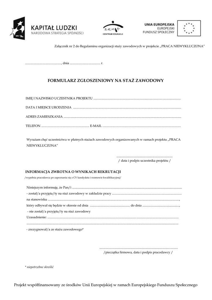 Załącznik nr 2 do Regulaminu organizacji staży zawodowych w projekcie „PRACA NIEWYKLUCZONA” ............................................., dnia ...................................... r. FORMULARZ ZGŁOSZENIOWY NA STAŻ ZAWODOWY IMIĘ I NAZWISKO UCZESTNIKA PROJEKTU ............................................................................................................. DATA I MIEJSCE URODZENIA ....................................................................................................................................... ADRES ZAMIESZKANIA ................................................................................................................................................... TELEFON ............................................................ E-MAIL .................................................................................................. Wyrażam chęć uczestnictwa w płatnych stażach zawodowych organizowanych w ramach projektu „PRACA NIEWYKLUCZONA” ...................................................................... / data i podpis uczestnika projektu / INFORMACJA ZWROTNA O WYNIKACH REKRUTACJI /wypełnia pracodawca po zapoznaniu się z CV kandydata i rozmowie kwalifikacyjnej/ Niniejszym informuję, że Pan/i ......................................................................................................................................... - został/a przyjęta/ty na staż zawodowy w zakładzie pracy ....................................................................................... na stanowisku ...................................................................................................................................................................., który odbywał się będzie w okresie od dnia .................................................. do dnia .............................................., - nie został/a przyjęta/ty na staż zawodowy Uzasadnienie: ............................................................................................................... ..................................................... .............................................................................................................................................................................................. - zrezygnował/a ze stażu zawodowego* .................................................................................................. /pieczątka firmowa, data i podpis pracodawcy / * niepotrzebne skreślić Projekt współfinansowany ze środków Unii Europejskiej w ramach Europejskiego Funduszu Społecznego
