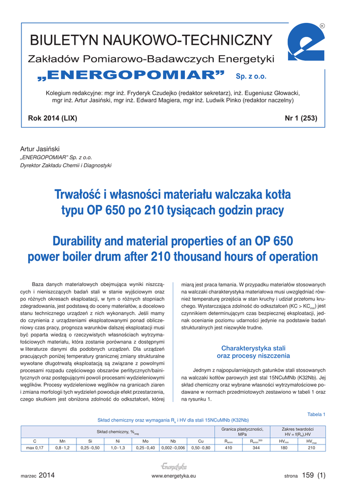 Trwałość i własności materiału walczaka kotła typu OP 650 po 210