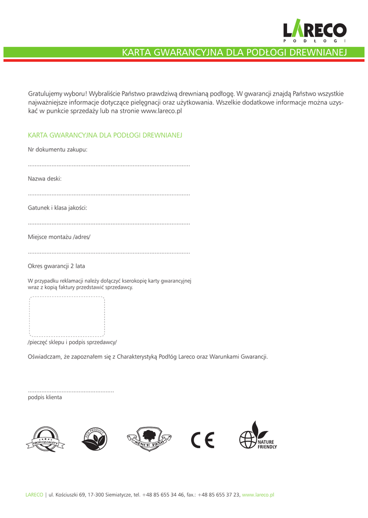 KARTA GWARANCYJNA DLA PODŁOGI DREWNIANEJ Gratulujemy wyboru! Wybraliście Państwo prawdziwą drewnianą podłogę. W gwarancji znajdą Państwo wszystkie najważniejsze informacje dotyczące pielęgnacji oraz użytkowania. Wszelkie dodatkowe informacje można uzyskać w punkcie sprzedaży lub na stronie www.lareco.pl KARTA GWARANCYJNA DLA PODŁOGI DREWNIANEJ Nr dokumentu zakupu: ................................................................................................ Nazwa deski: ................................................................................................ Gatunek i klasa jakości: ................................................................................................ Miejsce montażu /adres/ ................................................................................................ Okres gwarancji 2 lata W przypadku reklamacji należy dołączyć kserokopię karty gwarancyjnej wraz z kopią faktury przedstawić sprzedawcy. /pieczęć sklepu i podpis sprzedawcy/ Oświadczam, że zapoznałem się z Charakterystyką Podłóg Lareco oraz Warunkami Gwarancji. ................................................... podpis klienta LARECO | ul. Kościuszki 69, 17-300 Siemiatycze, tel. +48 85 655 34 46, fax.: +48 85 655 37 23, www.lareco.pl WARUNKI GWARANCJI DLA PODŁOGI DREWNIANEJ Lite oraz warstwowe podłogi projektowane i produkowane przez LARECO są wykonywane zgodnie z normami europejskimi. Gwarancją najwyższych walorów użytkowych i jakościowych produktów jest wykorzystanie naszego wieloletniego doświadczenia w obróbce drewna oraz zastosowanie nowoczesnego parku maszynowego. Aby zagwarantować najwyższą jakość każdej pojedynczej deski, cały proces produkcji począwszy od suszenia, poprzez obróbkę i procesy wykończenia powierzchni podlega nieustannym kontrolom. Aby zamontować oraz użytkować nasze podłogi w prawidłowy sposób, gwarantujący jej użytkownikom pełną satysfakcję, należy przed rozpoczęciem montażu szczegółowo zapoznać się z dokumentami dotyczącymi produktu takimi jak MONTAŻ PODŁÓG, PIELĘGNACJA I UŻYTKOWANIE PODŁÓG IMPREGNOWANYCH OLEJEM LUB LAKIEREM, LARECO CHARAKTERYSTYKA PRODUKTU (informacje te są udostępnione na stronie Lareco www.lareco.pl) jak również dokładnie sprawdzić dostarczony materiał i wszelkie uszkodzenia lub nieprawidłowości zgłosić sprzedającemu. Ułożenie podłogi z materiału obciążonego wadami spowoduje nie uznanie roszczeń gwarancyjnych. Montaż Produktu oznacza jego akceptację. Po zamontowaniu Produktu reklamacje dotyczące jego jakości i wyglądu nie będą uwzględniane. Konieczne jest też uprzednie dokładne rozplanowanie układu podłogi i użycie rekomendowanej chemii do montażu parkietów i podłóg drewnianych uznanych producentów w tej branży. Zawarte w niniejszym dokumencie oraz dokumentach uzupełniających (MONTAŻ PODŁÓG, PIELĘGNACJA I UŻYTKOWANIE PODŁÓG IMPREGNOWANYCH OLEJEM LUB LAKIEREM, LARECO CHARAKTERYSTYKA PRODUKTU) informacje oraz wytyczne mają za zadanie dostarczyć kupującemu niezbędnej wiedzy pozwalającej na bezpieczne i długoletnie korzystanie z naszych produktów. Przed zakupem podłogi należy zapoznać się ze wszystkimi informacjami dotyczącymi interesującego nas modelu podłogi. PRZEDMIOT I ZAKRES GWARANCJI 1.0 Gwarantujemy iż, sprzedawane przez nas podłogi lite i warstwowe , wykończone, w wersji olejowanej bądź lakierowanej są wolne od wad materiałowych lub wad powstałych w procesie produkcji, które mogłyby mieć wpływ na ich wygląd i funkcjonalność. 1.1 Okres gwarancji wynosi 24 miesiące od daty zakupu Produktu. Przedstawienie oryginalnej faktury zakupu wraz z ostęplowaną i wypisaną przez punkt sprzedaży kartą gwarancyjną stanowi podstawowy warunek rozpatrzenia reklamacji i uznania przez nas prawa do gwarancji. Za datę zakupu przyjmuje się datę wystawienia faktury sprzedaży przez punkt sprzedaży. Niniejsza gwarancja udzielana jest wyłącznie bezpośredniemu nabywcy; prawo do gwarancji nie może być przenoszone na inne osoby. 1.2 Zasięg terytorialny gwarancji obejmuje wyłącznie teren Rzeczpospolitej Polskiej. 1.3 Wszelkie wykryte wady które, nie zostaną zgłoszone w ciągu 30 dni od daty ich ujawnienia tracą uprawnienia do gwarancji. 1.4 Gwarancja na sprzedawany towar nie wyłącza, nie ogranicza ani nie narusza uprawnień Nabywcy będącego konsumentem wynikających z niezgodnością towaru konsumpcyjnego z umową. 1.5 O ile wcześniej nie wymieniono inaczej, dalej idące roszczenia niezależnie od podstawy prawnej – nie są objęte gwarancją. LARECO nie odpowiada zwłaszcza za straty powstałe wskutek niemożności użytkowania, przestojów produkcyjnych, obniżenia wartości lub utraconego zysku, ani też za inne szkody materialne oraz szkody pośrednie i majątkowe poniesione przez posiadacza gwarancji lub osoby trzecie, spowodowane przez wady materiału. 1.6 W sprawach nie uregulowanych w niniejszej gwarancji zastosowanie maja przepisy kodeksu prawa cywilnego a wszelkie sprawy sporne będą rozstrzygane przed sądem właściwym dla siedziby Producenta tj. Sąd Rejonowy w Bielsku Podlaskim I Wydział Cywilny ul. 3 Maja 7 17-100 Bielsk Podlaski. 1.7 Gwarancja udzielana jest na deski podłogowe lite i warstwowe wykończone, stanowiące przedmiot sprzedaży pod warunkiem ich montażu gwoździ lub wkrętów do ślepej podłogi drewnianej lub wykonanej z odpowiedniej płyty drewnopochodnej trwale zamocowanej do legarów lub podłoża. 1.8 Odpowiedzialność Producenta z tytułu udzielonej gwarancji obejmuje wyłącznie wady powstałe z przyczyn tkwiących w przedmiocie sprzedaży zgodnie z normą PN-EN 13226. 1.9 Szczegółowa Instrukcja Montażu umieszczona jest w opakowaniu produktu oraz na naszej stronie internetowej www.lareco.pl. Szczegółowa Charakterystyka Produktu znajduje się na stronie www.lareco.pl. Informacje dotyczące pielęgnacji i użytkowania znajdują się na stroni