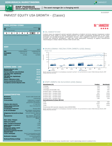 KOMUNIKACJA MARKETINGOWA 31/12/2015* PARVEST EQUITY USA GROWTH - (Classic) PROFIL RYZYKA I ZYSKU niższe ryzyko wyższe ryzyko zwykle niższe korzyści 1 2 zwykle wyższe korzyści 3 4 5 6 7 Im wyższe ryzyko, tym dłuższy zalecany horyzont inwestycji CEL INWESTYCYJNY Fundusz stara się zapewnić wzrost wartości aktywów w średnim terminie poprzez inwestycje w akcje emitowane przez spółki ze Stanów Zjednoczonych lub spółki prowadzące działalność w tym kraju, cechujące się ponadprzeciętnym potencjałem wzrostu i/lub względnie stabilnym wzrostem zysków. Fundusz jest aktywnie zarządzany i jako taki może dokonywać inwestycji w papiery wartościowe niewchodzące w skład indeksu Russell 1000 Growth (RI). KODY Kod D LU0823434740 FEGUCDE LX A1T80M SKUMULOWANA I ROCZNA STOPA ZWROTU (USD) (Netto) Przez 5 lat 250 220.16 200 181.49 150 100 50 15.26 15.26 9.97 13.05 2.64 236.21 102.95 Maks. Opłaty Wstępne Opłaty przy wyjściu Maks. Prowizja od Konwersji Opłaty bieżące w wysokości 30/11/2014 Maksymalne opłaty z tytułu zarządzania (roczne) Okresowość Kalkulacji Wartości Aktywów Netto Termin subskrypcji Rozliczenie i dostawa Realizacja/Rodzaj przebiegu 25 0 2010 Fundusz 2011 2012 2013 Benchmark 2014 2015 Wyniki uzyskane w przeszłości nie przesądzają o przyszłych wynikach i nie są niezmienne w czasie. Źródło Kalkulacji Wyniku: BNP Paribas Securities Services. 259.33 219.83 1,064.18 1.52 50.00 CHARAKTERYSTYKA Delegowany kierownik ds. finans w Depozytariusz 5.67 -25 Wartość aktywów netto (Kapitalizacja) Wartość aktywów netto (Rozkład) 12M WAN maks. Kapitalizacja (20/07/15) 12M WAN min. Kapitalizacja (29/09/15) Aktywa subfunduszu (mln) Ostatnia dywidenda (20/04/15) Początkowa wartość aktywów netto Oficjalna data otwarcia Waluta bazowa (jednostki uczestnictwa) Zarządzający Funduszem Sp łka Zarządzająca 0.36 -2.85 GŁÓWNE DANE - USD Benchmark Narodowość Forma prawna 50 28.58 33.48 14.21 16.71 (%) Kod C LU0823434583 FEGUCCE LX A1T80L Liczony od 100 ISIN BLOOMBERG WKN Russell 1000 Growth (RI) Luksemburg Subfundusz w ramach funduszu typu SICAV z paszportem europejskim 17 maj 2013 Dolar Amerykański Pamela WOO BNP PARIBAS INVESTMENT PARTNERS LUXEMBOURG FISCHER FRANCIS TREES & WATTS INC BNP PARIBAS SECURITIES SERVICES-LUXEMBOURG BRANCH 3% 0% 1.50% 1.99% STOPY ZWROTU NA 31/12/2015 (USD) (Netto) Skumulowana (%) 1 miesiąc 3 miesiące narastająco od początku roku Grudzień 2014 - Grudzień 2015 Grudzień 2013 - Grudzień 2014 Grudzień 2012 - Grudzień 2013 Grudzień 2011 - Grudzień 2012 Grudzień 2010 - Grudzień 2011 Zannualizowana (%) (baza 365 dni) 1 rok 3 lata 5 lata Od pierwszej NAV (wartości aktywów netto) (29/06/1994) Fundusz - 2.24 4.78 0.36 0.36 9.97 28.58 15.26 - 2.85 Benchmark - 1.47 7.32 5.67 5.67 13.05 33.48 15.26 2.64 0.36 12.37 9.71 7.49 5.67 16.83 13.53 - Wyniki uzyskane w przeszłości nie przesądzają o przyszłych wynikach i nie są niezmienne w czasie. Źródło Kalkulacji Wyniku: BNP Paribas Securities Services. 1.50% Codziennie Dzień D przed godziną 16:00 (czasu luksemburskiego) Uznanie/obciążenie rachunku D+3 Nieznana wartość aktywów netto *O ile nie stwierdzono inaczej, wszystkie dane i wyniki odpowiadają stanowi w podanym dniu. 1/2 KOMENTARZ ZARZĄDZAJĄCEGO na dzień 31/12/2015 W ostatnim kwartale roku ceny akcji odrobiły straty, jednak 2015 był rokiem niskich stóp zwrotu z akcji. Zanotowano rozczarowujące wyniki pomimo powolnego, ale trwałego ożywienia gospodarczego. Po słabym pierwszym kwartale, wzrost gospodarczy przyspieszył, a wzrost produktu krajowego brutto rok do roku wyniósł około 2,5%. Pomimo tej kontynuacji wzrostu gospodarczego, w ostatnich kwartałach przychody i zyski spółek uległy jednak obniżeniu. Najważniejszym wydarzeniem gospodarczym w IV kw. była decyzja Fedu o podniesieniu stóp procentowych, co w ocenie Fedu stanowiło sygnał, że gospodarka jest na tyle silna, że przyjmie wyższe stopy procentowe. W sytuacji zmienności panującej na rynkach, fundusz Parvest Equity USA Growth notował wzrosty, podobnie jak indeks szerokiego rynku, jednak fundusz uzyskał słabszy wynik. W stopę zwrotu uderzył głównie dobór akcji w sektorze artykułów konsumpcyjnych, przemysłowym, energii i technologicznym. Ceny energii nadal spadały, a nasze walory w portfelu Whiting Petroleum i Range Resources dotknęła wyprzedaż. W sektorze technologicznym w naszą stopę zwrotu w ujęciu względnym uderzyły spółki Fireeye i Fortinet. Z uwagi na obserwowane ożywienie gospodarcze w USA i wskaźniki świadczące o umiarkowanym wzroście gospodarczym, wchodzimy w nowy rok 2016 r. z pozytywną prognozą. Ryzyko utrzymuje się, a przewidywany wzrost zysków w 2016 r. został już skorygowany w dół. GŁÓWNE WALORY W PORTFELU Fund. Bench 11.42 2.43 -1.84 1.06 -4.47 1.04 0.96 10.70 1.55 - Okres: 3 lata. Częstotliwość: co miesiąc % ALPHABET INC-CL A APPLE INC. MICROSOFT FACEBOOK INC WALT DISNEY CO MASTERCARD MCKESSON HBOC AMAZON.COM.INC. HOME DEPOT INC AT&T INC SBC US Liczba walorów w portfelu: 75 6,07 5,16 2,63 2,40 2,22 2,18 2,10 2,06 2,01 2,00 GŁÓWNE AKTYWNE POZYCJE WZGLĘDEM BENCHMARKU Przeważony Akcje 4.03% 1.80% 1.77% 1.73% 1.70% 1.70% 1.59% 1.59% 1.30% 1.29% Źródło danych: BNP Paribas Securities Services 25.21 23.48 17.71 10.55 8.02 6.20 3.49 3.94 Dóbr Luksusowych Technologiczny Opieka Zdrowotna Dobra Trwałego Użytku Nabywane Przez Producentów Usługi Finansowe Podstawowe Dobra Konsumpcyjne Użyteczności Publicznej Inne Zaangażowanie ogółem: 98.59 % Źródło danych: BNP Paribas Securities Services Źródło danych: BNP Paribas Securities Services Alphabet Inc-cl A Symantec Cisco Systems Inc. At&t Inc Sbc Us Ebay Mckesson Hboc Vertex Pharmaceuticals Inc. Danaher Corp. Jp Morgan Chase & Co Mastercard Zmienność (%) Błąd odwzorowania (%) Wsk. information ratio Wskaźnik Sharpe'a Alfa (%) Beta R² PODZIAŁ WG SEKTORA (%) Nazwa aktywu Akcje ANALIZA RYZYKA Alphabet Inc-cl C