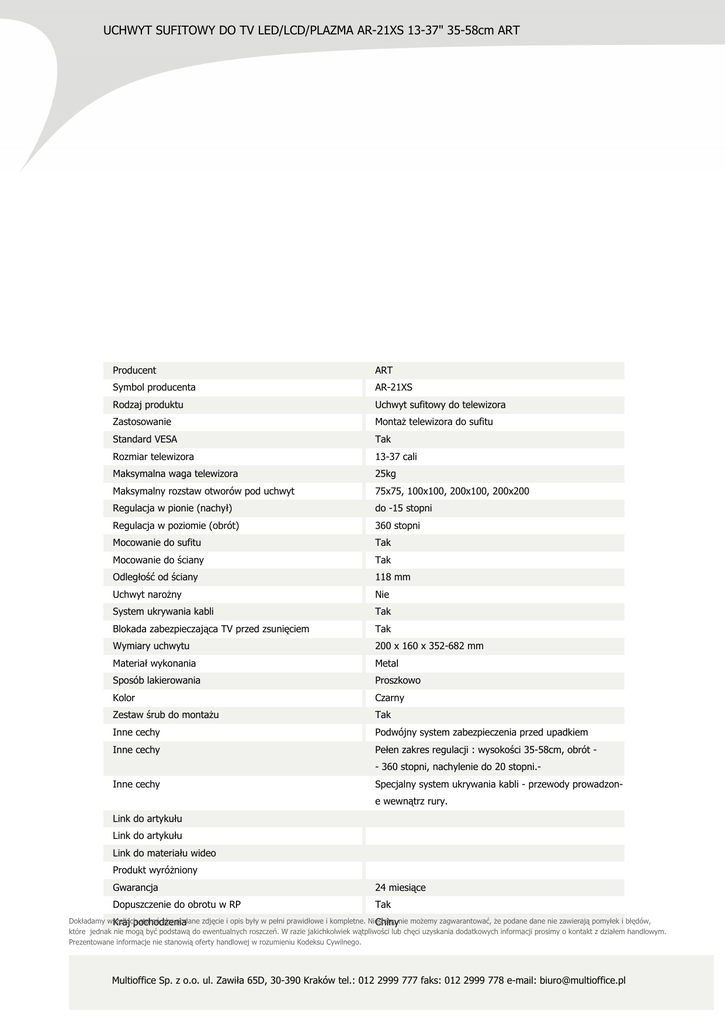 UCHWYT SUFITOWY DO TV LED/LCD/PLAZMA AR-21XS 13-37" 35-58cm ART Producent ART Symbol producenta AR-21XS Rodzaj produktu Uchwyt sufitowy do telewizora Zastosowanie Montaż telewizora do sufitu Standard VESA Tak Rozmiar telewizora 13-37 cali Maksymalna waga telewizora 25kg Maksymalny rozstaw otworów pod uchwyt 75x75, 100x100, 200x100, 200x200 Regulacja w pionie (nachył) do -15 stopni Regulacja w poziomie (obrót) 360 stopni Mocowanie do sufitu Tak Mocowanie do ściany Tak Odległość od ściany 118 mm Uchwyt narożny Nie System ukrywania kabli Tak Blokada zabezpieczająca TV przed zsunięciem Tak Wymiary uchwytu 200 x 160 x 352-682 mm Materiał wykonania Metal Sposób lakierowania Proszkowo Kolor Czarny Zestaw śrub do montażu Tak Inne cechy Podwójny system zabezpieczenia przed upadkiem Inne cechy Pełen zakres regulacji : wysokości 35-58cm, obrót - 360 stopni, nachylenie do 20 stopni.- Inne cechy Specjalny system ukrywania kabli - przewody prowadzone wewnątrz rury. Link do artykułu Link do artykułu Link do materiału wideo Produkt wyróżniony Gwarancja 24 miesiące Dopuszczenie do obrotu w RP Tak Dokładamy wszelkich starań aby podane zdjęcie i opis były w pełni prawidłowe i kompletne. Niestety, Kraj pochodzenia Chinynie możemy zagwarantować, że podane dane nie zawierają pomyłek i błędów, które jednak nie mogą być podstawą do ewentualnych roszczeń. W razie jakichkolwiek wątpliwości lub chęci uzyskania dodatkowych informacji prosimy o kontakt z działem handlowym. Prezentowane informacje nie stanowią oferty handlowej w rozumieniu Kodeksu Cywilnego. Multioffice Sp. z o.o. ul. Zawiła 65D, 30-390 Kraków tel.: 012 2999 777 faks: 012 2999 778 e-mail: [email protected]