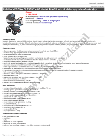 Informacje o produkcie Utworzono 04-03-2017 Coletto VERONA CLASSIC V-08 stelaż BLACK wózek dziecięcy wielofunkcyjny Cena : 1.799,00 zł pl Nr katalogowy : Wózeczek głęboko-spacerowy Producent : Coletto Stan magazynowy : brak w magazynie Średnia ocena : brak recenzji zk a. VERONA CLASSIC to wózek dla dzieci w wieku od 0-36 miesięcy. Uwodzi stylem i elegancją. Bardzo nowoczesna w formie jak i w rozwiązaniach technologicznych. Funkcjonalna, wykonana z bardzo dobrych gatunkowo materiałów, posiada ozdobną gondolę,która nadaje smak tej kompozycji. Koła pompowane - duże zamortyzowane sprawiają, iż jazda nim to nic innego jak przyjemność. Wygoda, komfort, płynność jazdy to jego cechy. Piękno i bezpieczeństwo. Charakterystyka: ● ● ● ● ● ● ● ● ● ● ● ● ● ● ● ec ● in ● obszerna gondola z plastikowym wentylowanym dnem i regulacją oparcia, dł. 85 cm wózek w wersji głębokiej odpowiedni od pierwszych dni życia wózek spacerowy dla dzieci od 6 miesiąca stelaż składany wraz ze spacerówką tapicerka wykonana z wysokogatunkowej skóry ekologicznej, łatwej do utrzymania w czystości wnętrze spacerówki wykonane z miękkich materiałów dla zapewnienia komfortu wysokogatunkowa bawełna wewnątrz gondoli przykrycie gondoli posiada kołnierz z możliwością podniesienia i przypięcia do daszka, co chroni dziecko przed wiatrem i deszczem rozsuwane przykrycie na nóżki oraz miękki materacyk w spacerówce budki w gondoli oraz w spacerówce posiadają wentylację, by umożliwić przepływ powietrza regulowana rączka z eko-skóry pozwalająca dostosować jej wysokość do wzrostu rodzica 6 amortyzatorów: miękkie zawieszenie dostosowujące się do nierówności terenu i zapewniające komfortowe prowadzenie koła pompowane łożyskowane elegancka, lekka i wytrzymała konstrukcja wykonana z aluminium blokada przednich kół praktyczny, zamykany kosz na zakupy z klapką z eko-skóry folia przeciwdeszczowa, moskitiera fotelik do montażu na konstrukcji /OPCJA/ adaptery do fotelika Maxi-cosi Pebble i Cabriofix /OPCJA/ Dane techniczne: ● ● ● ● ● ● ● ● ● ● ● ● wymiary złożonej konstrukcji z kołami: (dł/wys/szer):80 cm/35 cm/58 cm wymiary oparcia spacerówki:(szer/wys): 30 cm/46 cm wymiary siedziska spacerówki:(szer/wys): 30 cm/22 cm wymiary podnóżka spacerówki:(wys/szer): 23 cm/32 cm wymiary gondoli:(dł/szer/wys): 89 cm/43 cm/29cm rozmiar kół: 9” i 11” rozstaw tylnych kół: (wym. zewn.): 58 cm waga wózka z gondolą: 13,8 kg waga wózka w wersji spacerowej: 14,6 kg waga konstrukcji: 5,1 kg waga konstrukcji z koszem i kołami: 9,4 kg waga konstrukcji z kołami: 8,8 kg waga gondoli: 4,4 kg waga spacerówki: 5,2 kg w ● w ● .c al ● w ● Akcesoria na wyposażeniu wózka: ● ● ● ● ● ● folia przeciwdeszczowa moskitiera torba przykrycie na nóżki w gondoli przykrycie na nóżki w spacerówce pojemny kosz na zakupy z klapką z eko-skóry mocowany na konstrukcji Wygenerowano w programie www.oscGold.com Dostępne opcje Coletto VERONA CLASSIC V-08 stelaż BLACK wózek dziecięcy wielofunkcyjny w w w .c al in ec zk a. pl » fotelik samochodowy: Bez fotelika, Fotelik w tym samym kolorze (+290,00 zł).