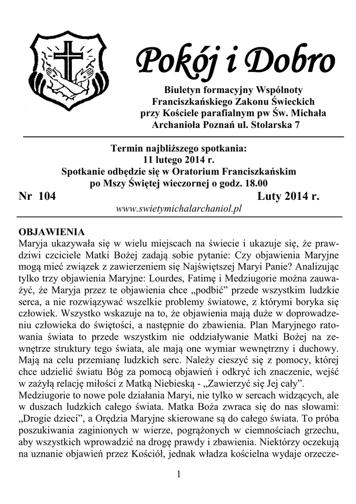 Pokój i Dobro Biuletyn formacyjny Wspólnoty Franciszkańskiego Zakonu Świeckich przy Kościele parafialnym pw Św. Michała Archanioła Poznań ul. Stolarska 7 Termin najbliższego spotkania: 11 lutego 2014 r. Spotkanie odbędzie się w Oratorium Franciszkańskim po Mszy Świętej wieczornej o godz. 18.00 Nr 104 Luty 2014 r. www.swietymichalarchaniol.pl OBJAWIENIA Maryja ukazywała się w wielu miejscach na świecie i ukazuje się, że prawdziwi czciciele Matki Bożej zadają sobie pytanie: Czy objawienia Maryjne mogą mieć związek z zawierzeniem się Najświętszej Maryi Panie? Analizując tylko trzy objawienia Maryjne: Lourdes, Fatimę i Medziugorie można zauważyć, że Maryja przez te objawienia chce „podbić” przede wszystkim ludzkie serca, a nie rozwiązywać wszelkie problemy światowe, z którymi boryka się człowiek. Wszystko wskazuje na to, że objawienia mają duże w doprowadzeniu człowieka do świętości, a następnie do zbawienia. Plan Maryjnego ratowania świata to przede wszystkim nie oddziaływanie Matki Bożej na zewnętrze struktury tego świata, ale mają one wymiar wewnętrzny i duchowy. Mają na celu przemianę ludzkich serc. Należy cieszyć się z pomocy, której chce udzielić światu Bóg za pomocą objawień i odkryć ich znaczenie, wejść w zażyłą relację miłości z Matką Niebieską - „Zawierzyć się Jej cały”. Medziugorie to nowe pole działania Maryi, nie tylko w sercach widzących, ale w duszach ludzkich całego świata. Matka Boża zwraca się do nas słowami: „Drogie dzieci”, a Orędzia Maryjne skierowane są do całego świata. To próba poszukiwania zaginionych w wierze, pogrążonych w ciemnościach grzechu, aby wszystkich wprowadzić na drogę prawdy i zbawienia. Niektórzy oczekują na uznanie objawień przez Kościół, jednak władza kościelna wydaje orzecze1 nie wiele lat po zakończeniu objawień, a plan Maryi realizowany jest dzisiaj walką o dusze ludzkie. Dzisiaj należy wejść na drogę świętości, bo „dzisiaj żyjemy”. Z Orędzia dla Misjonarzy z dnia 2 grudnia 2013 r. „Drogie dzieci, z macierzyńską miłością i macierzyńską cierpliwością patrzę na wasze nieustanne błądzenie i wasze zagubienie. Pragnę wam pomóc, abyście przede wszystkim odnaleźli i poznali siebie, byście rozpoznali w sobie to wszystko, co nie pozwala wam szczerze i całym sercem Poznań miłości Ojca niebieskiego. Moje dzieci, Ojca poznaje się po Krzyżu. Dlatego nie odrzucajcie Krzyża, starajcie się go pojąć i przyjąć go z moją pomocą. Gdy będziecie w stanie przyjąć Krzyż, zrozumiecie również Ojca Niebieskiego; będziecie chodzić z Moim Synem i ze Mną będziecie odróżniać się od tych, którzy nie poznali miłości Ojca Niebieskiego, od tych, którzy Go słuchają, lecz Go nie rozumieją, nie chodzą z Nim, bo Go nie poznali. Pragnę, abyście poznali prawdę Mojego Syna i stali się moimi apostołami, abyście wznieśli się ponad ludzkie myślenie, abyście zawsze i we wszystkim na nowo szukali Bożego myślenia. Moje dzieci, módlcie się i poście abyście mogli zrozumieć to wszystko, czego od was żądam. Módlcie się za swoich pasterzy, abyście w jedności z nimi poznali miłość Ojca Niebieskiego… Dziękuję wam”. Opracował brat Leszek 6 stycznia 2014 r. godz. 12.00, Poznań, Plac Wolności. ORSZAK TRZECH KRÓLI Idźmy do Betlejem. I poszliśmy w gronie małych dzieci, ich rodziców, babć i dziadków. Było nas bardzo dużo, co ogromnie cieszy. Jeśli nawet było trochę osób obserwatorów, to mogli zobaczyć, jak wielu postanowiło uczestniczyć w Orszaku Trzech Króli, aby złożyć pokłon Małej Dziecinie – Jezusowi. Wszyscy otrzymaliśmy śpiewnik z kolędami i korony. Ksiądz abp Stanisław Gądecki objął Patronat i rozpoczął to przepiękne, barwne spotkanie modlitwą „Anioł Pański”. Zarówno dla dzieci i dorosłych było to przeżycie i atrakcja, że na ulicach Poznania, ulicami Marcinkowskiego, Plac Wielkopolski i Stary Rynek zdążaliśmy 2 na Mszę św. do Fary Poznańskiej. To z pewnością było świadectwo naszej wiary. Niechaj kolęda świadczy o tych przeżyciach: Mędrcy świata, monarchowie Trzykroć szczęśliwi królowie Któż wam nie zazdrości? Cóż my damy, kto nam powie, pałając z miłości? Tak jak każą nam kapłani, damy dar troisty: Modły, pracę niosąc w dani i żar serca czysty. A ja tam byłam… s. Krystyna G. ANIOŁOWIE Wszyscy wierzymy, że istnieją i oczekujemy od nich pomocy. Z dzieciństwa pamiętamy słowa nauczonej nas przez rodziców modlitwy „Aniele Boży Stróżu mój, Ty zawsze przy mnie stój. Rano, wieczór, we dnie, w nocy, bądź mi zawsze ku pomocy…” Tą też modlitwą zostaliśmy zawierzeni Bogu, bo Bóg ma plany względem każdego z nas. Bóg rządzi sprawami ludzi, abyśmy żyli dla Niego i zgodnie z Jego wolą. Będzie nas chronił i ostrzegał dopóki zechce byśmy przyszli i żyli razem z Nim w niebie. Jesteśmy tylko gośćmi w tym miejscu i w tym czasie. Naszym celem jest rosnąć, uczyć się, obserwować i kochać… a potem wrócić… do domu Ojca. Nie jesteśmy jednak sami w tej pełnej doświadczeń podróży. Są z nami Aniołowie. Te cudowne istoty mają większą moc niż jakikolwiek człowiek, są zaangażowane w każdy aspekt naszego życia. Aniołowie strzegą naszego bezpieczeństwa, bronią nas, kierują nami i stale się troszczą o to, by zło nie miało do nas dostępu, byśmy nie ulegali pokusie. Działają zgodnie z Bożym przyzwoleniem. Bóg obiecał nam ich opiekę: „oto Ja posyłam anioła przed tobą, aby cię strzegł w czasie twojej drogi i prowadził cię do miejsca, które ci wyznaczyłem. Szanuj go i słuchaj jego głosu. Nie sprzeciwiaj się mu w niczym (…) bo imię moje jest w nim” (Wj 23, 20-21). Co za dar! Bylibyśmy nieroztropni, nie przyjmując go. Swojego Anioła Stróża otrzymuje każdy człowiek na ziemi, nie tylko ci, którzy zostali ochrzczeni. Obecność a