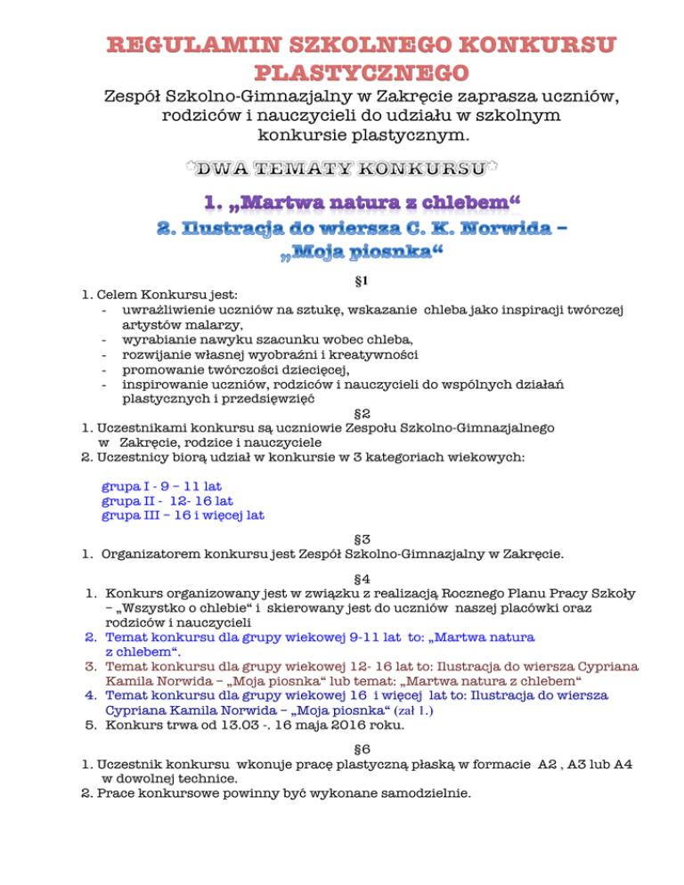 REGULAMIN SZKOLNEGO KONKURSU PLASTYCZNEGO ZespóĿ Szkolno-Gimnazjalny w Zakręcie zaprasza uczniów, rodziców i nauczycieli do udziaĿu w szkolnym konkursie plastycznym. §1 1. Celem Konkursu jest: - uwrażliwienie uczniów na sztukę, wskazanie chleba jako inspiracji twórczej artystów malarzy, - wyrabianie nawyku szacunku wobec chleba, - rozwijanie wĿasnej wyobraźni i kreatywności - promowanie twórczości dziecięcej, - inspirowanie uczniów, rodziców i nauczycieli do wspólnych dziaĿań plastycznych i przedsięwzięć §2 1. Uczestnikami konkursu są uczniowie ZespoĿu Szkolno-Gimnazjalnego w Zakręcie, rodzice i nauczyciele 2. Uczestnicy biorą udziaĿ w konkursie w 3 kategoriach wiekowych: grupa I - 9 – 11 lat grupa II - 12- 16 lat grupa III – 16 i więcej lat §3 1. Organizatorem konkursu jest ZespóĿ Szkolno-Gimnazjalny w Zakręcie. 1. 2. 3. 4. 5. §4 Konkurs organizowany jest w związku z realizacją Rocznego Planu Pracy SzkoĿy – „Wszystko o chlebie“ i skierowany jest do uczniów naszej placówki oraz rodziców i nauczycieli Temat konkursu dla grupy wiekowej 9-11 lat to: „Martwa natura z chlebem“. Temat konkursu dla grupy wiekowej 12- 16 lat to: Ilustracja do wiersza Cypriana Kamila Norwida – „Moja piosnka“ lub temat: „Martwa natura z chlebem“ Temat konkursu dla grupy wiekowej 16 i więcej lat to: Ilustracja do wiersza Cypriana Kamila Norwida – „Moja piosnka“ (zał 1.) Konkurs trwa od 13.03 -. 16 maja 2016 roku. §6 1. Uczestnik konkursu wkonuje pracę plastyczną pĿaską w formacie A2 , A3 lub A4 w dowolnej technice. 2. Prace konkursowe powinny być wykonane samodzielnie. 3. Na odwrocie każdej pracy należy wpisać imię i nazwisko autora oraz wiek. 4. Prace należy dostarczyć do 18 maja 2016r. do nauczyciela plastyki. §7 1. Prace zostaną ocenione przez komisję wyĿonioną przez organizatora wedĿug następujących kryteriów: q indywidualny i twórczy pomysĿ, q oryginalność środków wyrazu: kompozycja, gama kolorystyczna, technika wykonania, q estetyka 2. Spośród prac biorących udziaĿ w konkursie, z każdej z grup wiekowych nagrodzone zostaną 3 prace i jedno wyróżnienie. 3. Laureatom zostaną przyznane nagrody oraz pamiątkowe dyplomy. Podsumowanie konkursu odbędzie się w wyznaczonym terminie. 4. Nagrodzone prace wraz z wyróżnionymi zostaną zaprezentowane na wystawie zorganizowanej w budynku szkoĿy z okazji urodzin patrona szkoĿy we wrześniu 2016r.i na stronie internetowej. 5. Prace biorące udziaĿ w konkursie przechodzą na wĿasność organizatora. Zał.1 Moja piosnka Cyprian Kamil. Norwid Do kraju tego, gdzie kruszynę chleba Podnoszą z ziemi przez uszanowanie Dla darów Nieba.... Tęskno mi, Panie... * Do kraju tego, gdzie winą jest dużą Popsować gniazdo na gruszy bocianie, Bo wszystkim służą... Tęskno mi, Panie... * Do kraju tego, gdzie pierwsze ukłony Są, jak odwieczne Chrystusa wyznanie, "Bądź pochwalony!" Tęskno mi, Panie... * Tęskno mi jeszcze i do rzeczy innej, Której już nie wiem, gdzie leży mieszkanie, Równie niewinnej... Tęskno mi, Panie... * Do bez-tęsknoty i do bez-myślenia, Do tych, co mają tak za tak - nie za nie, Bez światło-cienia... Tęskno mi, Panie... * Tęskno mi owdzie, gdzie któż o mnie stoi? I tak być musi, choć się tak nie stanie Przyjaźni mojéj... Tęskno mi, Panie...