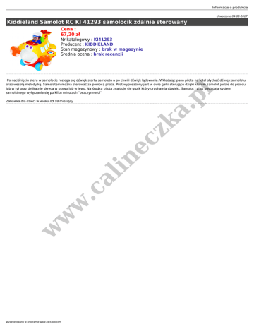 Informacje o produkcie Utworzono 04-03-2017 Kiddieland Samolot RC KI 41293 samolocik zdalnie sterowany Cena : 67,20 zł Nr katalogowy : KI41293 Producent : KIDDIELAND Stan magazynowy : brak w magazynie Średnia ocena : brak recenzji pl Po naciśnięciu steru w samolocie rozlega się dźwięk startu samolotu a po chwili dźwięk lądowania. Wkładając pana pilota na fotel słychać dźwięk samolotu oraz wesołą melodyjkę. Samolotem można sterować za pomocą pilota. Pilot wyposażony jest w dwie gałki sterujące dzięki którym samolot jedzie do przodu lub w tył oraz delikatnie skręca w prawo lub w lewo. Na środku pilota znajduje się guzik który uruchamia dźwięki. Samolot i pilot posiadają system samoistnego wyłączania się po kilku minutach "bezczynności". w w w .c al in ec zk a. Zabawka dla dzieci w wieku od 18 miesięcy Wygenerowano w programie www.oscGold.com