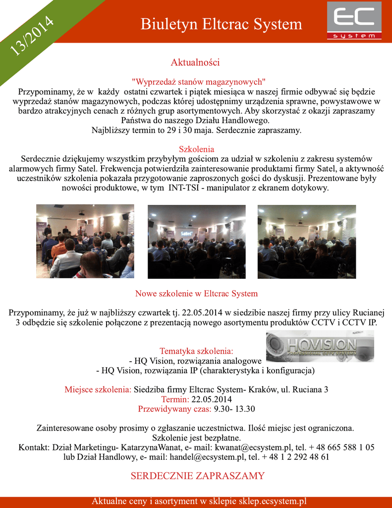4 1 0 2 / 13 Biuletyn Eltcrac System Aktualności "Wyprzedaż stanów magazynowych" Przypominamy, że w każdy ostatni czwartek i piątek miesiąca w naszej firmie odbywać się będzie wyprzedaż stanów magazynowych, podczas której udostępnimy urządzenia sprawne, powystawowe w bardzo atrakcyjnych cenach z różnych grup asortymentowych. Aby skorzystać z okazji zapraszamy Państwa do naszego Działu Handlowego. Najbliższy termin to 29 i 30 maja. Serdecznie zapraszamy. Szkolenia Serdecznie dziękujemy wszystkim przybyłym gościom za udział w szkoleniu z zakresu systemów alarmowych firmy Satel. Frekwencja potwierdziła zainteresowanie produktami firmy Satel, a aktywność uczestników szkolenia pokazała przygotowanie zaproszonych gości do dyskusji. Prezentowane były nowości produktowe, w tym INT-TSI - manipulator z ekranem dotykowy. Nowe szkolenie w Eltcrac System Przypominamy, że już w najbliższy czwartek tj. 22.05.2014 w siedzibie naszej firmy przy ulicy Rucianej 3 odbędzie się szkolenie połączone z prezentacją nowego asortymentu produktów CCTV i CCTV IP. Tematyka szkolenia: - HQ Vision, rozwiązania analogowe - HQ Vision, rozwiązania IP (charakterystyka i konfiguracja) Miejsce szkolenia: Siedziba firmy Eltcrac System- Kraków, ul. Ruciana 3 Termin: 22.05.2014 Przewidywany czas: 9.30- 13.30 Zainteresowane osoby prosimy o zgłaszanie uczestnictwa. Ilość miejsc jest ograniczona. Szkolenie jest bezpłatne. Kontakt: Dział Marketingu- KatarzynaWanat, e- mail: [email protected], tel. + 48 665 588 1 05 lub Dział Handlowy, e- mail: [email protected], tel. + 48 1 2 292 48 61 SERDECZNIE ZAPRASZAMY Aktualne ceny i asortyment w sklepie sklep.ecsystem.pl P Ciekawostki onieważ rozpoczął się już sezon rowerowy warto przyjżec sie nowym rozwiązaniom w tej tematyce. Pierwszym z nich jest Vanhawks Valour- inteligentny rower, który już odniósł sukces na Kickstarterze. Łączy się ze smartfonem, ma czujniki, podpowiada, jak dobrać drogę, ponieważ współpracuje ze specjalną aplikacją, za pomocą której wyznacza się trasę. Przed startem smartfona można schować do plecaka, bo drogę pokażą lampki na kierownicy. W Vanhawks Valour wszystko już jest zainstalowane, nie trzeba niczego kupować ani montować. Tak samo jak czujników, które będą czuwać nad tym, czy nie ma blisko nas pojazdów. Gdyby jakiś się zbliżał, rowerzysta poczuje wibracje na kierownicy, dzięki czemu będzie wiedział, że trzeba uważać. Rower od razu policzy przebyty dystans i spalone kalorie. A gdyby ktoś go ukradł, to specjalne powiadomienia będą przesyłane do innych użytkowników, dzięki czemu szybciej złapie się złodzieja. Rower nie jest też specjalnie ciężki, waży trochę ponad 7 kg. Cena Vanhawks Valour to prawie 3000 zł. Nowatorskim rozwiązaniem jest także smartblokada rowerowa, która nie potrzebuje klucza – wystarczy, że podejdziemy ze smartfonem, który połączy się ze Skylockiem i odblokuje zamek. W razie czego jest też dotykowy ekran, na którym można wpisać hasło lub PIN. Skylock łączy się ze smartfonem, więc gdy ktoś zacznie się kręcić wokół pojazdu, od razu się o tym dowiemy. Czujniki ruchu dostrzegą niepożądaną aktywność i system błyskawicznie wyśle alarmowe powiadomienie. Rzecz jasna to od nas zależy „czułość” - nie musimy się obawiać, że gdy zostawimy rower przy sklepie, co chwila będziemy informowani o ruchu wokół niego. Wydaje się, że przede wszystkim dla tej funkcji warto się Skylockiem zainteresować. W końcu czasami nie wiemy, kiedy nasz rower skradziono. Skylock od razu poinformuje o tym, że ktoś majstruje przy zamku, co zwiększy szanse na złapanie złodzieja. Na dodatek nie musimy martwić się tym, że Skylock się rozładuje. Gadżet ma panele słoneczne, więc jeżeli zostawimy rower na słońcu, to zostanie naładowany. Skylock zapowiada się na naprawdę dobrego i przede wszystkim wygodnego ochroniarza. Twórcy nie zapominają o tych „właściwych” zabezpieczeniach i zapewniają, że złodziej będzie musiał się namęczyć, zanim przetnie blokadę. Skylock do sprzedaży trafi na początku 2015 roku. Obecnie sprzęt kosztuje 159 dolarów. Opracowanie: Katarzyna Wanat Netografia: www.gadzetomania.pl www.mashable.com www.technocrazed.com www.vanhawks.com Aktualne ceny i asortyment w sklepie sklep.ecsystem.pl W dniu 17 maja odbyło się szkolenie firmy Pulsar dla dystrybutorów. Chcielibyśmy udostępnić Państwu narzędzia, które znajdują się na stronie internetowej tego producenta. 1. Konfigurator szaf Rack- http://www.pulsar.pl/pl/panel.php?lang=PL&m1=1&m2=3&m3=8&m4=0 Można w nim zbudować zestawienie potrzebnych elementów i wydrukować zamówienie oraz zestawienie cenowe. Możliwe jest również dodawanie własnych elementów, tworząc ofertę dla klienta. Jego prosta, intuicyjna obsługa pozwala na: - szybkie wybranie odpowiedniej szafy RACK - jednoznaczne przyporządkowanie akcesoriów do danej szafy - przygotowanie wyceny detalicznej jak i uwzględnienie w wycenie przysługującego klientowi rabatu - wydruk zestawienia: cenowego, rozmieszczenia akcesorii w szafie - uwzględnienie położenia podczas konfiguracji urządzeń nie zakupionych w naszej firmie np. UPS 2. Kalkulatory do obliczania spadków napięć- http://www.pulsar.pl/pl/panel.php?lang=PL&m1=10&m2=1 3. Kalkulator obliczania mocy akumulatora- http://www.pulsar.pl/pl/panel.php?lang=PL&m1=10&m2=2 4. Wyszukiwarka obudów- http://www.pulsar.pl/pl/panel.php?lang=PL&m1=14 Jeżeli chcemy szybko dobrać obudowę do konkretnej centrali alarmowej, to narzędzie okaże się bardzo pomocne. Ponadto firma Pulsar wzbogaciła swoją ofertę o nowe czujki: SL18 - SMILE 18 Pasywna czujka podczerwieni • • • • • • • • • • • • Specyfikacja: Zasilanie: 9÷15VDC Pobór prądu: Alarm / Stan gotowości: 18,0mA /9,5mA @13,8VDC Zasięg czujnika: 15m Kąt działania / soczewka: 90° / 29 stref w 5 poziomach Odporn