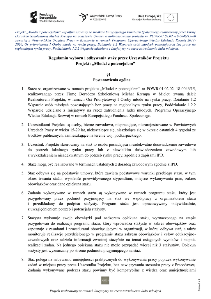 Projekt „Młodzi z potencjałem” współfinansowany ze środków Europejskiego Funduszu Społecznego realizowany przez Firmę Doradczo Szkoleniową Michał Krempa na podstawie Umowy o dofinansowanie projektu nr POWR.01.02.02.-18-0046/15-00 zawartej z Wojewódzkim Urzędem Pracy w Rzeszowie w ramach Programu Operacyjnego Wiedza Edukacja Rozwój 20142020, Oś priorytetowa I Osoby młode na rynku pracy, Działanie 1.2 Wsparcie osób młodych pozostających bez pracy na regionalnym rynku pracy, Poddziałanie 1.2.2 Wsparcie udzielane z Inicjatywy na rzecz zatrudnienia ludzi młodych. Regulamin wyboru i odbywania staży przez Uczestników Projektu Projekt: „Młodzi z potencjałem” §1 Postanowienia ogólne 1. Staże są organizowane w ramach projektu „Młodzi z potencjałem” nr POWR.01.02.02.-18-0046/15, realizowanego przez Firmę Doradczo Szkoleniową Michał Krempa w Mielcu zwaną dalej: Realizatorem Projektu, w ramach Osi Priorytetowej I Osoby młode na rynku pracy, Działanie 1.2 Wsparcie osób młodych pozostających bez pracy na regionalnym rynku pracy, Poddziałanie 1.2.2 Wsparcie udzielane z Inicjatywy na rzecz zatrudnienia ludzi młodych, Programu Operacyjnego Wiedza Edukacja Rozwój w ramach Europejskiego Funduszu Społecznego. 2. Uczestnikami Projektu są osoby, bierne zawodowo, niepracujące, niezarejestrowane w Powiatowych Urzędach Pracy w wieku 15-29 lat, niekształcące się, nieszkolące się w okresie ostatnich 4 tygodni ze środków publicznych, zamieszkujące na terenie woj. podkarpackiego. 3. Uczestnik Projektu skierowany na staż to osoba posiadająca nieadekwatne doświadczenie zawodowe do potrzeb lokalnego rynku pracy lub z niewielkim doświadczeniem zawodowym lub z wykształceniem nieadekwatnym do potrzeb rynku pracy, zgodnie z zapisami IPD. 4. Staże mogą być realizowane w terminach ustalonych z doradcą zawodowym zgodnie z IPD. 5. Staż odbywa się na podstawie umowy, która zawiera podstawowe warunki przebiegu stażu, w tym okres trwania stażu, wysokość przewidywanego stypendium, miejsce wykonywania prac, zakres obowiązków oraz dane opiekuna stażu. 6. Zadania wykonywane w ramach stażu są wykonywane w ramach programu stażu, który jest przygotowany przez podmiot przyjmujący na staż we współpracy z organizatorem stażu i przedkładany do podpisu stażysty. Program stażu jest opracowywany indywidualnie, z uwzględnieniem potrzeb i potencjału stażysty. 7. Stażysta wykonuje swoje obowiązki pod nadzorem opiekuna stażu, wyznaczonego na etapie przygotowań do realizacji programu stażu, który wprowadza stażystę w zakres obowiązków oraz zapoznaje z zasadami i procedurami obowiązującymi w organizacji, w której odbywa staż, a także monitoruje realizację przydzielonego w programie stażu zakresu obowiązków i celów edukacyjnozawodowych oraz udziela informacji zwrotnej stażyście na temat osiąganych wyników i stopnia realizacji zadań. Na jednego opiekuna stażu nie może przypadać więcej niż 3 stażystów. Opiekun stażysty jest wyznaczany po stronie podmiotu przyjmującego na staż. Projekt realizowany w ramach Inicjatywy na rzecz zatrudnienia ludzi młodych Strona 1 z 4 8. Staż polega na nabywaniu umiejętności praktycznych do wykonywania pracy poprzez wykonywanie zadań w miejscu pracy przez Uczestnika Projektu, bez nawiązywania stosunku pracy z Pracodawcą. Zadania wykonywane podczas stażu powinny być kompatybilne z wiedzą oraz umiejętnościami nabytymi/ nabywanymi przez uczestnika w przypadku udziału w szkoleniu zawodowym lub z kierunkiem jego aktywizacji opracowanym w trakcie IPD. 9. Uczestnik Projektu skierowany na staż w miejscu pracy powinien wykonywać czynności lub zadania w wymiarze czasu pracy obowiązującym pracownika zatrudnionego na danym stanowisku. 10. Czas pracy Stażysty nie może przekraczać 8 godzin na dobę i 40 godzin tygodniowo. Uczestnik/Uczestniczka Projektu nie może odbywać stażu/praktyki zawodowej w niedzielę i święta, w porze nocnej, w systemie zmianowym, ani w godzinach nadliczbowych. Realizator Projektu może wyrazić zgodę na realizację stażu/praktyki zawodowej w niedzielę i w święta, w porze nocnej lub w systemie zmianowym, o ile charakter pracy w danym zakładzie pracy wymaga takiego rozkładu czasu pracy – po złożeniu pisemnego wniosku. 11. Czas pracy osoby niepełnosprawnej w stopniu znacznym lub umiarkowanym nie może przekraczać 7 godzin na dobę oraz 35 godzin tygodniowo, chyba że Stażysta wyrazi zgodę na pracę w wymiarze 8 godzin na dobę i 40 godzin tygodniowo oraz przedłoży zaświadczenie lekarskie, z którego wynikać będzie brak przeciwwskazań do pracy w pełnym wymiarze czasu pracy. Ustalony zgodnie z powyższymi zasadami wymiar czasu pracy obowiązuje od dnia następującego po dniu przedstawienia pracodawcy orzeczenia o niepełnosprawności. Podstawa prawna - art. 15 ustawy z dnia 27 sierpnia 1997 r. o rehabilitacji zawodowej i społecznej oraz zatrudnianiu osób niepełnosprawnych (Dz.U. z 2011 r. 127, poz. 721 z późn. zm.). 12. Zakaz zatrudniania niepełnosprawnego w porze nocnej, obejmuje każdego pracownika niepełnosprawnego niezależnie od orzeczonego stopnia niepełnosprawności. 13. Zakaz zatrudniania w porze nocnej osób niepełnosprawnych może ulec zniesieniu. Nie obowiązuje on niepełnosprawnych pracowników zatrudnianych przy pilnowaniu mienia. Ponadto chęć pracy w nocy może zgłosić sam niepełnosprawny pracownik. W takim przypadku lekarz przeprowadzający badania profilaktyczne pracowników lub w razie jego braku lekarz sprawujący opiekę nad osobą niepełnosprawną musi wyrazić na to zgodę. Stwierdza on, że nie ma przeciwwskazań do wykonywania pracy w porze nocnej przez pracownika niepełnosprawnego. 14. W ramach projektu przewidziano możliwość realizacji 66 sześciomiesięcznych staży i w tym zakresie zostaną one zrealizowane dla Uczestników Projektu. 15. Miejsce odbywania stażu zostanie wskazane przez prac