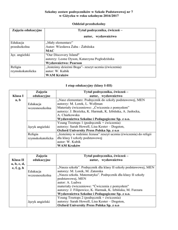 Szkolny zestaw podręczników w Szkole Podstawowej nr 7 w Giżycku w roku szkolnym 2016/2017 Oddział przedszkolny Zajęcia edukacyjne Tytuł podręcznika, ćwiczeń – autor, wydawnictwo Edukacja przedszkolna Jęz. angielski Religia rzymskokatolicka „Mały elementarz” Autor: Wiesława Żaba - Żabińska MAC "Our Discovery Island" autorzy: Leone Dyson, Katarzyna Pogłodzińska Wydawnictwo: Pearson „Jesteśmy dziećmi Boga”- zeszyt ucznia (ćwiczenia) autor: W. Kubik WAM Kraków I etap edukacyjny (klasy I-III) Klasa I a, b Zajęcia edukacyjne Edukacja wczesnoszkolna Język angielski Religia rzymskokatolicka Klasa II a, b, c, d, e, f, g, h Zajęcia edukacyjne Edukacja wczesnoszkolna Język angielski Tytuł podręcznika, ćwiczeń – autor, wydawnictwo „Nasz elementarz. Podręcznik do szkoły podstawowej, MEN autorzy: M. Lorek, L. Wollman Materiały ćwiczeniowe: „Ćwiczenia z pomysłem” autorzy: J. Brzózka, K. Harmak, K. Izbińska, A. Jasłocka, A. Charkowska Wydawnictwa Szkolne i Pedagogiczne Sp. z o.o. Young Treetops 1 (podręcznik + ćwiczenia) autorzy: Sarah Howell, Lisa Kester – Dogston, Oxford University Press Polska Sp. z o.o „Jesteśmy w rodzinie Jezusa” zeszyt ucznia (ćwiczenia) do religii dla klasy I szkoły podstawowej autor: W. Kubik WAM Kraków Tytuł podręcznika, ćwiczeń – autor, wydawnictwo „Nasza szkoła”. Podręcznik dla klasy II szkoły podstawowej, MEN autorzy: M. Lorek, M. Zatorska „Nasza szkoła. Matematyka”. Podręcznik dla klasy II szkoły podstawowej, MEN autor: A. Ludwa materiały ćwiczeniowe: "Ćwiczenia z pomysłem" autorzy: J. Filipowicz, K. Harmak, K. Izbińska, M. Furzara Wydawnictwa Szkolne i Pedagogiczne Sp. z o.o. Young Treetops 2 (podręcznik + ćwiczenia) autorzy: Sarah Howell, Lisa Kester – Dogston, Oxford University Press Polska Sp. z o.o Religia rzymskokatolicka Zajęcia edukacyjne Edukacja Klasa III wczesnoszkolna a, b, c, d, e, f, g Język angielski Religia rzymskokatolicka „Kochamy Pana Jezusa” – zeszyt ucznia do religii dla klasy II szkoły podstawowej autor: Władysław Kubik Wyd. WAM Kraków Tytuł podręcznika, ćwiczeń – Autor, wydawnictwo Nasza Szkoła - klasa 3 - część 1 a - edukacja zintegrowana Nasza Szkoła - klasa 3 - część 1 b - edukacja zintegrowana Nasza Szkoła - klasa 3 - część 1 - matematyka Nasza Szkoła - klasa 3 - część 2 - edukacja zintegrowana Nasza Szkoła - klasa 3 - część 2 - matematyka Autorzy: M. Lorek, M. Zatorska, A. Ludwa Materiały ćwiczeniowe: "Nasze ćwiczenia klasa 3" Autorzy: E. Hryszkiewicz, Małgorzata Ogrodowczyk, B. Stępień Nowa Era Young Treetops 3 (podręcznik + ćwiczenia) autorzy: Sarah Howell, Lisa Kester - Dodgson Oxford University Press Polska Sp. z o.o „Przyjmujemy Pana Jezusa” – zeszyt ucznia (ćwiczenia) do religii dla klasy III szkoły podstawowej autor: Władysław Kubik Wyd. WAM Kraków II etap edukacyjny (klasy IV - VI) Zajęcia edukacyjne Język polski Język angielski Klasa IV a, b, c, d, Matematyka e Przyroda Historia i społeczeństwo Religia rzymskokatolicka Tytuł podręcznika, ćwiczeń – autor, wydawnictwo Między nami. Podręcznik do języka polskiego dla klasy 4 szkoły podstawowej (+ ćwiczenia 1 część) autorzy: Agnieszka Łuczak, Anna Murdzek Gdańskie Wydawnictwo Oświatowe Steps Forward 1 (podręcznik + ćwiczenia) autorzy: Tim Falla, Paul A Davies, Sylvia Wheeldon, Paul Shipton, Oxford University Press Polska Sp. z o.o Matematyka z plusem. Podręcznik do klasy 4 szkoły podstawowej (+ćwiczenia 1 część) autorzy: M. Dobrowolska. M. Jucewicz, M. Karpiński Gdańskie Wydawnictwo Oświatowe Tajemnice przyrody 4. Podręcznik dla klasy 4 szkoły podstawowej ( + 1 zeszyt ćwiczeń) autorzy: Maria Marko -Worłowska, Feliks Szlajfer, Joanna Stawarz Nowa Era Spółka z o.o. Wczoraj i dziś. Podręcznik do historii i społeczeństwa dla klasy 4 szkoły podstawowej. autor: G. Wojciechowski Nowa Era Spółka z o.o. - Zajęcia techniczne „Jak to działa?”. Podręcznik do zajęć technicznych dla klasy czwartej szkoły podstawowej autorzy: Lech Łabecki, Marta Łabecka Nowa Era Spółka z o.o. Plastyka Zajęcia komputerowe Muzyka W- f - Zajęcia edukacyjne Język polski Język angielski Klasa V a, b, c, d, e Matematyka Przyroda Tytuł podręcznika, ćwiczeń – autor, wydawnictwo Między nami. Podręcznik do języka polskiego dla klasy 4 szkoły podstawowej (+ ćwiczenia 1 część) autorzy: Agnieszka Łuczak, Anna Murdzek Gdańskie Wydawnictwo Oświatowe Steps Forward 2 Podręcznik, zeszyt ćwiczeń. Autorzy: T. Falla, Paul A. Davies, P. Shipton, E. Palczak, S. Wheeldon Oxford University Press Polska Sp. z o.o. Matematyka z plusem. Podręcznik do klasy 5 szkoły podstawowej (+ ćwiczenia 1 część) Autorzy: M. Dobrowolska, M. Jucewicz, M. Karpiński, P. Zarzycki Gdańskie Wydawnictwo Oświatowe Tajemnice przyrody 5. Podręcznik dla klasy 5 szkoły podstawowej. Zeszyt ćwiczeń 1 część Autorzy: Janina Ślosarczyk, Ryszard Kozik, Feliks Szlajfer Nowa Era sp. z o.o. Wczoraj i dziś. Podręcznik do historii i społeczeństwa dla klasy V szkoły podstawowej. Autorzy: Grzegorz Wojciechowski Nowa Era Sp. z o. o. - Historia i społeczeństwo Religia rzymskokatolicka Zajęcia techniczne „Jak to działa?” Podręcznik do zajęć technicznych dla piątej szkoły podstawowej. Autor: Lech Łabecki, Marta Łabecka Nowa Era Spółka z o.o. Plastyka Zajęcia komputerowe Muzyka W- f Wych. do życia w rodzinie Zajęcia edukacyjne Język polski Klasa VI a, b, c, d, e Język angielski Matematyka Przyroda Historia i społeczeństwo Tytuł podręcznika, ćwiczeń – autor, wydawnictwo Słowa z uśmiechem. Literatura i kultura. Podręcznik. Szkoła podstawowa. Klasa 6 Słowa z uśmiechem. Nauka o języku i ortografia. Podręcznik z ćwiczeniami. Szkoła podstawowa. Klasa 6. Część 1. Słowa z uśmiechem. Nauka o języku i ortografia. Podręcznik z ćwiczeniami. Szkoła podstawowa. Klasa 6. Część 2. Autorzy: Ewa Horwath, A