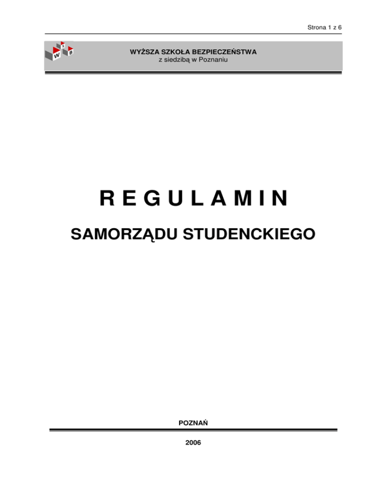 Strona 1 z 6 WYŻSZA SZKOŁA BEZPIECZEŃSTWA z siedzibą w Poznaniu REGULAMIN SAMORZĄDU STUDENCKIEGO POZNAŃ 2006 Strona 2 z 6 SPIS TREŚCI: Rozdział 1 Postanowienia ogólne................................................................................................... strona 3 Rozdział 2 Organa Samorządu Studenckiego i ich kompetencje................................................... 3 Rozdział 3 Tryb działania Zarządu Samorządu Studenckiego....................................................... 4 Rozdział 4 Wybór Zarządu Samorządu Studenckiego................................................................... 5 Rozdział 5 Postanowienia końcowe............................................................................................... 6 Strona 3 z 6 Rozdział 1 POSTANOWIENIA OGÓLNE §1 1. Studenci Wyższej Szkoły Bezpieczeństwa z siedzibą w Poznaniu tworzą Samorząd Studencki, którego organy są wyłącznym reprezentantem ogółu studentów. 2. Terenem działania Samorządu Studenckiego jest Wyższa Szkoła Bezpieczeństwa. 3. Samorząd Studencki prowadzi na terenie Uczelni działalność w zakresie spraw studenckich, w tym socjalno-bytowych i kulturalno-sportowych studentów. 4. Samorząd Studencki działa zgodnie z Ustawą z dnia 27 lipca 2005 roku Prawo o szkolnictwie wyższym (Dz. U. Nr 164, poz. 1365 z 2005 r. z późn. zm.) zwaną dalej Ustawą, Statutem Wyższej Szkoły Bezpieczeństwa, zwanym dalej Statutem oraz niniejszym Regulaminem, zwanym dalej Regulaminem. Rozdział 2 ORGANA SAMORZĄDU STUDENCKIEGO I ICH KOMPETENCJE §2 1. Organem Samorządu Studenckiego jest Zarząd Samorządu Studenckiego Wyższej Szkoły Bezpieczeństwa z siedzibą w Poznaniu. 2. Do zadań Zarządu Samorządu Studenckiego należy: a) reprezentowanie studentów wobec władz Uczelni i na zewnątrz; b) obrona spraw studenta, w szczególności w zakresie respektowania postanowień Regulaminu Studiów; c) opiniowanie planów studiów i programów nauczania; d) uczestniczenie w wypracowywaniu decyzji odnośnie rozdziału środków finansowych przeznaczonych przez Uczelnię na cele studenckie; e) uczestniczenie w ustalaniu wysokości dochodu na osobę w rodzinie studenta uprawniającej do ubiegania się o stypendium socjalne, na wyżywienie i mieszkaniowe; f) uczestniczenie w ustalaniu regulaminu wysokości przyznawania i wypłacania świadczeń pomocy materialnej dla studentów; g) proponowanie członków Komisji Stypendialnej oraz Odwoławczej Komisji Stypendialnej; h) przedstawianie Rektorowi sprawozdania z rozdziału środków finansowych nie rzadziej niż raz w roku akademickim; i) dokonywanie wyboru przedstawicieli studentów do Senatu Uczelni, Komisji Dyscyplinarnej, Odwoławczej Komisji Dyscyplinarnej i innych organów; j) rozstrzyganie sporów między studentami, jeżeli to konieczne także przez powołanie Sądu Koleżeńskiego Samorządu Studentów, który działa w oparciu o Regulamin Sądu Koleżeńskiego; Strona 4 z 6 k) wnioskowanie do Rektora o kierowanie spraw dyscyplinarnych studentów do Sądu Koleżeńskiego Samorządu Studentów. l) opiniowanie, na zasadach ustalonych w Statucie, wypełniania obowiązków dydaktycznych przez nauczycieli akademickich. 3. Każdy student może wystąpić z wnioskiem do Zarządu Samorządu Studenckiego. Na wniosek złożony na piśmie powinien otrzymać pisemną odpowiedź nie później niż po upływie 21 dni od dnia wystąpienia. 4. Każdy student ma prawo spotkania się w terminie oznaczonych dyżurów z osobami reprezentującymi Zarząd Samorządu Studenckiego, w celu uzyskania wiedzy na temat swoich praw, przedstawienia prośby o pomoc oraz w celu zaprezentowania swoich pomysłów i inicjatyw. §3 1. W skład Zarządu Samorządu Studentów wchodzi, co najmniej jeden przedstawiciel każdego kierunku i semestru studiów, nie mniej niż 5 studentów. 2. Zarząd Samorządu Studentów składa się z: a) Przewodniczącego; b) Wiceprzewodniczącego; c) Sekretarza; d) Członków. 3. Przewodniczący, Wiceprzewodniczący i Sekretarz tworzą Prezydium Zarządu. 4. Do zadań Przewodniczącego Zarządu Samorządu Studenckiego należy: a) reprezentowanie Zarządu Samorządu Studentów wobec organów Uczelni; b) zwoływanie i prowadzenie posiedzeń Zarządu; c) podpisywanie uchwał Zarządu; d) nadzór nad prowadzeniem dokumentacji pracy Zarządu. Rozdział 3 TRYB DZIAŁANIA ZARZĄDU SAMORZĄDU STUDENCKIEGO §4 1. Zarząd obraduje na posiedzeniach. 2. Posiedzenie zwyczajne zwołuje Przewodniczący Zarządu, co najmniej raz na dwa miesiące, z wyłączeniem okresów wolnych od zajęć dydaktycznych. 3. Posiedzenie nadzwyczajne zwołuje Przewodniczący Zarządu z własnej inicjatywy lub na pisemny wniosek podpisany, przez co najmniej 1/4 członków Zarządu, w ciągu 14 dni od dnia złożenia wniosku. 4. Szczegółowy porządek posiedzenia ustala Przewodniczący Zarządu i przekazuje go do wiadomości członkom Zarządu najpóźniej na trzy dni przed rozpoczęciem posiedzenia. 5. Decyzje Zarządu przedstawiane są w formie uchwał. Strona 5 z 6 6. Uchwały zapadają bezwzględną większością głosów, w obecności co najmniej połowy regulaminowego składu Zarządu Samorządu Studentów. 7. Rektor uchyla uchwały Zarządu Samorządu Studentów niezgodne z przepisami prawa, Statutem, Regulaminem Studiów i Regulaminem Samorządu. 8. Posiedzenia Zarządu są protokołowane. Rozdział 4 WYBÓR ZARZĄDU SAMORZĄDU STUDENCKIEGO §5 1. Wybory Zarządu i wybory uzupełniające do Zarządu przeprowadza powołana przez Przewodniczącego Zarządu Samorządu Studenckiego trzyosobowa Komisja Wyborcza, pracująca pod kierunkiem wybranego przez siebie przewodniczącego. 2. Komisja Wyborcza w oparciu o postanowienia niniejszego Regulaminu opracowuje harmonogram wyborów. 3. Czynne i bierne prawo wyborcze przysługuje każdemu studentowi. 4. Wybory są powszechne, równe, bezpośrednie, mogą być jawne lub tajne. 5. Wybory odbywają się na poszczególnych k