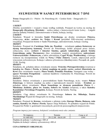SYLWESTER W SANKT PETERSBURGU 7 DNI Trasa: Daugavpils (1) – Psków - St. Petersburg (4) – Carskie Sioło – Daugavpils (1) – Kowno 1 DZIEŃ Zbiórka uczestników i wyjazd z kraju według rozkładu. Przejazd na Łotwę na nocleg do Daugavpils (Dyneburg, Dźwińsk) – stolica jednej z historycznych krain Łotwy – Łatgalii (dawne Inflanty Polskie). Zakwaterowanie w hotelu, kolacja, nocleg. 2 DZIEŃ Śniadanie. Wyjazd w kierunku Sankt Petersburga, po drodze zwiedzanie Pskowa, zobaczymy, m.in.: cerkiew św. Trójcy i Kreml (przykład XIII-wiecznej architektury rosyjskiej). Przejazd do hotelu w Sankt Petersburgu, zakwaterowanie, kolacja i nocleg. 3DZIEŃ Śniadanie. Przejazd do Carskiego Sioła (m. Puszkin) – zwiedzanie pałacu Katarzyny ze słynną bursztynową komnatą. Powrót do Petersburga, krótki przejazd przez miasto, zobaczymy, m.in.: cerkiew i klasztor Smolny, gmach Admiralicji, gmach Sztabu Generalnego, pałac Marmurowy (bez zwiedzania wnętrz), przejedziemy nabrzeżami: Uniwersyteckim i Pałacowym, a także odwiedzimy Cypel Wyspy Wasilewskiej, z którego roztacza się niezapomniany widok na Newę i Pałac Zimowy. Lunch, odpoczynek przed wieczorem sylwestrowym. Kolacja i zabawa sylwestrowa (fakultatywnie). Początek ok. godz. 22.00. Nocleg. 4DZIEŃ Śniadanie, ok. południa dalsze zwiedzanie miasta: Twierdzy Pietropawłowskiej (wnetrza) z katedrą św. Piotra i Pawła, w której znajdują się groby carów, cerkwi Zbawiciela na Krwi (bez zwiedzania wnętrz), Placu Sztuki, Pomnika Puszkina. Następnie czas wolny – spacer Newskim Prospektem – centrum handlowe i kulturalne St. Petersburga. Powrót do hotelu, kolacja, nocleg. 5DZIEŃ Śniadanie. Dalsze zwiedzanie z przewodnikiem Sankt Petersburga, m.in.: wnętrz Pałacu Zimowego, w którym znajduje się jedno z największych muzeów świata – Ermitaż, po południu dalsze zwiedzanie: Placu Senackiego ze słynnym pomnikiem Piotra I – Miedziany Jeździec, placu św. Izaaka, Soboru św. Izaaka (wnętrza), a także Katedry Kazańskiej i Newskiego Prospektu. Kolacja. Powrót do hotelu. Nocleg. 6DZIEŃ Śniadanie. Ciąg dalszy zwiedzania St. Petersburga: Soboru św. Mikołaja, Teatru Mariińskiego Wyjazd do Daugavpils na nocleg, kolacja. 7DZIEŃ Śniadanie. Przejazd do Kowna, zwiedzanie z pilotem rynku Starego Miasta, Ratusza, ruin zamku, Katedry św. Piotra i Pawła. Spacer Aleją Wolności. Po południu wyjazd do Polski. Przyjazd do Polski w godzinach wieczornych, powrót do poszczególnych miejscowości. Program imprezy jest ramowy, kolejność zwiedzania może ulec zmianie. Nr imprezy Termin 01-005-RU 29.12.08 - 04.01.09 Dopłata do pokoju 1-osobowego: 440 zł Dopłata do kolacji i zabawy sylwestrowej: 490 zł CENA IMPREZY OBEJMUJE: Cena w zł 1595 - przejazd autokarem ( klimatyzacja, barek , wc) 6 noclegów w hotelach *** w Daugavpils, Sankt Petersburgu w pokojach 2-os. z łazienkami 6 śniadań (stół szwedzki), 5 kolacji i 1 lunch (serwowane) przewodnika w Sankt Petersburgu program turystyczny opiekę pilota ubezpieczenie CENA NIE OBEJMUJE : - biletów wstępu do zwiedzanych obiektów - ok. 55 EUR - kosztu wizy do Rosji (220 zł) – obowiązkowo płatne przy zakupie wycieczki UWAGA: 24 dni przed wyjazdem należy złożyć dokumentację wizową: 1 aktualne, kolorowe zdjęcie, 1 formularz wizowy (wypełniony komputerowo) i paszport ważny co najmniej 6 miesięcy od daty wyjazdu z dwoma wolnymi obok siebie stronami. UWAGA: Istnieje możliwość przelotu samolotem PLL LOT w terminie: 30.12.2008-03.01.2009 i dołączenia do grupy autokarowej w Petersburgu (wylot: Warszawa, Międzynarodowy Port Lotniczy im. Fryderyka Chopina, zbiórka w hali odlotów przy stanowisku ORBIS-Travel o godz. 9:00, wylot 10.45, przylot do Petersburga 14.45, wylot z Petersburga 15.30, przylot do Warszawy 15.30. Dopłata do biletu lotniczego: 1555 zł/os. Szczegóły w Biurach Sprzedaży.