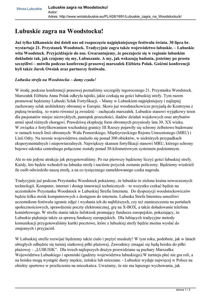 Lubuskie zagra na Woodstocku! Autor: Adres: http://www.wrotalubuskie.eu/PL/426/1691/Lubuskie_zagra_na_Woodstocku/k/ Lubuskie zagra na Woodstocku! Już tylko kilkanaście dni dzieli nas od rozpoczęcia najpiękniejszego festiwalu świata. 30 lipca br. wystartuje 21. Przystanek Woodstock. Tradycyjnie zagra także województwo lubuskie. – Lubuskie wita Woodstock. Przyjeżdżajcie do nas. Gwarantujemy, że poczujecie się w regionie lubuskim dokładnie tak, jak czujemy się my, Lubuszanie. A my, jak wskazują badania, jesteśmy po prostu szczęśliwi – mówiła podczas konferencji prasowej marszałek Elżbieta Polak. Gośćmi konferencji byli także Jurek Owsiak oraz partnerzy festiwalu. Lubuska strefa na Woodstocku – damy czadu! W środę, podczas konferencji prasowej poznaliśmy szczegóły tegorocznego 21. Przystanku Woodstock. Marszałek Elżbieta Anna Polak odkryła tajniki, jakie czekają na gości lubuskiej strefy. Tym razem promować będziemy Lubuski Szlak Fortyfikacji. - Mamy w Lubuskiem najpiękniejszy i najlepiej zachowany szlak architektury obronnej w Europie. Skoro już woodstockowicze przyjadą do Kostrzyna z piękną twierdzą, to warto również ją zwiedzić – zachęcała marszałek. Lubuskie stanowi wyjątkowy teren dla pasjonatów miejsc niezwykłych, pamiątek przeszłości, śladów działań wojskowych oraz atrybutów armii spod różnych chorągwi. Prawdziwą eksplozję form obronnych przyniosły lata 30. XX wieku. W związku z fortyfikowaniem wschodniej granicy III Rzeszy pojawiły się schrony żelbetowe budowane w ramach trzech linii obronnych: Wału Pomorskiego, Międzyrzeckiego Rejonu Umocnionego (MRU) i Linii Odry. Na terenie województwa znalazło się ponad 300 obiektów, w niektórych przypadkach eksperymentalnych i niepowtarzalnych. Największy skansen fortyfikacji stanowi MRU, którego schrony bojowe odcinka centralnego połączone zostały ponad 30-kilometrowym systemem podziemnym. Ale to nie jedyne atrakcje jak przygotowaliśmy. Po raz pierwszy będziemy liczyć gości lubuskiej strefy. Każdy, kto będzie wchodził na lubuska strefę i naciśnie przycisk zostanie policzony. Będziemy wiedzieli ile osób odwiedziło naszą strefę, a na co tysięcznego zameldowanego czeka nagroda. Tradycyjnie już podczas Przystanku Woodstock pokażemy, że lubuskie to zielona kraina nowoczesnych technologii. Komputer, internet i dostęp innowacji technicznych – to wszystko czekać będzie na uczestników Przystanku Woodstock w Lubuskiej Strefie Internetu. Do dyspozycji woodstockowiczów będzie kilka stoisk komputerowych z dostępem do internetu. Lubuska Strefa Internteu umożliwi uczestnikom festiwalu zgranie zdjęć i wysłania ich do najbliższych, czy też zamieszczenia na portalach społecznościowych, sprawdzenie poczty elektronicznej, grę na X-BOX, a także doładowanie telefonu komórkowego. W strefie stanie także Infokiosk promujący fundusze europejskie, pokazujący, że Lubuskie pięknieje także za sprawą funduszy europejskich. Dla lubiących tradycyjne metody komunikacji przygotowaliśmy kartki pocztowe, które z lubuskiej strefy będzie można wysłać do znajomych i przyjaciół. W Lubuskiej strefie rozwijać będziemy także ciało i prężyć muskuły! W tym roku, podobnie, jak w latach ubiegłych odbędzie się turniej siatkowej piłki plażowej. Zawodnicy zmagać się będą boisku do piłki plażowej – „LUBUSIK”. Dla trzech najlepszych drużyn przewidziane są puchary Marszałka Województwa Lubuskiego i upominki (gadżety województwa lubuskiego).W turnieju płeć nie gra roli, a na boisku mogą wystąpić duety męskie, żeńskie lub mieszane. - Lubuskie wydaje najwięcej w Polsce na obiekty sportowe w przeliczeniu na mieszkańca. Uważamy, że nie ma lepszego wychowania, jak strona 1 / 3 Lubuskie zagra na Woodstocku! Autor: Adres: http://www.wrotalubuskie.eu/PL/426/1691/Lubuskie_zagra_na_Woodstocku/k/ wychowanie przez sport. I tę zasadę wdrażać będziemy także na Przystanku Woodstock – tłumaczyła marszałek Elżbieta Anna Polak. Zgłoszenia na www.woodstock.lubuskie.pl Kondycja fizyczna przyda się także podczas pokonywania ekstremalnego toru przeszkód, umożliwiającego m.in. przeprowadzenie sprawdzianów sprawnościowych, który ma zachęcać do odwiedzania dużego toru zlokalizowanego na Strefie Offroadowej. Na trasie na uczestników zabawy czeka błoto, woda, ogień, bagno, przeszkody linowe, skośne i pionowe ściany, zasieki, okopy i inne atrakcje. Emocji nie zabraknie także podczas wielkiej bitwy na pomidory. W sobotę, 1 sierpnia 2015 r., w Lubuskiej Strefie, naprzeciwko siebie staną: wielbiciele pomidorów i mocnych wrażeń. Punktualnie w samo południe rozpocznie się wielka pomidorowa bitwa! Będzie czerwono, będzie gorąco, będzie się działo! Nie może Ciebie tam zabraknąć! Jest też komunikat dla wszystkich, popierających ekologię. Ważne jest to, że nie będziemy się rzucać żywnością. Pomidor jest warzywem specyficznym i niestety szybko ulega uszkodzeniom. Więc my, rzucać będziemy się pomidorami, które nie są przeznaczone do spożycia – tłumaczył Bartłomiej Kucharyk – wójt gminy Przytoczna, w której corocznie odbywa się święto pomidora i wspomniana bitwa. Lubuskie Smakuje wyjątkowo i wszyscy będą się mogli o tym przekonać. Na Lubuskiej strefie częstować będziemy pysznymi daniami przygotowanymi przez firmę Międzychód. A podczas konferencji prasowej, 31 lipca br., produktami regionalnymi nakarmimy także dziennikarzy. Najpiękniejszy festiwal, w najpiękniejszym regionie Festiwal Przystanek Woodstock po raz dwunasty odbędzie w Kostrzynie nad Odrą, a osiemnasty raz w Województwie Lubuskim. - Jesteśmy dumni, że możemy na ziemi lubuskiej gościć najpiękniejszy festiwal świata. W tym roku dofinansowujemy jego organizację kwotą 200 tys. zł – mówiła marszałek Elżbieta Anna Polak, która podczas konferencji podpisała umowę z Jurkiem Owsiakiem o wsp