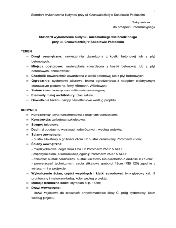 1 Standard wykończenia budynku przy ul. Grunwaldzkiej w Sokołowie Podlaskim Załącznik nr …. do prospektu informacyjnego Standard wykończenia budynku mieszkalnego wielorodzinnego przy ul. Grunwaldzkiej w Sokołowie Podlaskim TEREN • Drogi wewnętrzne: nawierzchnia utwardzona z kostki betonowej lub z płyt betonowych; • Miejsca postojowe: nawierzchnia utwardzona z kostki betonowej lub z płyt betonowych, oznakowane; • Chodniki: nawierzchnia utwardzona z kostki betonowej lub z płyt betonowych; • Ogrodzenie: systemowe ażurowe, brama ogrodzeniowa z napędem elektrycznym sterowanym pilotem np. firmy Hὃrmann, Wiśniowski; • Zieleń: trawa, krzewy oraz roślinność dekoracyjna; • Elementy małej architektury: plac zabaw; • Oświetlenie terenu: lampy oświetleniowe według projektu. BUDYNEK • Fundamenty: płyta fundamentowa z lokalnymi obniżeniami; • Konstrukcja: żelbetowa szkieletowa; • Stropy: żelbetowe; • Dach: stropodach o warstwach odwróconych, według projektu; • Ściany zewnętrzne: - pustak silikatowy o grubości 24cm lub pustak ceramiczny Porotherm 25cm; • Ściany wewnętrzne: - międzylokalowe: cegła Silka E24 lub Porotherm 25/37 5 ACU; - między lokalem, a komunikacją ogólną: Porotherm 25/37 5 ACU; - działowe: pustak ceramiczny, pustak silikatowy lub gazobeton o grubości 8 i 12cm; - pomieszczeń technicznych: cegła silikatowa grubości 12cm (REI 120) zgodnie z wytycznymi w projekcie; • Wykończenie ścian, części wspólnych i klatki schodowej: tynk gipsowy kat. III gruntowany i malowany farbą, kolor według projektu; • Izolacja termiczna ścian: styropian o gr. 16cm; • Drzwi wewnętrzne: - drzwi wejściowe do mieszkań: antywłamaniowe klasy C, próg systemowy, kolor według projektu; 2 Standard wykończenia budynku przy ul. Grunwaldzkiej w Sokołowie Podlaskim - drzwi do pomieszczeń gospodarczych i komórek lokatorskich: płytowe, kolor według projektu; - drzwi do pomieszczeń technicznych: stalowe, kolor według projektu. ELEWACJA • Tynk elewacyjny: cienko-powłokowy mineralny barwiony w masie, kolor według projektu; • Okładzina elewacyjna: np. gres, występuje na fragmentach elewacji; • Okna i drzwi balkonowe: PCV (w kolorze drewnopodobnym) z nawiewnikami, zgodnie z wytycznymi w projekcie; • Parapety zewnętrzne: blacha ocynkowana malowana proszkowo, kolor według projektu; • Drzwi zewnętrzne: - drzwi główne do budynku i drzwi do przedsionka: ślusarka aluminiowa z przeszkleniem; • Oświetlenie zewnętrzne występuje: - na balkonach oraz - w terenie, lampy terenowe według projektu. • Ogrodzenie, wydzielenie ogródków na parterze: ażurowe systemowe, według projektu; • Zawór czerpalny ogrodowy: przynależny do każdego mieszkania z ogródkiem do podlewania zieleni. BALKONY • Balustrady ażurowe: stalowe malowane proszkowo, wg projektu; • Balustrady pełne: (na ostatniej kondygnacji): otynkowane z pochwytem, według projektu; • Posadzka: gres mrozoodporny kat. 1; • Przegrody międzybalkonowe: - panel pełny w poziomie parteru, według projektu, - panel ażurowy lub pełny na pozostałych kondygnacjach. • Daszki: betonowe otynkowane lub stalowe wypełnione materiałem przeziernym. KLATKA SCHODOWA • Balustrady: ażurowe według projektu; • Posadzki korytarzy i spoczników: gres kategorii I, według projektu; • Nastopnice i podstopnice: gres kategorii I, według projektu; • Ściany: tynk gipsowy kat. III, gruntowany i malowany, kolor według projektu; 3 Standard wykończenia budynku przy ul. Grunwaldzkiej w Sokołowie Podlaskim • Sufity: tynk gipsowy kat. III, gruntowany i malowany, kolor według projektu; • Elementy dekoracyjne w holu głównym: - okładzina ścienna np. gres kat. I, tapeta, zgodnie z projektem wnętrz, - lustro. • Informacja wizualna: numeracja mieszkań; • Winda: dźwig elektryczny, wyposażenie zgodnie ze standardem producenta; • Skrzynki na listy wraz z tablicą informacyjną: według projektu wnętrz; • Osprzęt elektryczny: według projektu; • Oświetlenie klatki schodowej i korytarzy: według projektu; • Komórki lokatorskie: posadzka z płytek (gres techniczny), ściany z tynku gipsowego kat. III, gruntowane i malowane w kolorze białym. LOKALE MIESZKALNE • Drzwi wejściowe do lokali: antywłamaniowe klasy C; • Otwory na drzwi wewnętrzne: bez futryn i skrzydeł drzwiowych; • Ściany działowe: cegła silikatowa lub cegła ceramiczna o gr. 8 i 12cm; • Wykończenie ścian: tynk gipsowy kat. III gruntowany i malowany farbą emulsyjną w kolorze białym; • Wykończenie ścian w łazience / WC: tynk gipsowy kat. III zatarty na gładko; • Wykończenie sufitów we wszystkich pomieszczeniach: tynk gipsowy kat. III gruntowany i malowany farbą emulsyjną w kolorze białym; • Podłogi / posadzki: szlichta cementowa z dylatacją obwodową; • Parapety wewnętrzne: konglomerat; • Instalacja wody i kanalizacji: z tworzywa sztucznego, technologia według projektu; • Instalacja centralnego ogrzewania: z tworzywa sztucznego, rozprowadzenie podpodłogowe, podłączenie grzejników do inst. C.O. - pokoje: grzejniki płytowe z termogłowicami, - łazienka: grzejniki drabinkowe z termogłowicami. • Instalacja elektryczna: rozprowadzenie podtynkowe, osprzęt w kolorze białym, lokal wyposażony w licznik energii elektrycznej; w przedpokoju każdego lokalu znajduje się tablica rozdzielcza; - instalacja elektryczna każdego mieszkania wykonana zgodnie z projektem instalacji elektrycznej (wyposażona w punkty oświetleniowe, włączniki, gniazda, instalację 3fazową do płyty kuchennej oraz zestaw telefon, komputer, TV); • Instalacja wentylacji: mechaniczna, według projektu; • Domofon. 4 Standard wykończenia budynku przy ul. Grunwaldzkiej w Sokołowie Podlaskim POMIESZCZENIA TECHNICZNE / GOSPODARCZE • Posadzka: gres techniczny; • Ściany: glazura lub gres techniczny ułożony zgodnie z wytycznymi w projekcie; • Drzwi: stalowe/płytow
