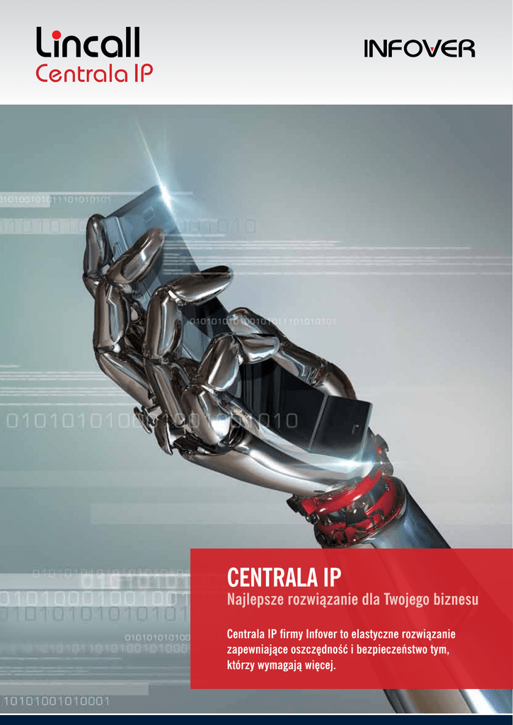 Centrala IP CENTRALA IP Najlepsze rozwiązanie dla Twojego biznesu Centrala IP firmy Infover to elastyczne rozwiązanie zapewniające oszczędność i bezpieczeństwo tym, którzy wymagają więcej. Lincall to innowacyjne rozwiązanie telekomunikacyjne autorstwa firmy Infover. Nasza platforma zapewnia optymalizację procesów biznesowych wewnątrz firmy czy instytucji, a także efektywnie usprawnia komunikację z Klientami. W skład rodziny produktów Lincall wchodzą Centrala IP, System Call Center, a także usługa Contact Center. Dodatkowo, każdy z elementów platformy może funkcjonować w modelu Cloud oraz stacjonarnie. W dzisiejszych czasach wiele firm nadal korzysta z tradycyjnych rozwiązań telefonicznych. Infover znając i rozumiejąc oczekiwania i potrzeby różnych gałęzi biznesu, stworzył kompleksowe rozwiązania telekomunikacyjne, które od wielu lat przynoszą korzyści tym, którzy nam zaufali. Nasze rozwiązanie gwarantuje Bezpieczeństwo • Przywracanie systemu do ostatniej znanej konfiguracji • Archiwizacja nagrań • Reset systemu do ustawień fabrycznych • Replikacja bazy danych • Przechowywanie danych od momentu uruchomienia systemu oszczędności • Jedna licencja na system • Łatwa rozbudowa sprzętu • Możliwość podłączenia dowolnej ilości telefonów • Wirtualizacja • Niższe rachunki Elastyczność • Budowa modułowa • Niezależność od producenta sprzętu • Różne scenariusze wdrożenia • Możliwość rozbudowy • Przyjazne narzędzia administracyjne • Brak limitów • Integracja z innymi systemami TECHNOLOGIA W systemie telefonicznym autorstwa Infover zaimplementowane zostały wszystkie funkcje standardowej centrali telefonicznej. Dodatkowo wiele z nich zostało rozszerzonych, dzięki czemu system daje użytkownikom większe możliwości niż tradycyjne rozwiązania. Oprogramowanie wspiera rozproszoną topologię systemu telekomunikacyjnego, zarządzanego jako jeden logiczny system. Posiada pojemność do kilkunastu tysięcy abonentów. Jest kompleksowym rozwiązaniem usprawniającym komunikację i obsługę Kontrahentów. Oferowana przez naszą firmę Centrala IP nie posiada sztucznych ograniczeń, które występują w rozwiązaniach sprzętowych. Zapraszamy do kontaktu. Zespół naszych inżynierów jest gotowy do realizacji projektu dla Państwa firmy lub instytucji. O FIRMIE Od ponad 20 lat projektujemy i wdrażamy systemy informatyczne kierując się indywidualnymi potrzebami naszych Klientów. Specjalizujemy się w systemach dedykowanych. Tworzymy oprogramowanie, integrujemy systemy informatyczne, dostarczamy sprzęt IT. Oferujemy rozwiązania o szerokim spektrum biznesowym w szczególności w dziedzinie dystrybucji, logistyki, planowania, handlu, branży budowlanej i surowców mineralnych. Istotnym elementem działania firmy jest budowa dedykowanych rozwiązań służących do obsługi e-biznesu. Wysoką pozycję wśród największych w Polsce dostawców rozwiązań i usług informatycznych zawdzięczamy doświadczeniu i zaangażowaniu zespołu posługującego się ujednoliconą metodyką. Nasze osiągnięcia zostają doceniane nie tylko wśród Klientów, ale także specjalistów. Świadczą o tym przyznane firmie wyróżnienia (Gazele Biznesu czy Diamenty Forbesa), w tym miejsce w pierwszej sześćdziesiątce największych firm teleinformatycznych rankingu prestiżowego magazynu „Computerworld”. Zatrudniamy ponad 200 wykwalifikowanych architektów systemowych, inżynierów i specjalistów. Zrealizowaliśmy kompleksowo kilkaset projektów. Z naszych doświadczeń korzystają przedsiębiorstwa będące liderami w swoich branżach. Stale rozwijamy i udoskonalamy nasze systemy dostosowując je do zachodzących zmian i rozwoju rynku. Jesteśmy gotowi zaangażować się w realizację projektu dla Państwa. Zaufali nam Inteligentne rozwiązania infover.pl Dział Sprzedaży Lincall tel.: +48 41 310 68 94, +48 41 367 85 03 fax: +48 41 345 15 65 e-mail: [email protected]