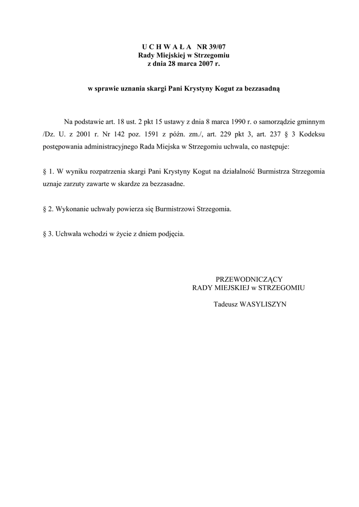 U C H W A Ł A NR 39/07 Rady Miejskiej w Strzegomiu z dnia 28 marca 2007 r. w sprawie uznania skargi Pani Krystyny Kogut za bezzasadną Na podstawie art. 18 ust. 2 pkt 15 ustawy z dnia 8 marca 1990 r. o samorządzie gminnym /Dz. U. z 2001 r. Nr 142 poz. 1591 z późn. zm./, art. 229 pkt 3, art. 237 § 3 Kodeksu postępowania administracyjnego Rada Miejska w Strzegomiu uchwala, co następuje: § 1. W wyniku rozpatrzenia skargi Pani Krystyny Kogut na działalność Burmistrza Strzegomia uznaje zarzuty zawarte w skardze za bezzasadne. § 2. Wykonanie uchwały powierza się Burmistrzowi Strzegomia. § 3. Uchwała wchodzi w życie z dniem podjęcia. PRZEWODNICZĄCY RADY MIEJSKIEJ w STRZEGOMIU Tadeusz WASYLISZYN UZASADNIENIE do Uchwały Nr 39/07 Rady Miejskiej w Strzegomiu z dnia 28 marca 2007 r. w sprawie uznania skargi Pani Krystyny Kogut za bezzasadną Pani Krystyna Kogut zam. Kostrza ul. Kościuszki 51 pismem z dnia 8.01.2007 r. złożyła do tut. Rady skargę. Według skarżącej zarzuty przytoczone w skardze pod adresem Burmistrza Strzegomia dotyczą bezczynności Burmistrza w sprawie wydania gruntu stanowiącego część działki Nr 97 położonej w Kostrzy. Przedmiotowa skarga stosownie do § 37 ust. 1 Statutu Gminy Strzegom oraz Regulaminu Pracy Komisji Rewizyjnej została rozpatrzona przez Komisję. Po wnikliwej analizie treści skargi i wysłuchaniu wyjaśnień udzielonych przez pracownika Wydziału Nieruchomości i Zagospodarowania tut. Urzędu, jak również pisemnym wyjaśnieniu Komisja stwierdza, że skarga jest bezzasadna. Według decyzji z dnia 25 października 1993 roku znak GG.6011-2.S.3/93, Kierownik Urzędu Rejonowego Rządowej Administracji Ogólnej w Świdnicy zatwierdził ustalone w wyniku przeprowadzonego postępowania rozgraniczeniowego granice działki nr 97 oraz działek przyległych, w tym nieruchomości wnioskodawczyni. Z uzasadnienia decyzji wynika, iż zainteresowane strony uznały i przyjęły ustalony przez geodetę przebieg granic drogi, co potwierdziły własnoręcznymi podpisami złożonymi na protokóle granicznym sporządzonym w dniu 21 października 1993 roku. Żaden z właścicieli nieruchomości przyległych do drogi gminnej nie zakwestionował przebiegu granic i nie zażądał przekazania sprawy do sądu. Tutejszy organ posiadając ostateczną decyzję zatwierdzającą ustalone granice działki nr 97 przyjął przebieg granic zgodnie z tą decyzją, tak jak uczestnicy tego postępowania. Pani Krystyna Kogut wnioskiem z dnia 18.07.2003 r. wystąpiła do Sądu Rejonowego w Świdnicy I Wydział Cywilny o stwierdzenie zasiedzenia własności nieruchomości stanowiącej część działki nr 97 – drogi gminnej w obszarze 34 m2 położonej we wsi Kostrza przylegającej do jej posesji. Postanowieniem z dnia 28 kwietnia 2005 roku sygn. akt I Ns 549/03 Sąd Rejonowy w Świdnicy I Wydział Cywilny oddalił wniosek Pani Krystyny Kogut o stwierdzenie zasiedzenia przedmiotowej nieruchomości tj. części drogi – działki nr 97. W uzasadnieniu postanowienia Sąd uznał, że wniosek ten jest całkowicie bezprzedmiotowy. Wnioskodawczyni, jako właścicielka działki nr 73, w skład której wchodzą sporne powierzchnie 8 m2 i 26 m2 nie może domagać się ich zasiedzenia, skoro jest ich właścicielką wpisaną w księdze wieczystej nr 5864. Sąd stwierdził, że wyjaśnienia wymaga kwestia prawidłowego przebiegu granic działek nr nr 73 i 97, a gdyby okazało się, że działki nr nr 73 lub 75 /stanowiące własność wnioskodawczyni/ zostały pomniejszone na rzecz działki nr 97, to do rozważenia między stronami pozostają m.in. kwestie odszkodowawcze. Pomimo takiego uzasadnienia postanowienia Sądu, pismem z dnia 23.05.2005 r. Pani Kogut wystąpiła do Burmistrza Strzegomia z wezwaniem do wydania nieruchomości. W odpowiedzi, pismem z dnia 6.06.2005 r. Burmistrz poinformował Panią Krystynę Kogut, że nie ma możliwości wydania części działki nr 97 faktycznie o pow. 26 m2, ponieważ stanowi ona drogę, która służy komunikacji lokalnej społeczności wsi zamieszkującej przy ul. T. Kościuszki w Kostrzy. Burmistrz Strzegomia jeszcze raz powołał się na decyzję Nr GG.6011-2.S.3/93 z dnia 25.10.1993 roku Kierownika Urzędu Rejonowego Rządowej Administracji Ogólnej w Świdnicy i podkreślił, że właściciel nieruchomości przyległej do drogi gminnej nie zakwestionował przebiegu granic, tym samym uznał granice drogi jako obowiązujące oraz działek sąsiednich. W związku z powyższym, biorąc pod uwagę możliwość ugodowego zakończenia sprawy poprzez ewentualne wypłacenie odszkodowania oraz fakt, że gmina nie włada fizycznie nieruchomością, gdyż jest to droga, brak jest możliwości zadośćuczynienia kierowanym wezwaniom do wydania gruntu. Należy ponadto podkreślić, że tzw. bezczynność organu występuje jedynie na gruncie postępowania administracyjnego, które powinno zakończyć się wydaniem decyzji administracyjnej w określonym przepisami K.p.a. terminie, a nie na gruncie prawa cywilnego, do której to kategorii należała sprawa Pani Krystyny Kogut. Wobec powyższego brak jest podstaw do uznania skargi za uzasadnioną. Zawiadomienie skarżącego o sposobie załatwienia skargi wymaga podjęcia uchwały przez Radę Miejską, ponieważ zgodnie z art. 14 ust. 1 ustawy o samorządzie gminnym z 1990 r. /Dz. U. z 2001 r. Nr 142 poz. 1591 z późn. zm./ organy gminy podejmują uchwały.