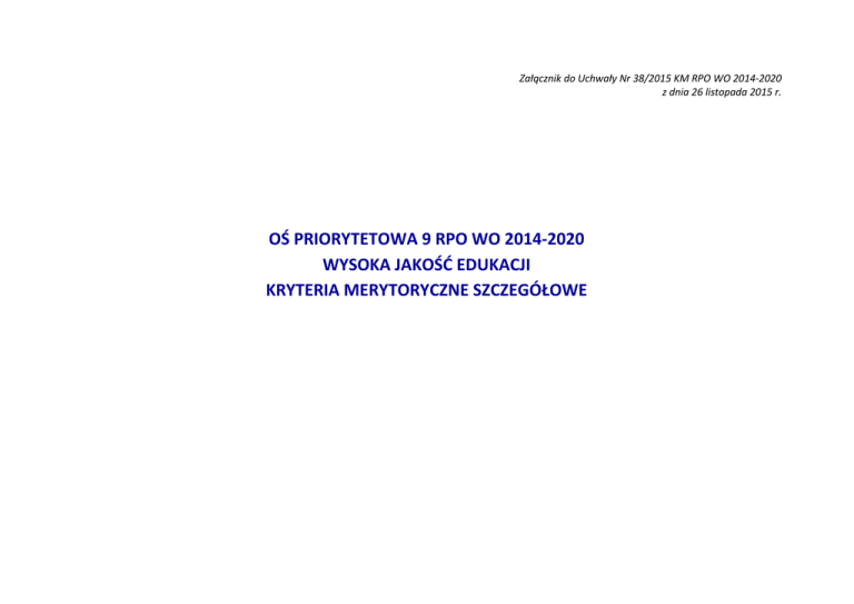 Załącznik do Uchwały Nr 38/2015 KM RPO WO 2014-2020 z dnia 26 listopada 2015 r. OŚ PRIORYTETOWA 9 RPO WO 2014-2020 WYSOKA JAKOŚĆ EDUKACJI KRYTERIA MERYTORYCZNE SZCZEGÓŁOWE Oś priorytetowa IX Wysoka jakość edukacji Działanie 9.1 Rozwój edukacji Poddziałanie 9.1.3 Wsparcie edukacji przedszkolnej Kryteria merytoryczne szczegółowe (TAK/NIE) LP Nazwa kryterium Źródło informacji 1 2 3 Charakter kryterium W/B 4 1. Trwałość nowopowstałych miejsc wychowania przedszkolnego (jeśli dotyczy) Wniosek o dofinansowanie Bezwzględny 2. Okres finansowania działań realizowanych w ramach projektu Wniosek o dofinansowanie Bezwzględny Wniosek o dofinansowanie Bezwzględny Wniosek o dofinansowanie Bezwzględny 3. Mechanizm przeciwdziałania ryzyku podwójnego finansowania (jeśli dotyczy) 4. Indywidualna analiza potrzeb ośrodków wychowania przedszkolnego 5. Analiza potrzeb dzieci w wieku przedszkolnym Wniosek o dofinansowanie Bezwzględny 6. Indywidualna diagnoza stopnia przygotowania nauczycieli ośrodków wychowania przedszkolnego do pracy z dziećmi w wieku przedszkolnym Wniosek o dofinansowanie Bezwzględny Definicja 5 Projekty będą finansowane wyłącznie, jeżeli zostanie zagwarantowana trwałość inwestycji przez okres co najmniej 2 lat od daty zakończenia realizacji projektu. Trwałość powinna być rozumiana jako instytucjonalna gotowość ośrodków wychowania przedszkolnego (OWP) do świadczenia usług przedszkolnych w ramach utworzonych w projekcie miejsc wychowania przedszkolnego. Wnioskodawca zobowiązany jest do zamieszczenia we wniosku o dofinansowanie w sekcji V pkt 5.1 Zakres rzeczowy deklaracji dotyczącej utrzymania ośrodka wychowania przedszkolnego przez okres co najmniej 2 lat licząc od daty zakończenia realizacji projektu. Finansowanie działalności bieżącej nowoutworzonych miejsc wychowania przedszkolnego w ramach EFS możliwe jest przez okres nie dłuższy niż 12 miesięcy. Finansowanie realizacji dodatkowych zajęć w OWP oraz doskonalenie umiejętności i kompetencji zawodowych nauczycieli OWP możliwe jest przez okres nie dłuższy niż 24 miesiące. Korzystanie z finansowania działalności bieżącej nowoutworzonych miejsc wychowania przedszkolnego skutkuje koniecznością złożenia przez organ prowadzący OWP zobowiązania do nieuwzględniania w przekazywanych (organowi dotującemu) comiesięcznie sprawozdaniach liczby dzieci korzystających z nowoutworzonych w ramach EFS miejsc wychowania przedszkolnego. Wnioskodawca zobowiązany jest do zamieszczenia we wniosku o dofinansowanie w sekcji V pkt 5.1 Zakres rzeczowy powyższej informacji. Weryfikuje się czy realizacja wsparcia dokonywana jest na podstawie indywidualnie zdiagnozowanego zapotrzebowania ośrodków wychowania przedszkolnego w zakresie zaplanowanego do realizacji wsparcia. Diagnoza powinna być przygotowana i przeprowadzona przez ośrodki wychowania przedszkolnego oraz zatwierdzona przez organ prowadzący. Przez organ prowadzący rozumie się jednostkę samorządu terytorialnego, inną osobę prawną lub fizyczną odpowiedzialną za działalność ośrodka wychowania przedszkolnego. Wnioskodawca zobowiązany jest do zamieszczenia we wniosku o dofinansowanie projektu w pkt 3.5 Opis grupy docelowej i uzasadnienie wyboru informacji, że diagnoza została zatwierdzona przez organ prowadzący. Podmiot przeprowadzający diagnozę może skorzystać ze wsparcia instytucji systemu wspomagania pracy OWP tj. placówki doskonalenia nauczycieli, poradni psychologiczno-pedagogicznej lub biblioteki pedagogicznej. Działania realizowane w ramach projektów muszą uwzględniać indywidualne potrzeby rozwojowe i edukacyjne oraz możliwości psychofizyczne dzieci objętych wsparciem, poparte diagnozą przedstawioną we wniosku o dofinansowanie projektu. Wnioskodawca zobowiązany jest do zamieszczenia we wniosku o dofinansowanie w sekcji V pkt 5.1 Zakres rzeczowy stosownej informacji. Realizacja projektu w zakresie doskonalenia umiejętności i kompetencji zawodowych nauczycieli OWP powinna każdorazowo zostać poprzedzona diagnozą stopnia przygotowania ww. grupy docelowej do pracy z dziećmi w wieku przedszkolnym, w tym z dziećmi ze specjalnymi potrzebami edukacyjnymi oraz analizą zapotrzebowania OWP na 7. 8. Ograniczenie terytorialne realizacji projektu Realizacja dodatkowych zajęć w ramach projektu stanowi uzupełnienie działań prowadzonych przed rozpoczęciem realizacji projektu Wniosek o dofinansowanie Bezwzględny Wniosek o dofinansowanie Bezwzględny określone kompetencje i kwalifikacje. . Wnioskodawca zobowiązany jest do zamieszczenia we wniosku o dofinansowanie projektu w pkt 3.5 Opis grupy docelowej i uzasadnienie wyboru stosownej deklaracji. Podmiot przeprowadzający diagnozę może skorzystać ze wsparcia instytucji wspomagających OWP, tj. z uwzględnieniem narzędzi i metodologii opracowanych przez MEN i jednostki podległe lub nadzorowane. Ze wsparcia wyłączone(-i) są: - ośrodki wychowania przedszkolnego z terenu Aglomeracji Opolskiej, - dzieci w wieku przedszkolnym wyżej wymienionych ośrodków wychowania przedszkolnego i ich rodzice/opiekunowie, - nauczyciele wyżej wymienionych ośrodków wychowania przedszkolnego z terenu Aglomeracji Opolskiej. Dodatkowe zajęcia mogą być realizowane w OWP, w których w takim samym zakresie nie były one finansowane od co najmniej 12 miesięcy poprzedzających dzień złożenia wniosku o dofinansowanie na konkurs. Skala działań prowadzonych przed rozpoczęciem realizacji projektu przez OWP (nakłady środków na ich realizację) nie może ulec zmniejszeniu w stosunku do skali działań(nakładów) prowadzonych przez OWP w okresie 12 miesięcy poprzedzających rozpoczęcie realizacji projektu (średniomiesięcznie). Wnioskodawca zobowiązany jest do zamieszczenia we wniosku o dofinansowanie projektu w sekcji V pkt 5.1 Zakres rzeczowy stosownej deklaracji. Kryteria merytoryczne szczegółowe (punktowane) LP Nazwa kryterium Źród