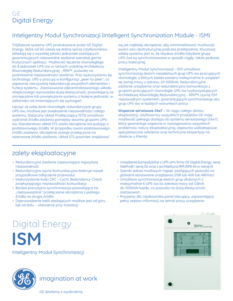 GE Digital Energy Inteligentny Moduł Synchronizacji (Intelligent Synchronization Module - ISM) Trójfazowe systemy UPS produkowane przez GE Digital Energy, które od lat cieszą się dobrą opinią Użytkowników, składają się z wysokiej jakości jednostek zasilających, gwarantujących niezawodne zasilanie szerokiej gamie krytycznych aplikacji. Możliwość łączenia równoległego do 8 jednostek UPS-ów w ramach unikalnej Architektury Równoległej Redundancyjnej - RPA™, pozwala na podniesienie niezawodności zasilania. Przy wykorzystaniu tej technologii, UPS-y pracują w konfiguracji „peer-to-peer”, co zapewnia rzeczywistą redundancję wszystkich elementów i funkcji systemu. Zastosowanie zdecentralizowanego układu obejściowego wprowadza dużą elastyczność, pozwalającą na zmniejszanie lub powiększanie systemu o kolejne jednostki, w zależności od zmieniających się wymagań. Łącząc ze sobą dwie równoległe redundancyjne grupy UPS-ów, możliwe jest zwiększenie niezawodności całego systemu. Statyczny Układ Przełączający (STS) umożliwia wybranie źródła zasilania pomiędzy dwoma grupami UPSów. Standardowo układ STS zasila obciążenie korzystając z podstawowego źródła. W przypadku awarii podstawowego źródła zasilania, obciążenie zostaje przełączone na rezerwowe źródło zasilania. Układ STS powinien znajdować się jak najbliżej obciążenia, aby zminimalizować możliwość awarii sieci dystrybucyjnej podczas przełączenia. Kluczową zaletą systemu jest to, że obydwa źródła (obydwie grupy UPS-ów) są synchronizowane w sposób ciągły, także podczas pracy bateryjnej. Inteligentny Moduł Synchronizacji - ISM umożliwia synchronizację dwóch niezależnych grup UPS-ów pracujących równolegle, z których każda zawiera maksymalnie 6 urządzeń tej samej mocy z zakresu 10-500kVA. Redundancyjne zasilanie urządzenia oraz redundancyjna komunikacja z grupami pracujących równolegle UPS-ów (wykorzystujących Architekturę Równoległą Redundancyjną - RPA™) czynią ISM niezawodnym systemem, gwarantującym synchronizację obu grup UPS-ów w każdych warunkach pracy. Wsparcie serwisowe 24x7 – W ciągu całego okresu eksploatacji, Użytkownicy wszystkich produktów GE mają możliwość pełnego dostępu do systemu serwisowego (24x7), który gwarantuje wsparcie w rozwiązywaniu wszystkich problemów natury eksploatacyjnej, zapewnia wieloetapowe specjalistyczne szkolenia oraz techniczne ekspertyzy na obiekcie u Klienta. zalety eksploatacyjne • Redundancyjne zasilanie zapewniające najwyższą niezawodność • Redundancyjna szyna komunikacyjna (toleruje nawet przypadkowe odłączenie przewodu) • Wykorzystanie kodu CRC - Cyclic Redundancy Check, zwiększającego niezawodność komunikacji • Bardzo precyzyjna synchronizacja pozwalająca na „niezauważalne” przełączenie obciążenia z jednego źródła na drugie źródło • Doprowadzenie kabli zasilających możliwe jest od góry lub od dołu – ułatwienie przy instalacji Digital Energy ISM Inteligentny Moduł Synchronizacji imagination at work GE działamy z wyobraźnią • Urządzenie kompatybilne z UPS-ami firmy GE Digital Energy: serią SitePro® i serią SG oraz z architekturą RPA (RPA kit w wersji E) • Szeroki zakres możliwych napięć zasilających pozwala na globalne stosowanie urządzenia (208 lub 400 lub 480Vac) • Umożliwia synchronizację dwóch grup złożonych z maksymalnie 6 UPS-ów (w zakresie mocy od 10kVA do 500kVA) każda, co pozwala na dużą elastyczność zastosowań • Przyjazny dla Użytkownika panel sterujący, zapewniający pełny zestaw informacji na temat pracy urządzenia ISM - przykład zastosowania grupa A i grupa B są cały czas ze sobą zsynchronizowane, tak więc statyczny układ przełączający może w każdej chwili przełączyć obciążenie z grupy A na grupę B, bądź vice versa zasilanie A zasilanie B ISM grupa A grupa B UPS nr 1 A UPS nr 2 A UPS nr 1 B redundancyjne szyny komunikacyjne UPS nr 2 B statyczny układ przełączający (STS) odbiory krytyczne parametry techniczne topologia : synchronizacja dwóch grup UPS-ów, każda złożona z maksymalnie 6 jednostek technologia: DSP (Digital Signal Processor) Inteligentny Moduł Synchronizacji - ISM Kompatybilność Napięcie wejściowe (zasilające) UPS-y SitePro (tylko seria S6) oraz UPS-y serii SG * 208 / 400 / 480 Vac 50/60 Hz Zużycie mocy 25 W Waga 20 kg Poziom głośności < 35 db(A) do montażu na ścianie Obudowa Stopień ochrony IP 20 RAL 9010, biały Kolor Wymiary (wys. x szer. x głęb.) Temperatura pracy Normy bezpieczeństwa 584x350x190 mm 0 - 40 °C EN 50091-1, IEC 62040-1, IEC 60950 EN 50091-2 / FCC klasa A EMC Parametry systemu Maks. przesunięcie fazowe między grupami Liczba UPS-ów w jednej grupie (2 grupy) Dodatkowe wyposażenie standardowego UPS-a Odległości pomiędzy UPS-ami < 0.2 stopnia maks. 6 wszystkie UPS-y muszą być wyposażone w zestaw do pracy równoległej RPA * maks. 85m pomiędzy pierwszą, a ostatnią jednostką systemu * tylko, jeśli wyposażone są w zestawy do pracy równoległej – RPA kit, w wersji E Zawarte w karcie katalogowej opisy i parametry mogą zostać zmienione bez wcześniejszego zawiadomienia produkty dostępne u lokalnego przedstawiciela GE: GE Consumer & Industrial SA Via Cantonale 50 6595 Riazzino (Locarno) Switzerland T +41 (0) 91 850 51 51 F +41 (0) 91 850 52 52 imagination at work E [email protected] www.GEDigitalEnergy.com © General Electric Company, USA Wszelkie prawa zastrzeżone (07/2010) Kopiowanie dokumentu wymaga pisemnej zgody GE Polska GEA-D 1017 PL