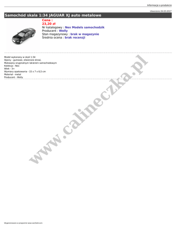 Informacje o produkcie Utworzono 04-03-2017 Samochód skala 1:34 JAGUAR XJ auto metalowe Cena : 23,20 zł Nr katalogowy : Nex Models samochodzik Producent : Welly Stan magazynowy : brak w magazynie Średnia ocena : brak recenzji w w w .c al in ec zk a. pl Model wykonany w skali 1:34 Opony - gumowe, otwierane drzwi, Malowany oryginalnym lakierem samochodowym Kolekcja - Nex Wiek - 3+ Wymiary opakowania - 15 x 7 x 6,5 cm Materiał - metal Producent - Welly Wygenerowano w programie www.oscGold.com