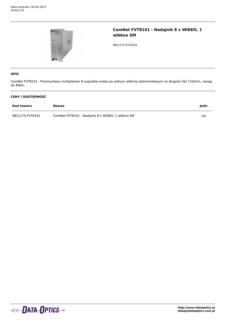 Data wydruku: 04-03-2017 strona 1/1 ComNet FVT81S1 - Nadajnik 8 x WIDEO, 1 włókno SM 0811175-FVT81S1 OPIS ComNet FVT81S1 - Przemysłowy multiplekser 8 sygnałów wideo po jednym włóknie jednomodowym na długości fali 1310nm, zasięg do 48km. CENY I DOSTĘPNOŚĆ Kod towaru Nazwa 0811175-FVT81S1 ComNet FVT81S1 - Nadajnik 8 x WIDEO, 1 włókno SM Jedn. szt. http://www.dataoptics.pl [email protected] Powered by TCPDF (www.tcpdf.org)